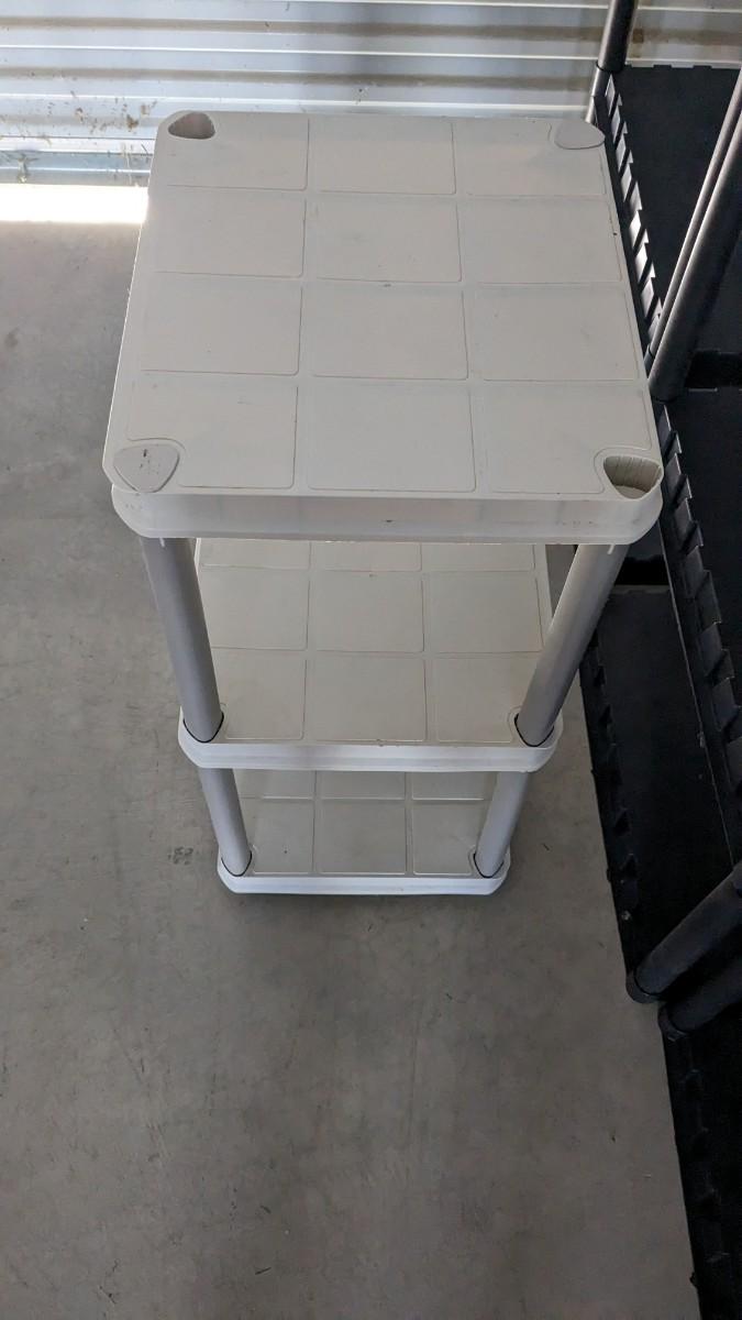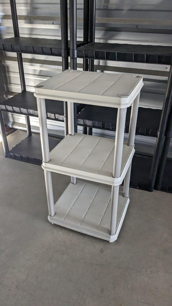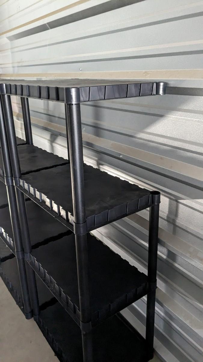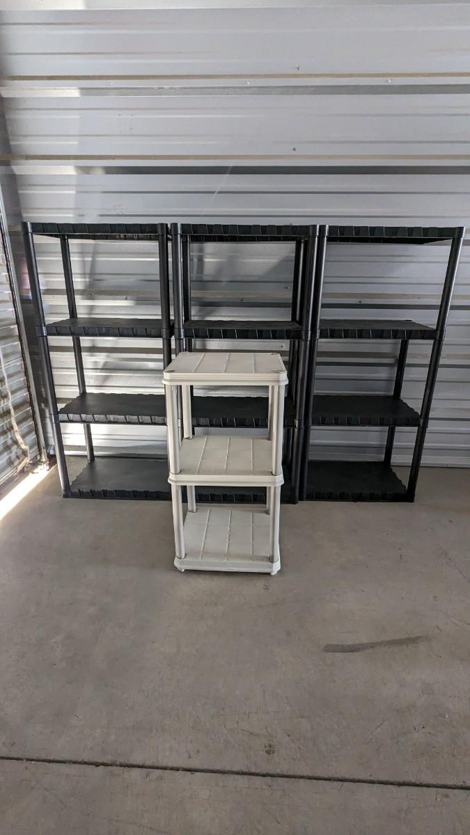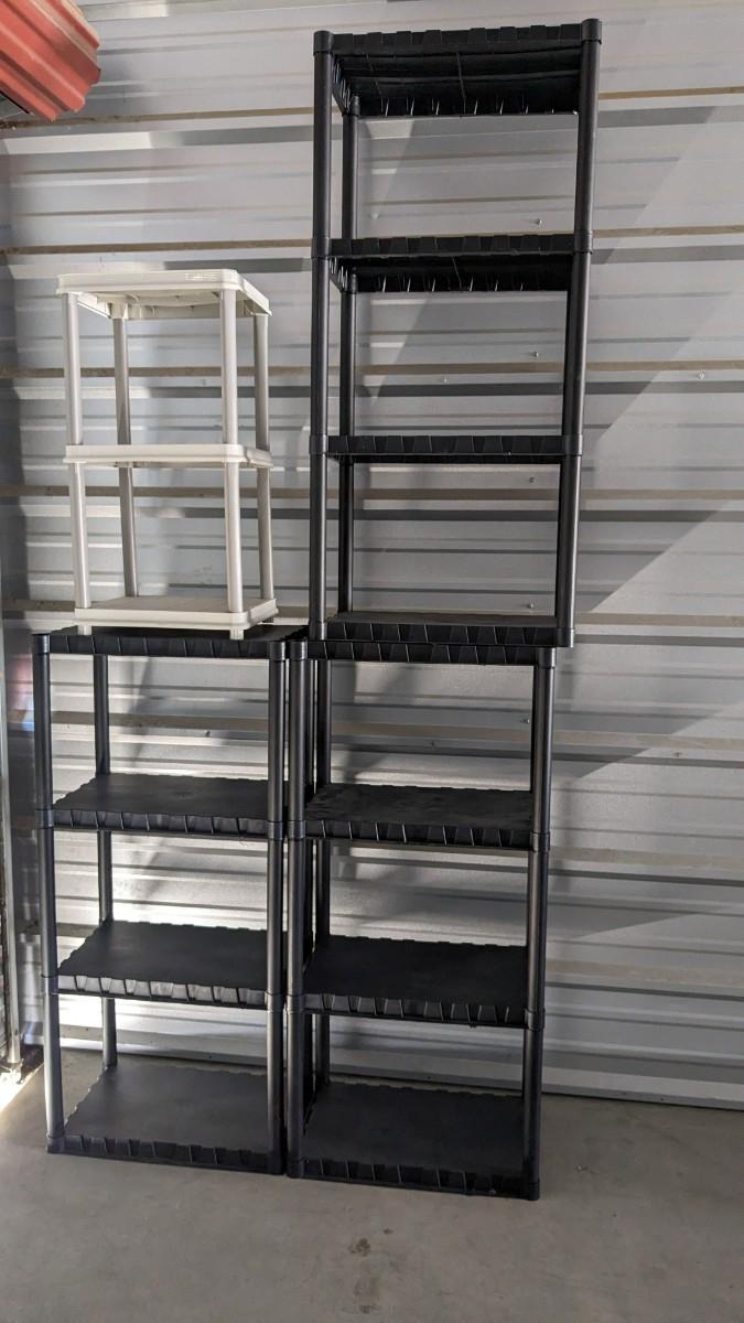 3 black/charcoal units measuring 23"x 15"x 49". These pieces can be married to make taller. Note one shelf is missing 1 arm in photos, this piece was found after original cataloging. Also includes 16"x14"x30.75". No cracks noted to shelves or other flaws. No shipping. 2616