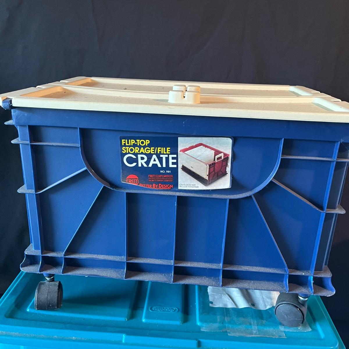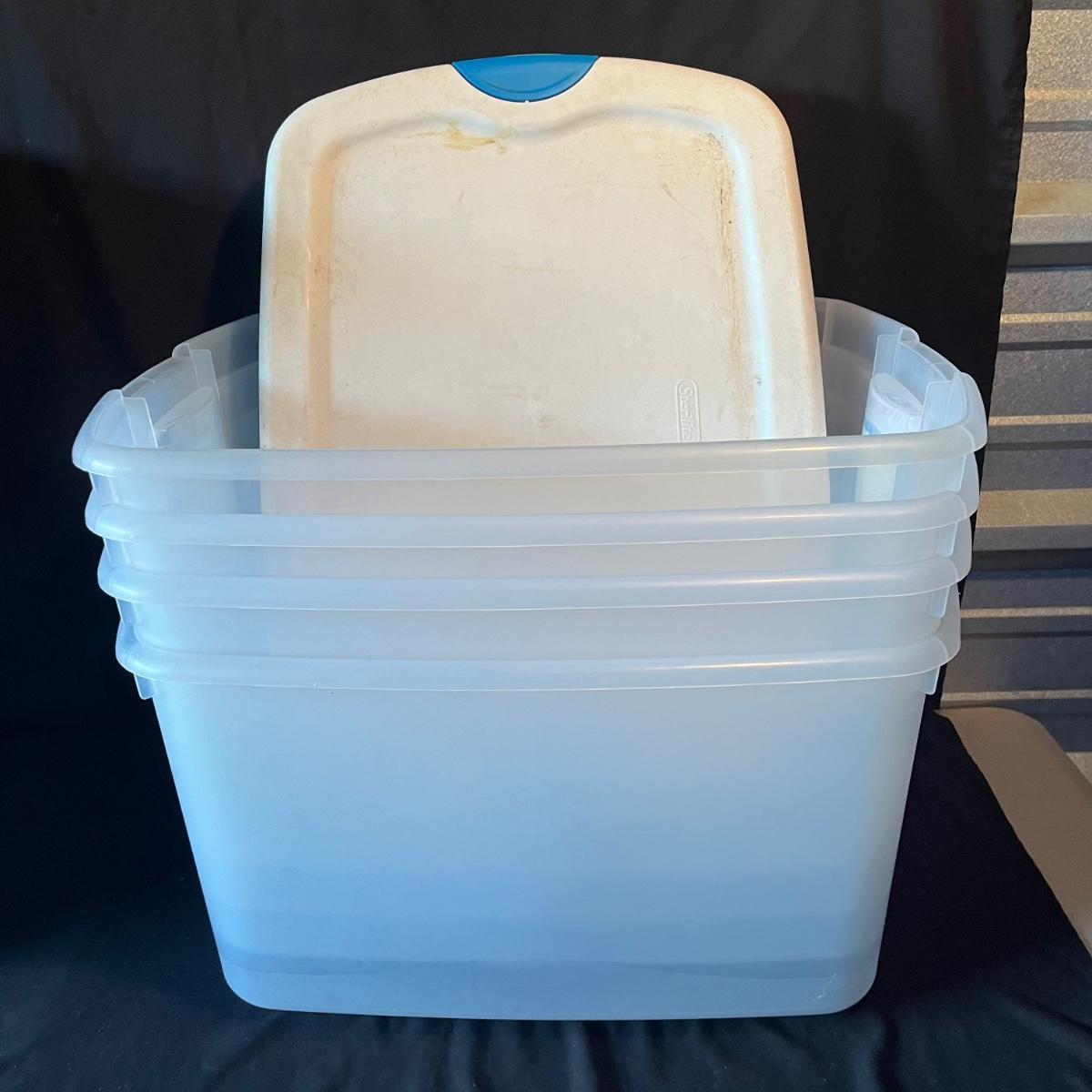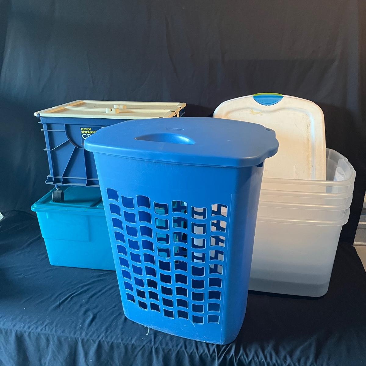 Lot includes four Sterilite 66 quart totes with lids, one blue Sterilite 56 quart tote with lid, flip top storage file crate with wheels and a Rubbermaid hamper that measures 14” x 20” x 24”.