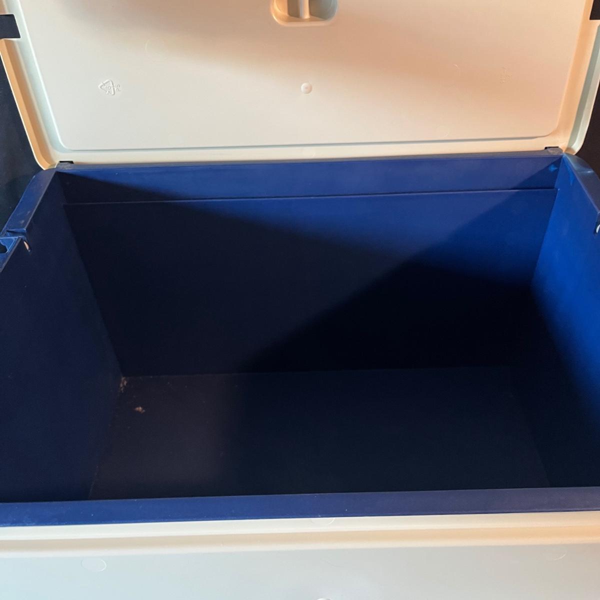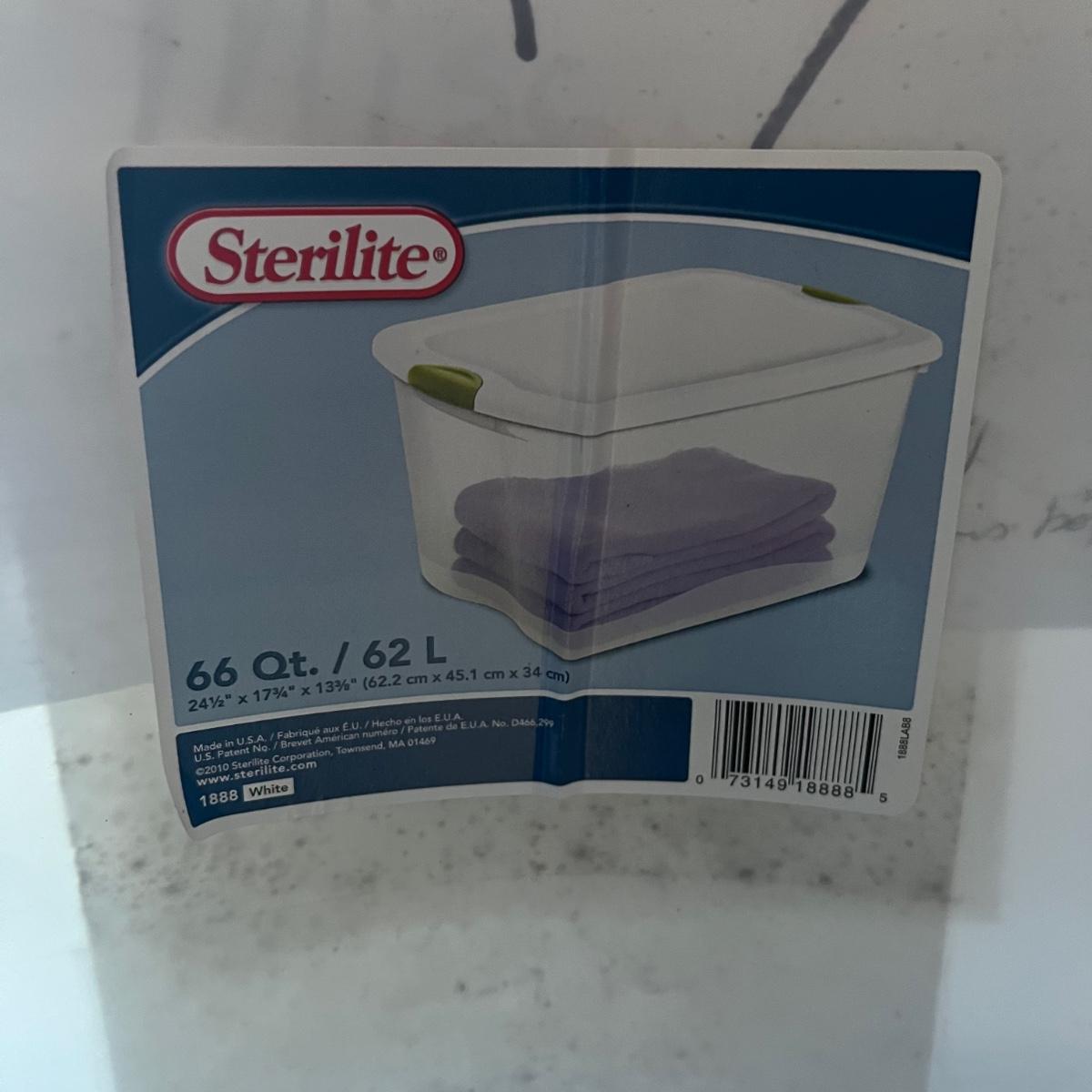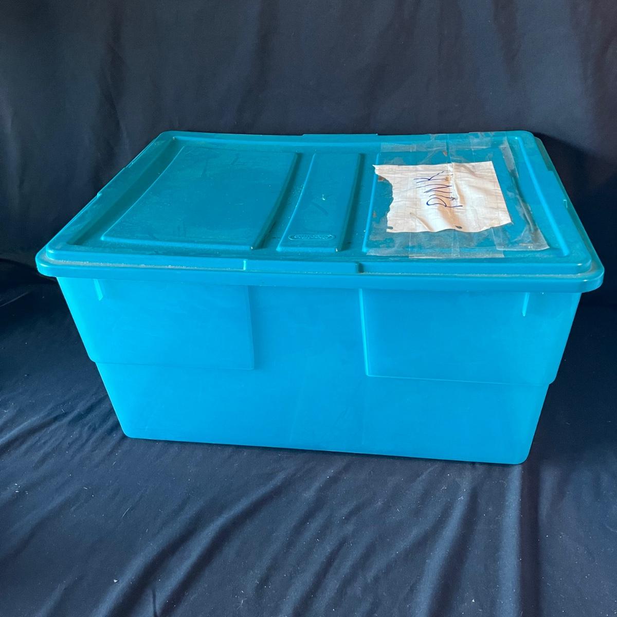 Lot includes four Sterilite 66 quart totes with lids, one blue Sterilite 56 quart tote with lid, flip top storage file crate with wheels and a Rubbermaid hamper that measures 14” x 20” x 24”.