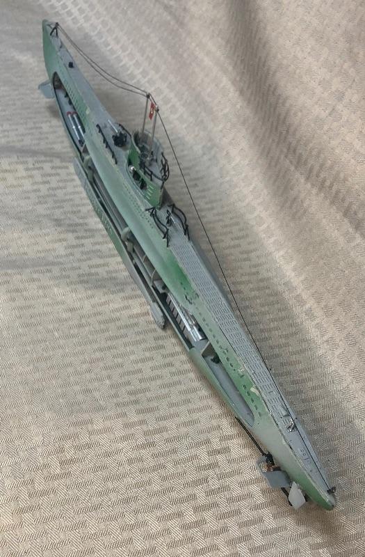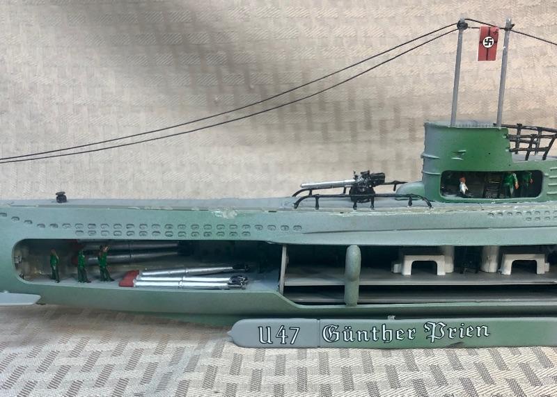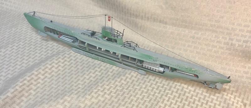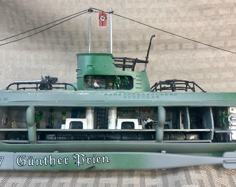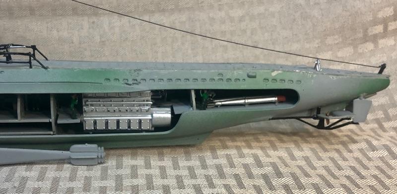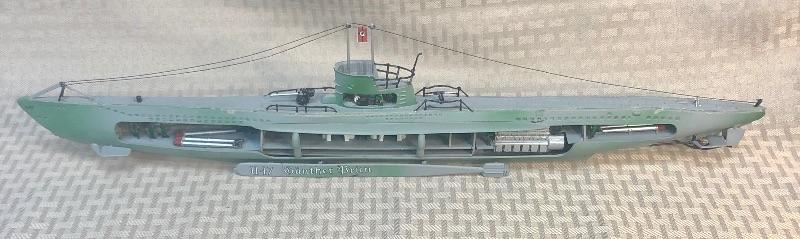 Plastic model of German WWII submarine. Cut away on one side to show interior details.