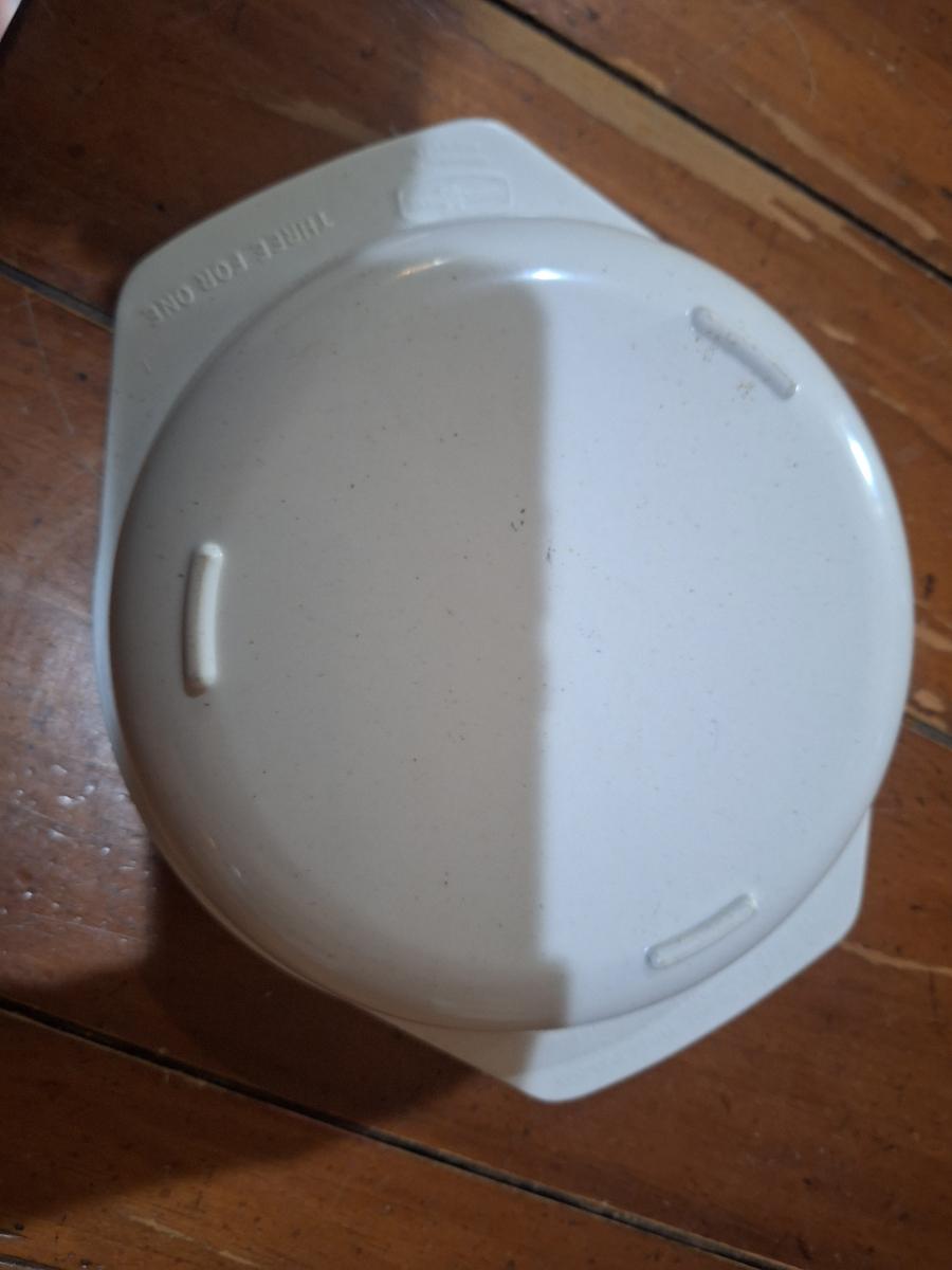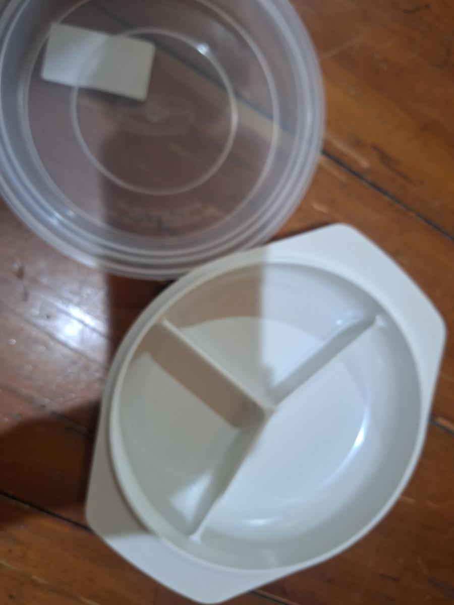 plastic, three-compartment food storage container with a lid. Microwave safe