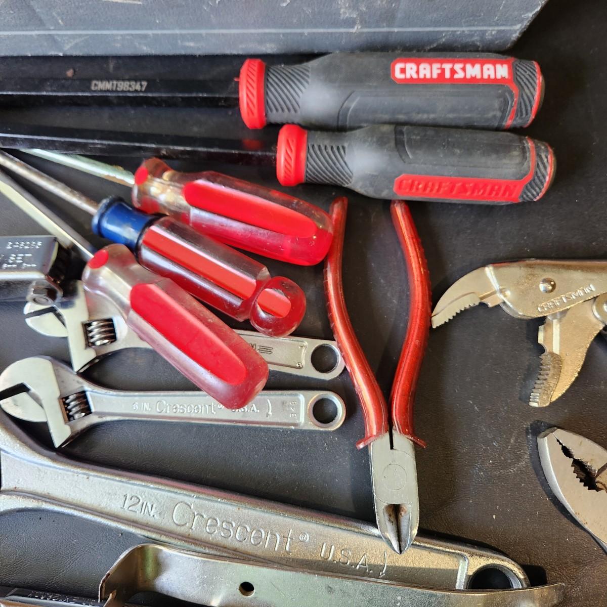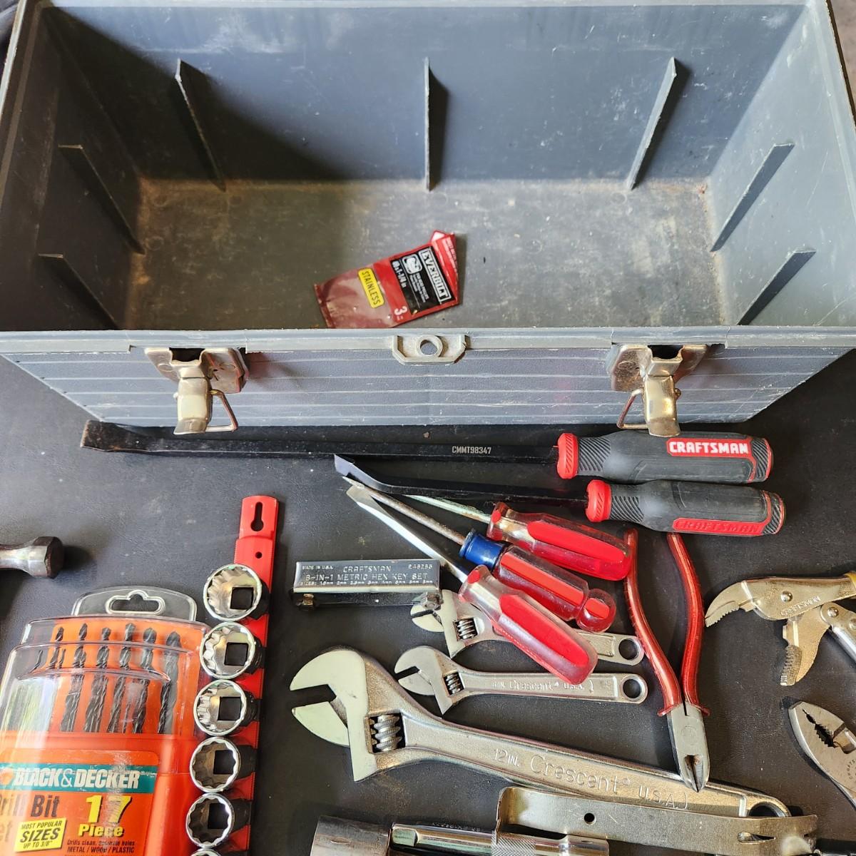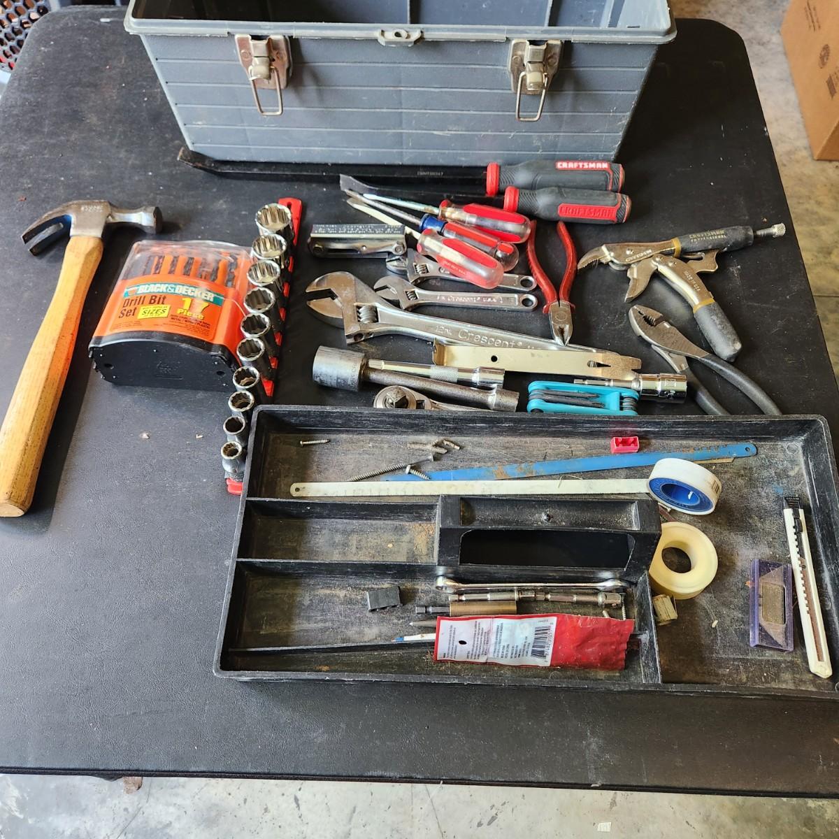 Plastic Tool Box with Lot of Tools as Pictured , Hammer, sockets, vise grip, Screwdrivers, Pliers and more