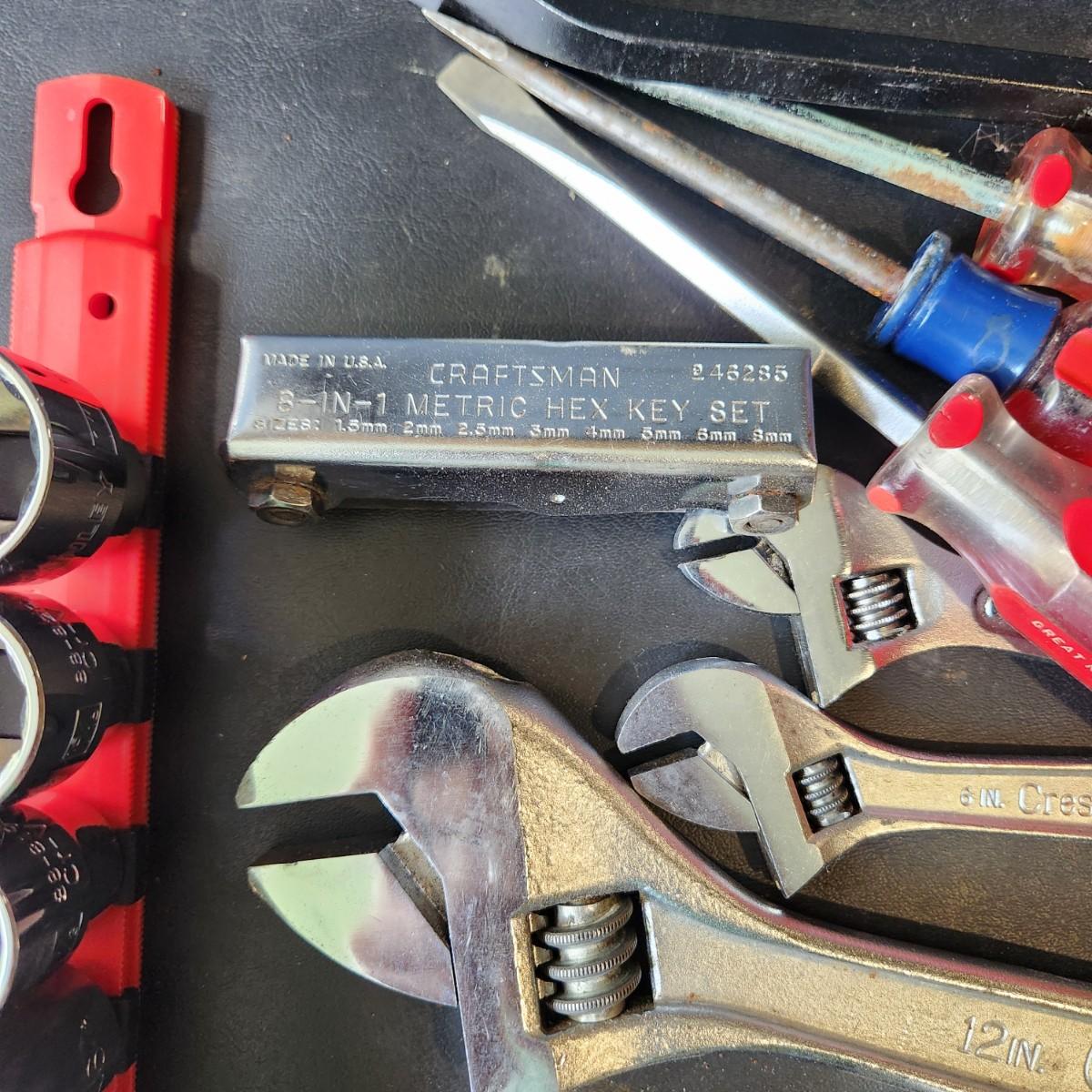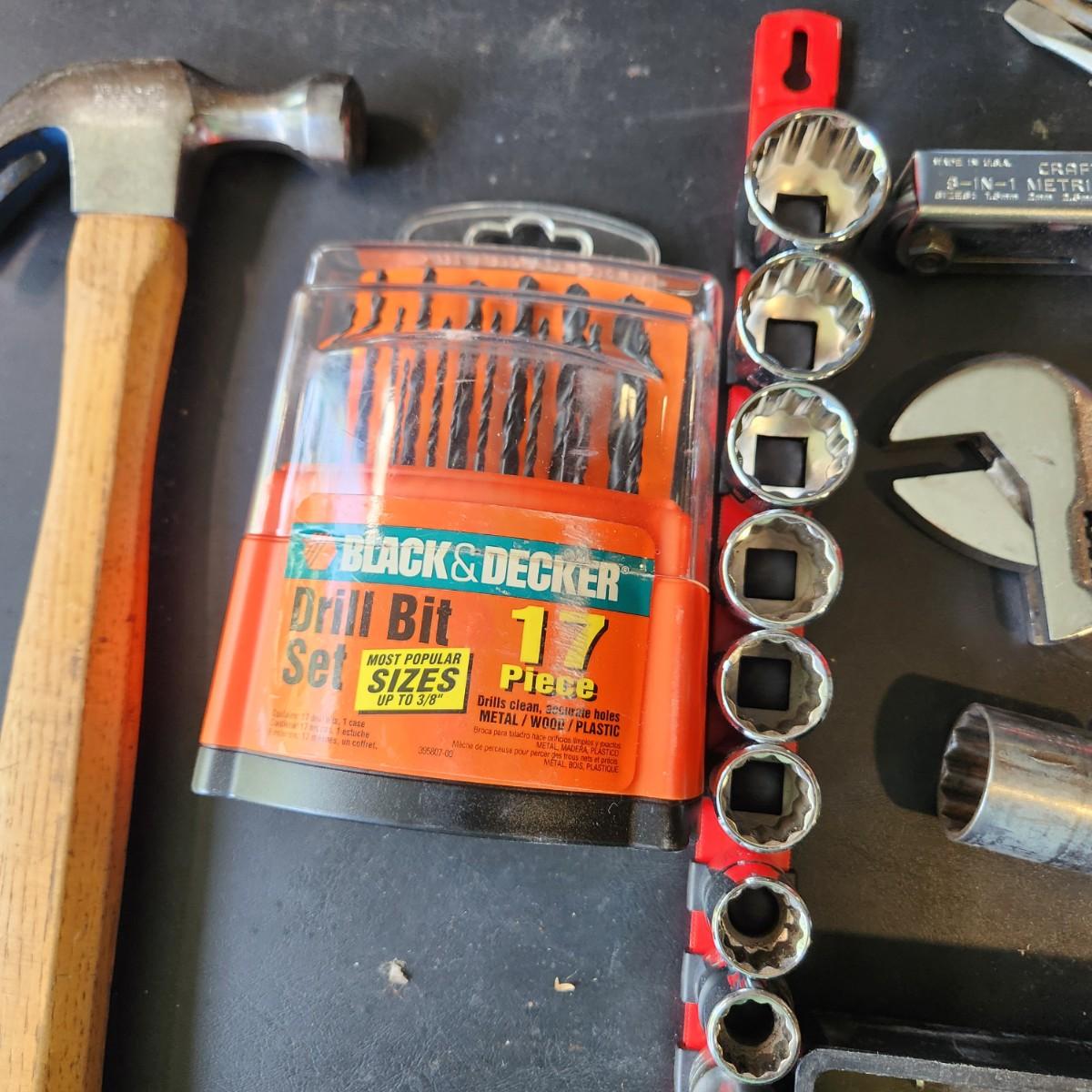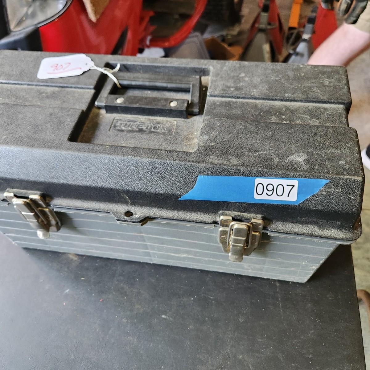 Plastic Tool Box with Lot of Tools as Pictured , Hammer, sockets, vise grip, Screwdrivers, Pliers and more
