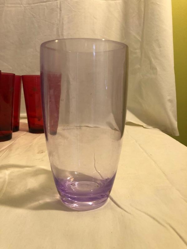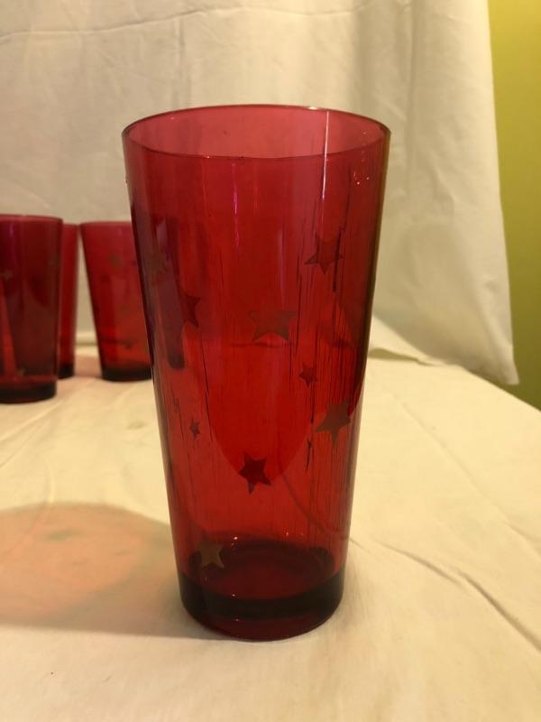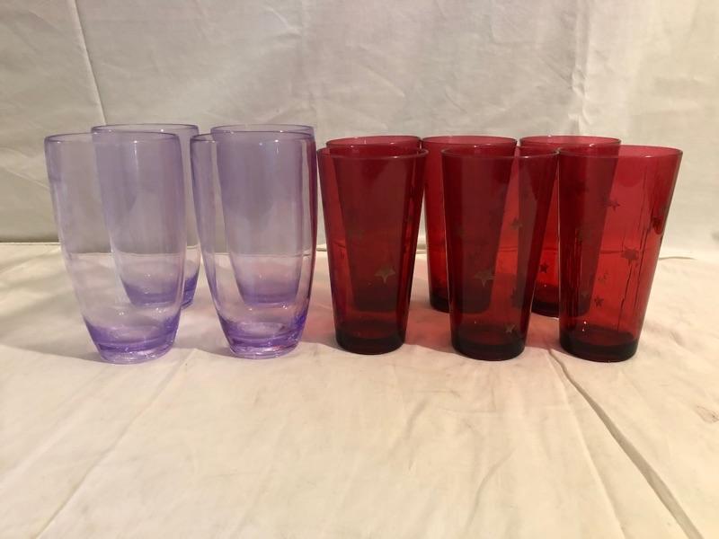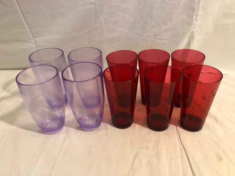 2 sets of plastic glasses for big drinks outside! 1 set of 4 purple and 1 set of 6 red with gold stars! purple are 7in tall x 3.5 diameter and red are 6.5 tall x 3in diameter