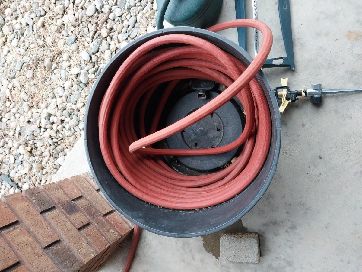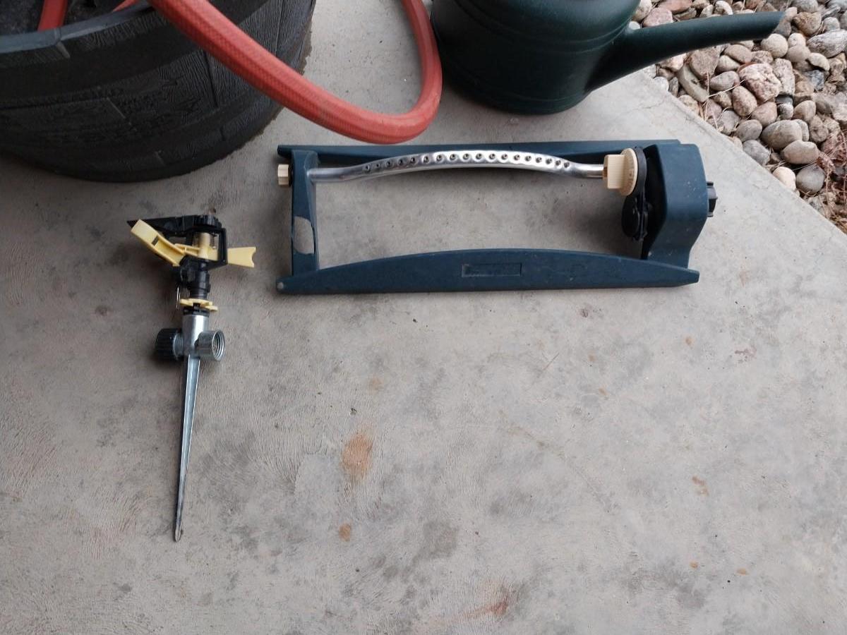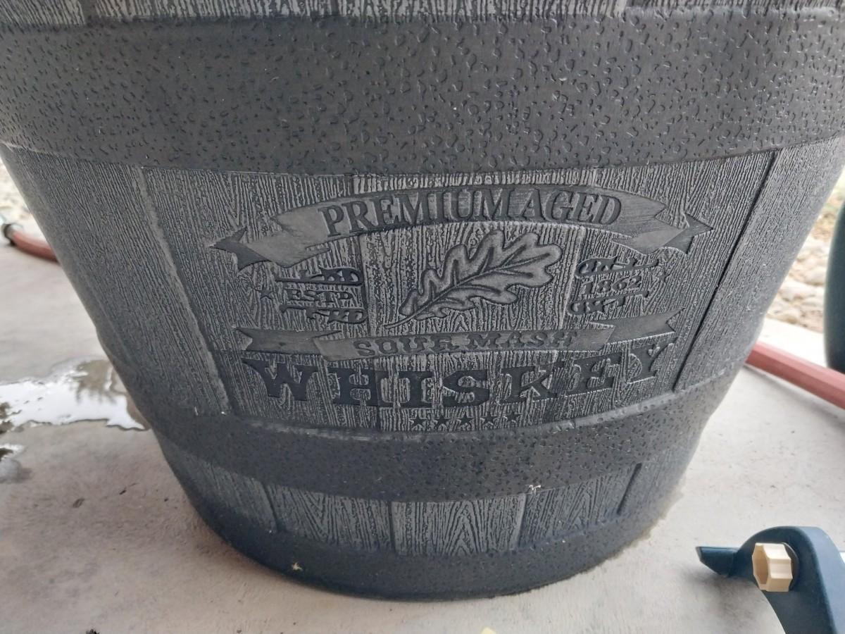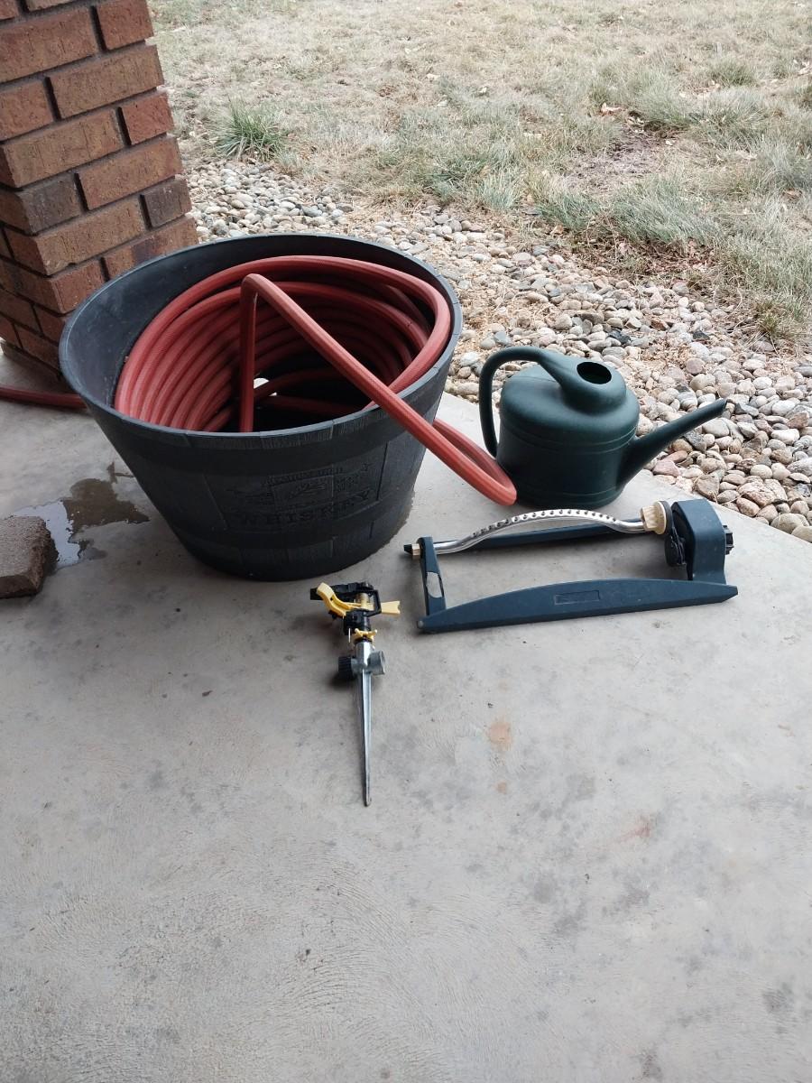 PLASTIC WHISKEY BARREL, GARDEN HOSE, SPRINKLERS AND WATERING CAN