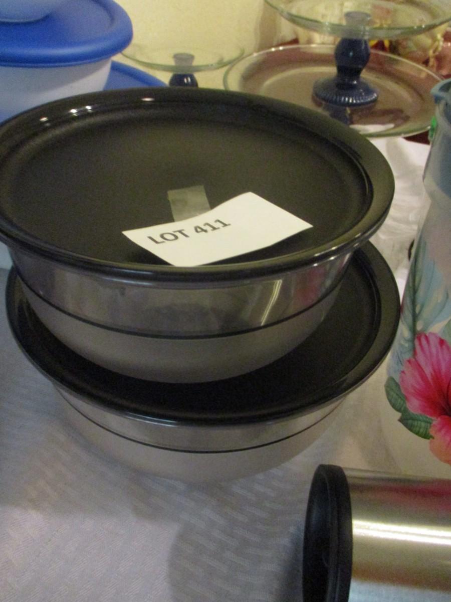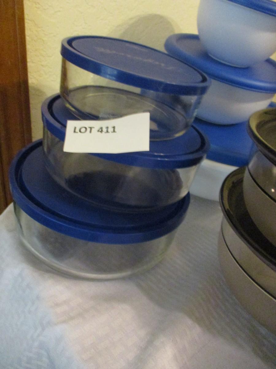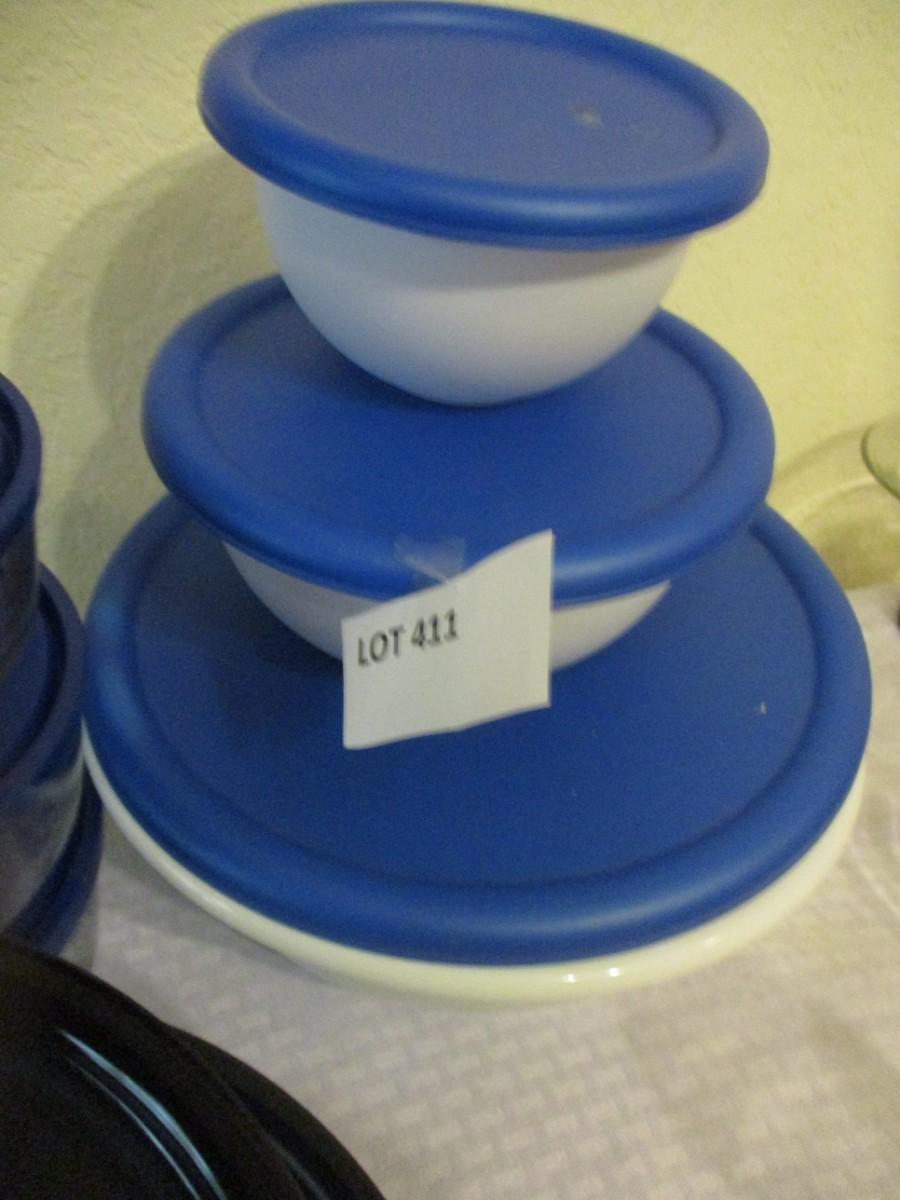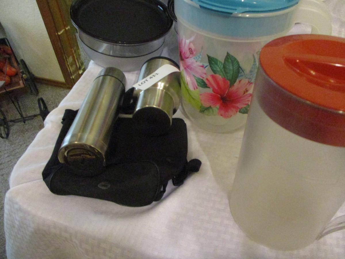 Thermos, 2 plastic pitchers. Glass bowl sets. Blue/White plastic bowl sets