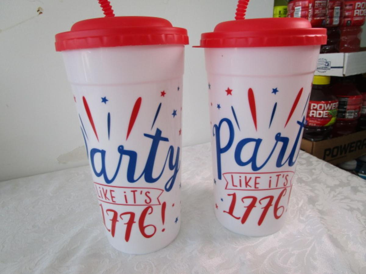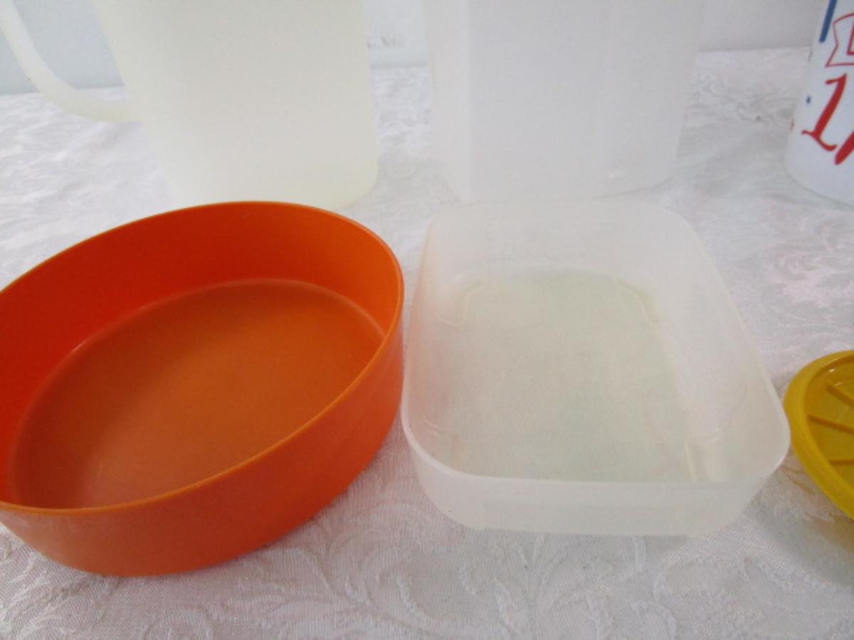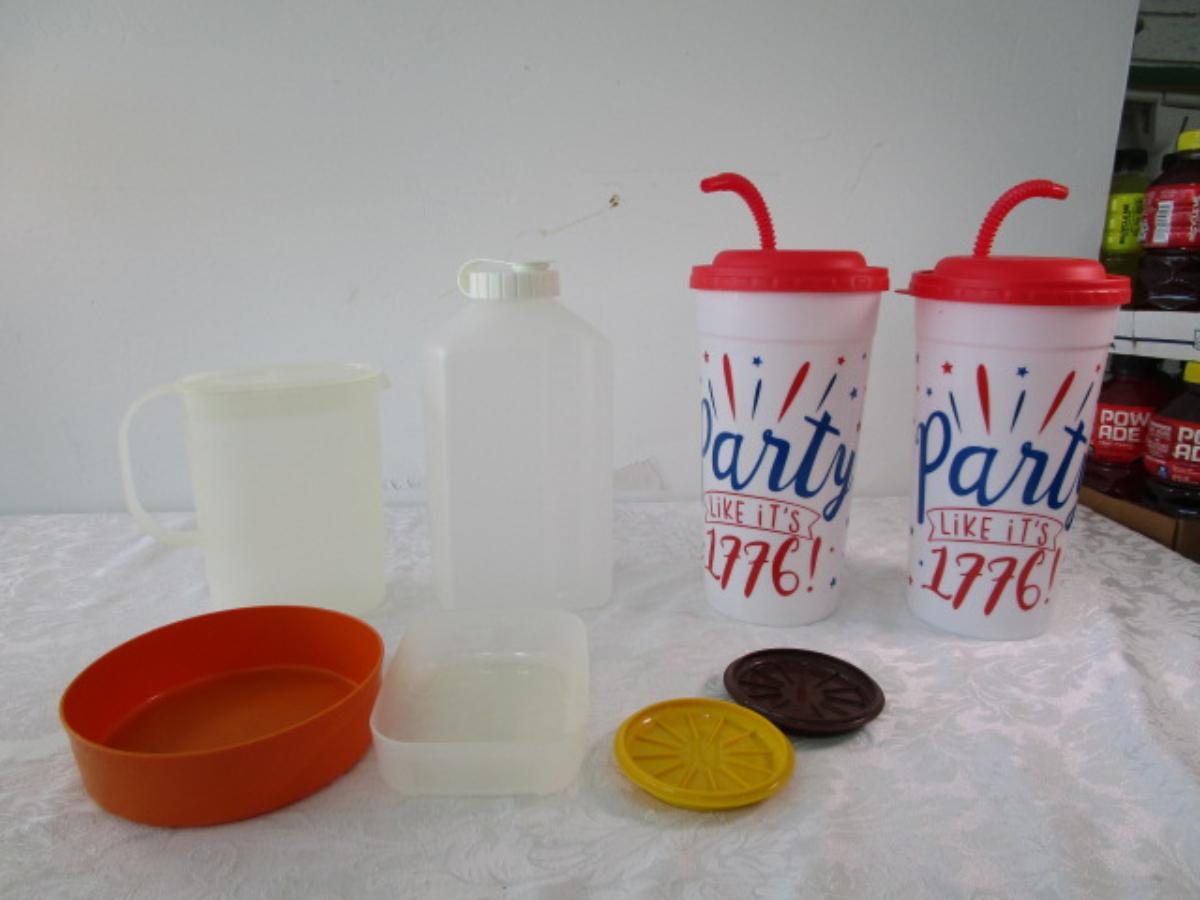 2- 75 oz. cups with lids & straws, Tupperware pitcher, Rubbermaid 2 liter container, 1 Tupperware bowl, 1 container with no lid, 2 Tupperware coasters