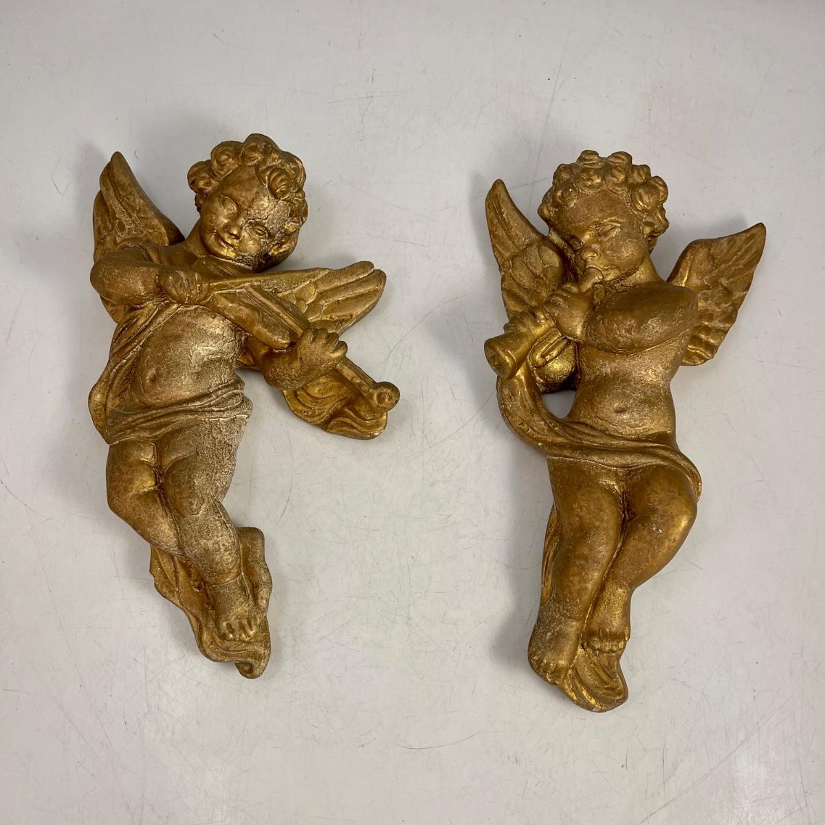 Pair of Gold Painted Plaster Wall Hanging Angel Cherub Figures. In good aged condition.