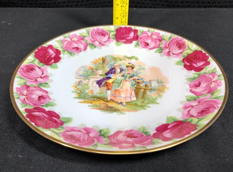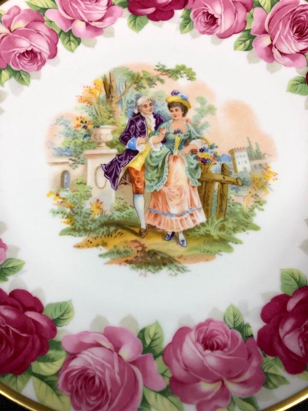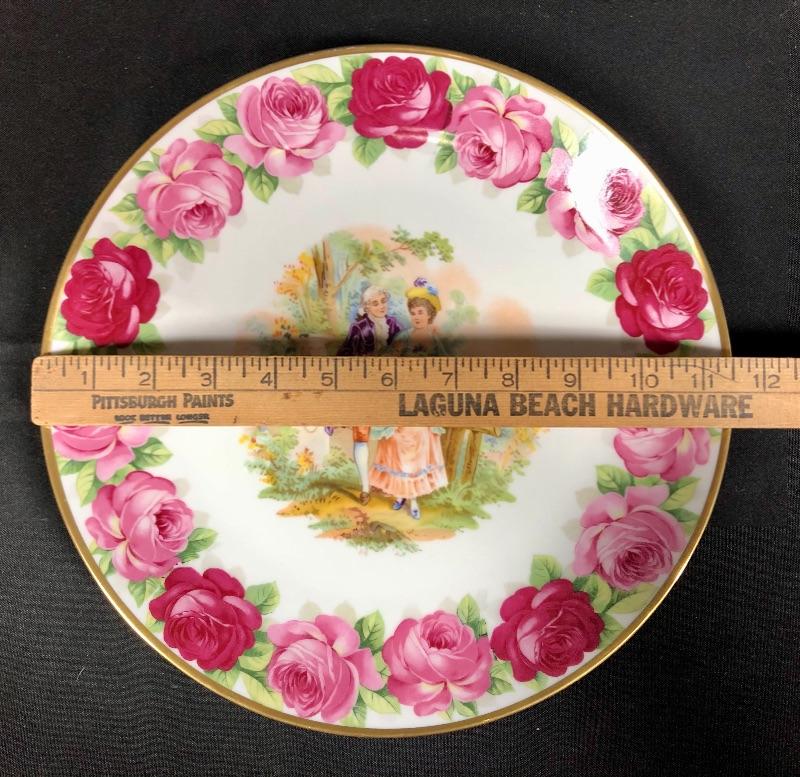 Antique 11.5" cake serving plate. Pink roses around the outside and a Victorian couple in the center. Marked on the back. Good condition. #24-30027