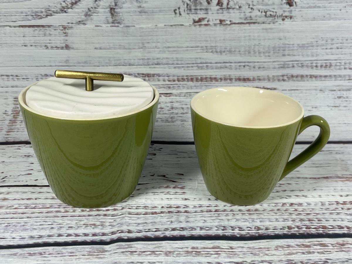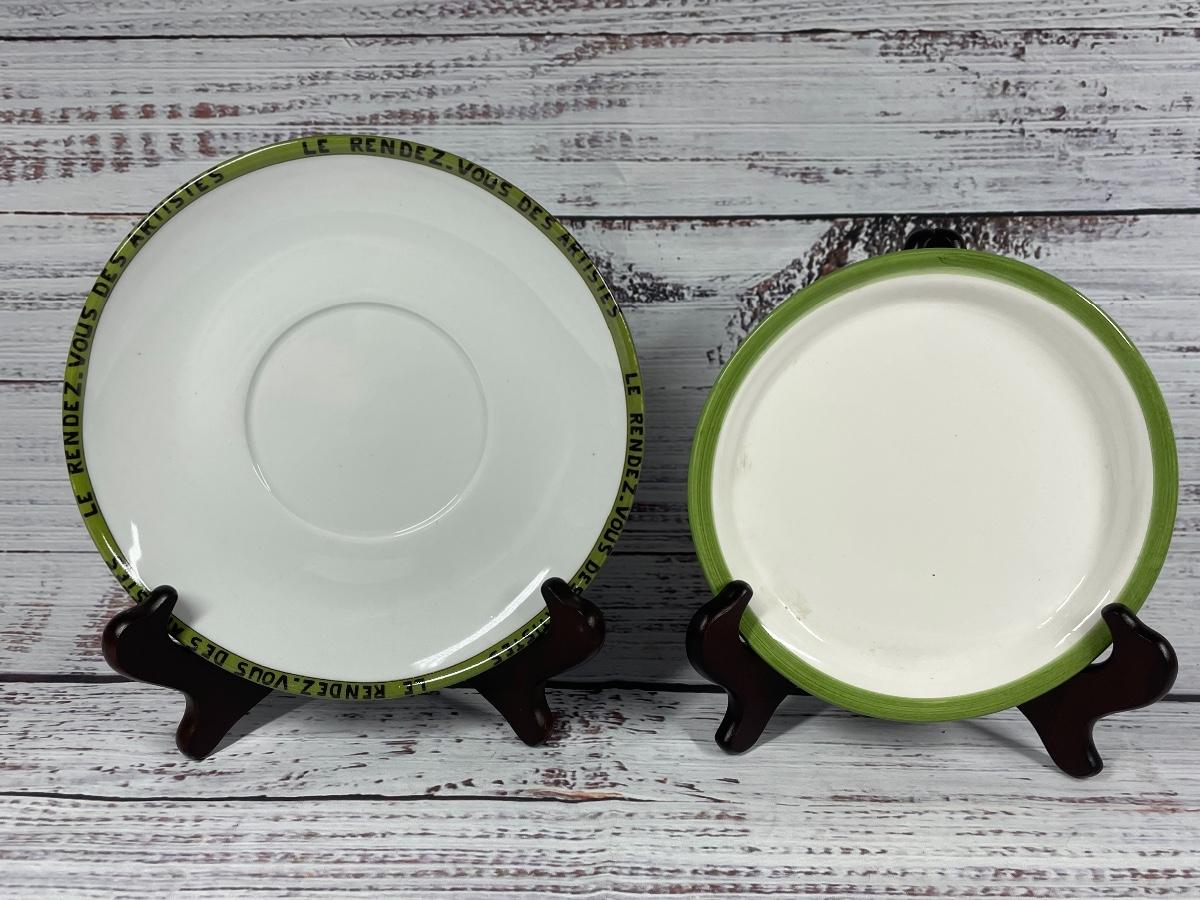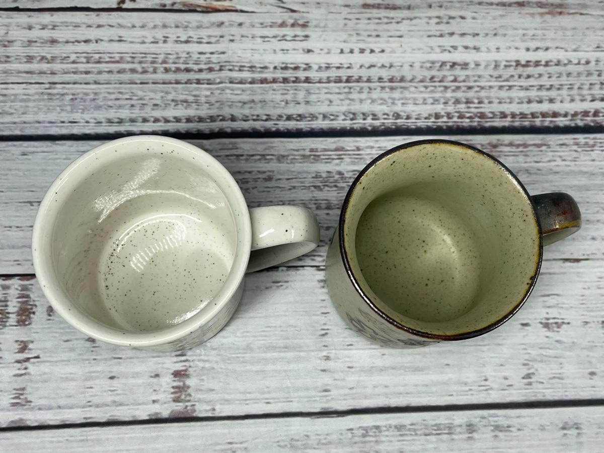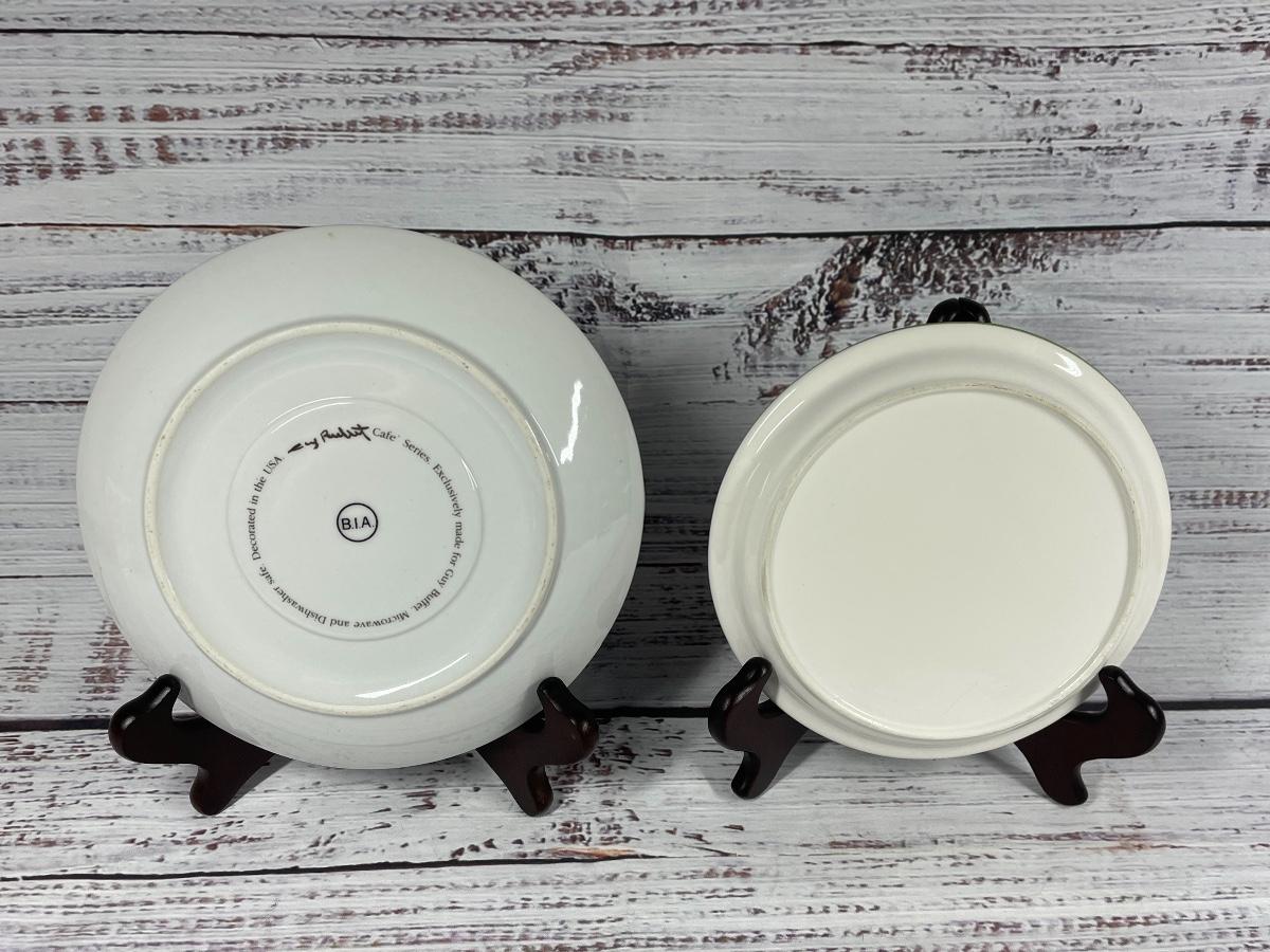 Some plates have discoloration on the bottom and some cups have discoloration inside. None of the plates and mugs have chips or cracks.