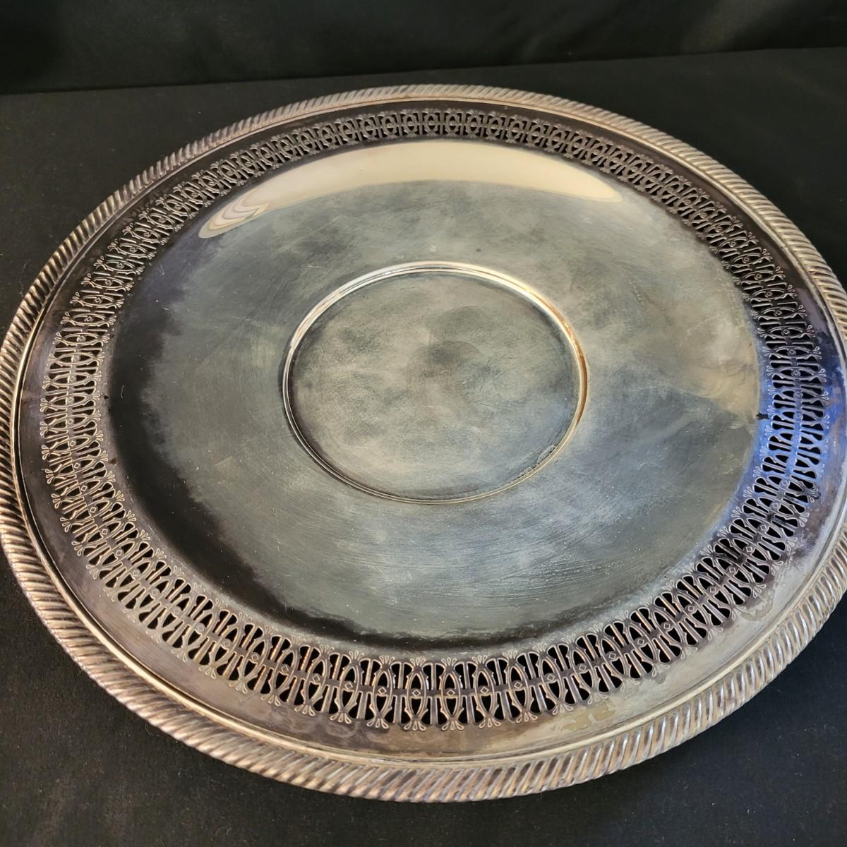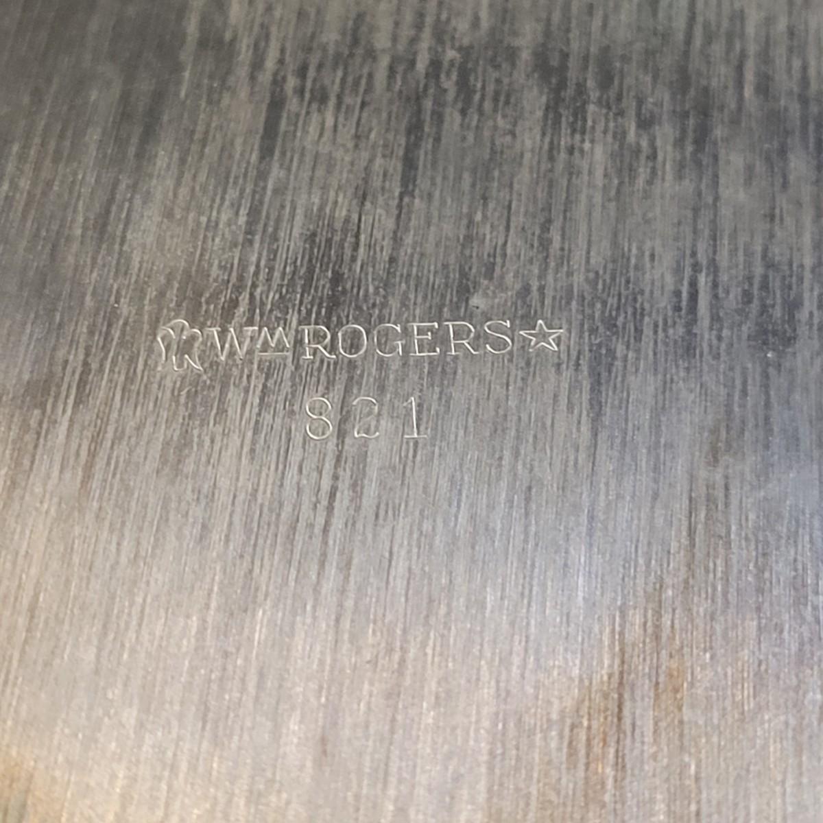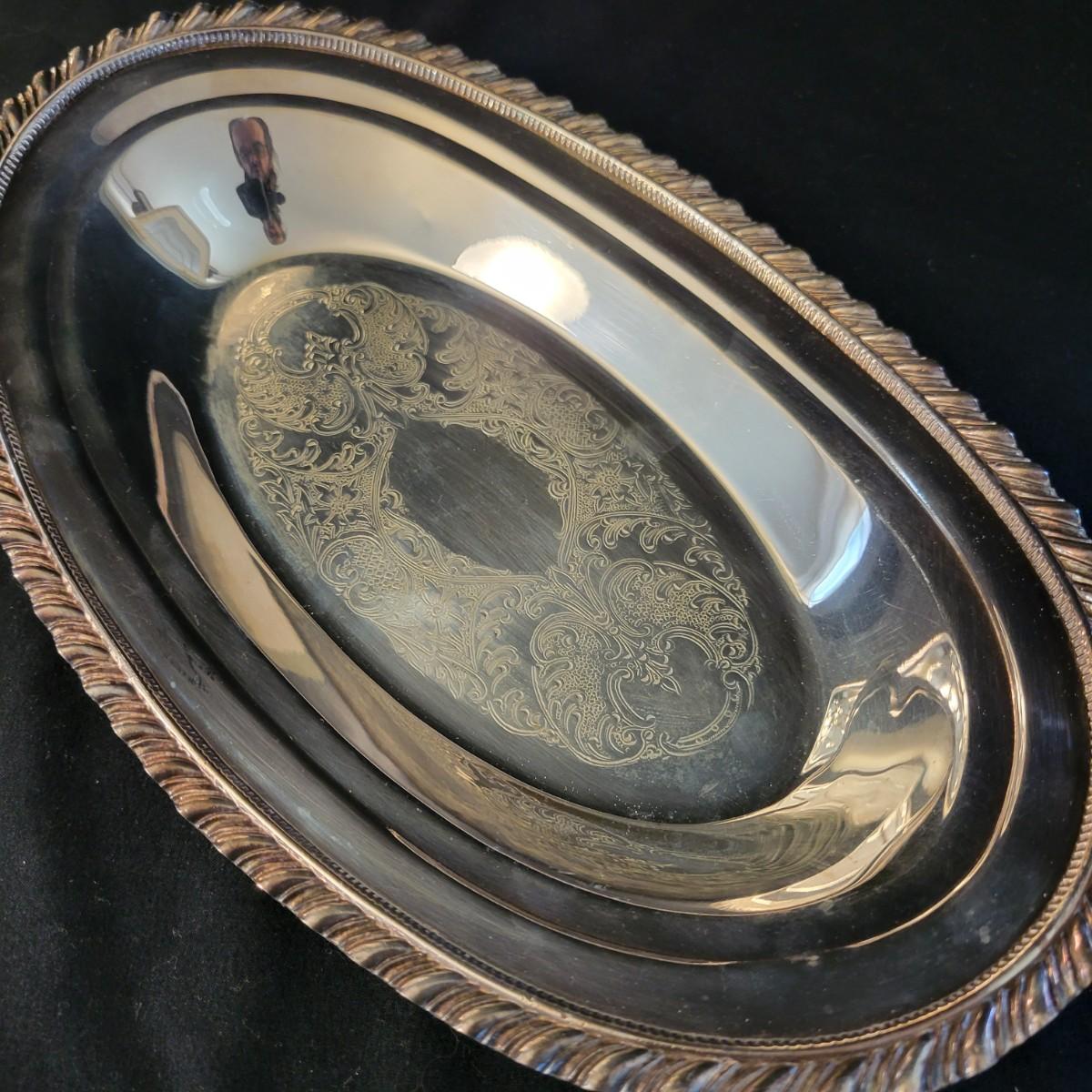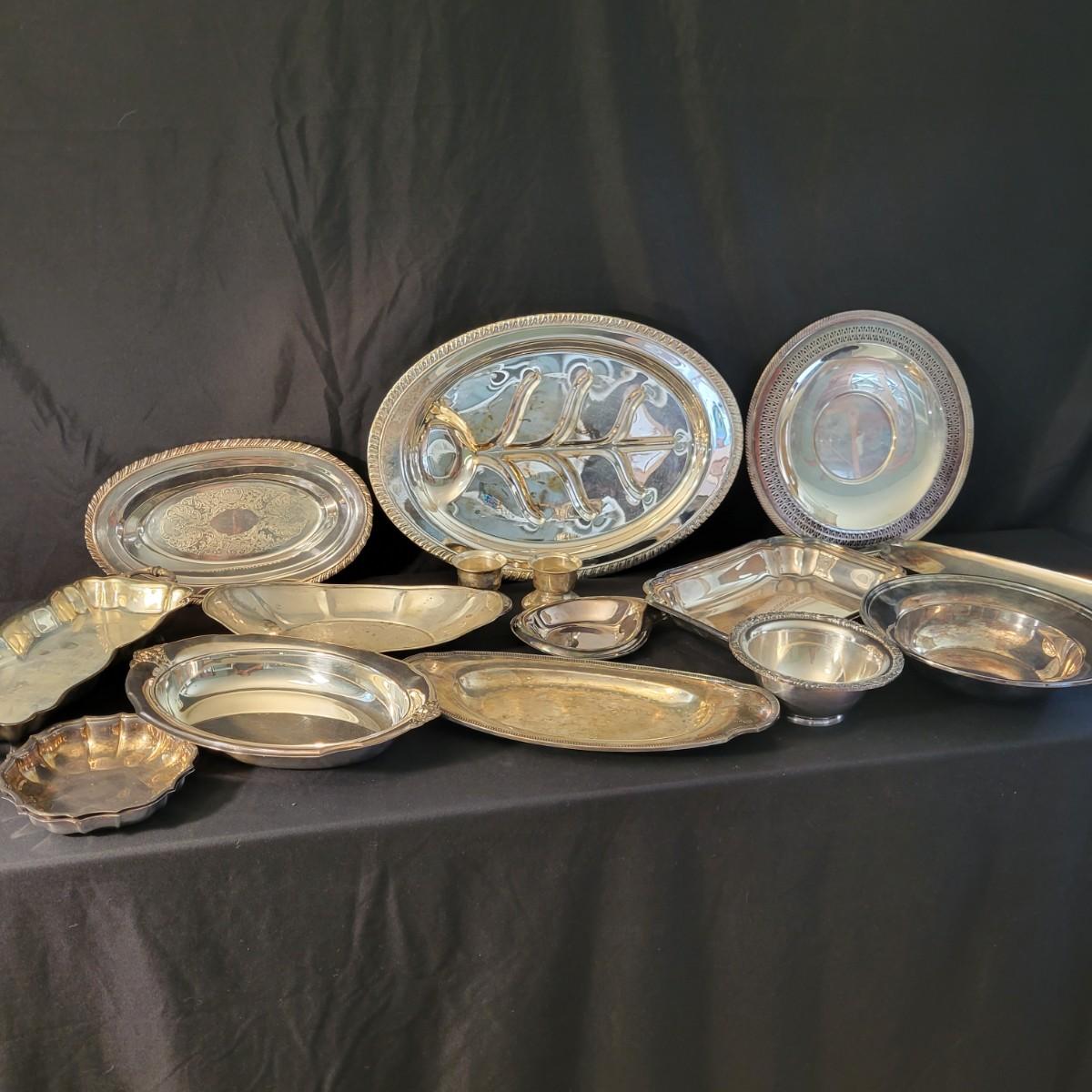 An assortment of fourteen plated silver platters, bowls and plates from a variety of manufacturers including Chippendale, WM Rogers, 1847 Rogers Bros and more. See attached pictures for full inventory and detail. Largest serving platter measures approximately 18" x 12.5" x 1.5"