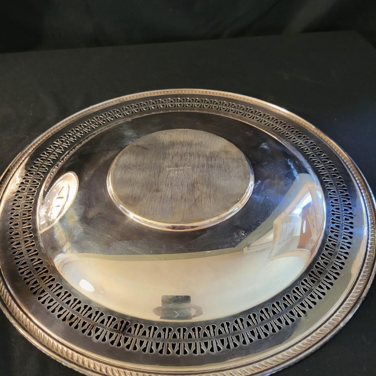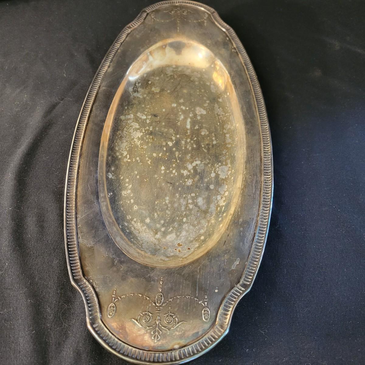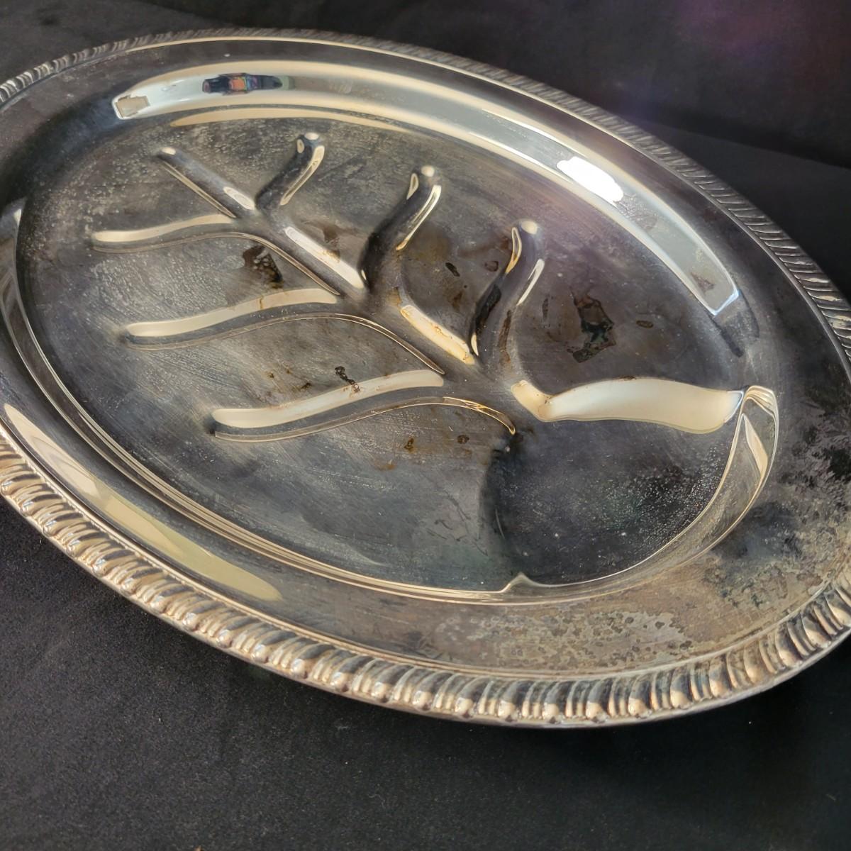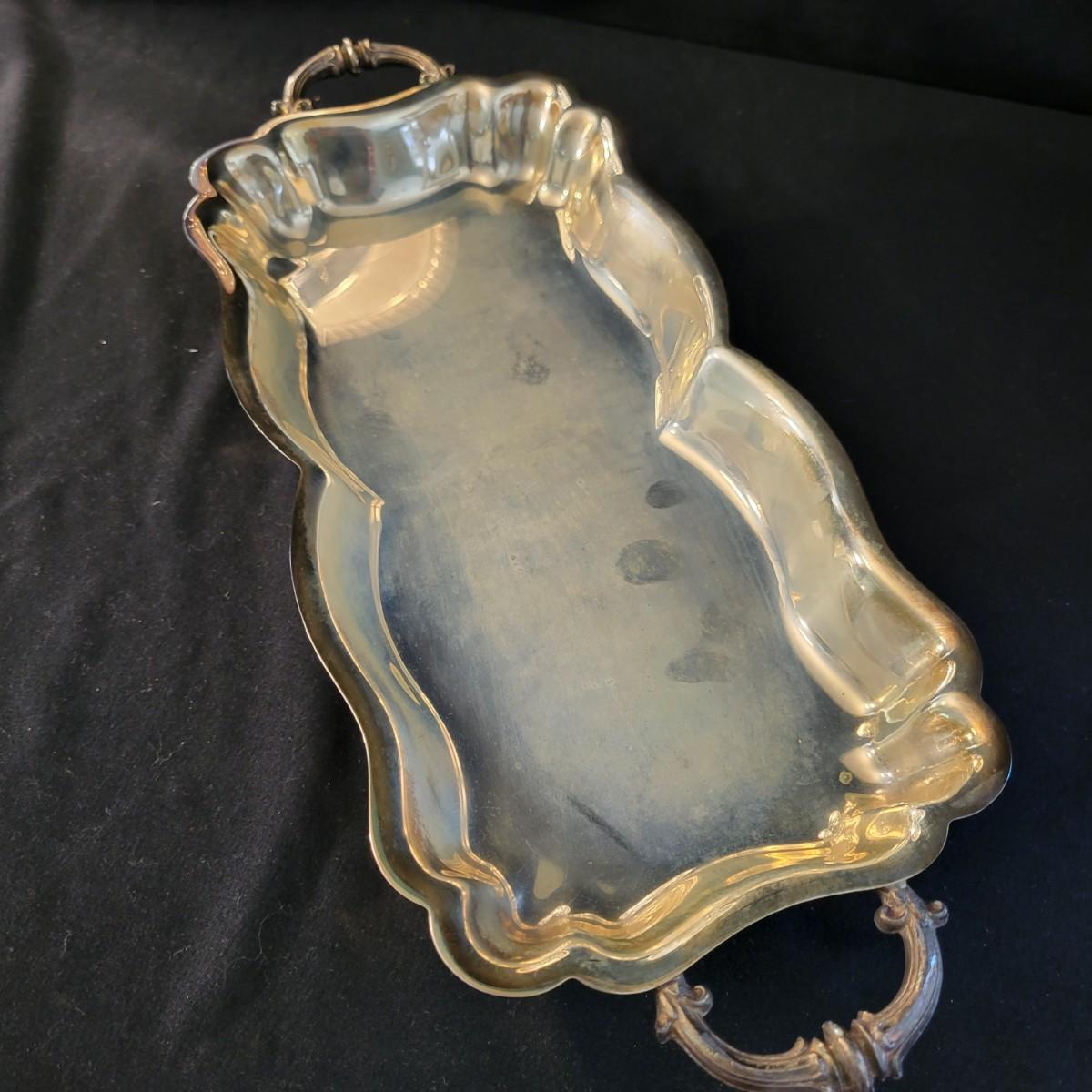 An assortment of fourteen plated silver platters, bowls and plates from a variety of manufacturers including Chippendale, WM Rogers, 1847 Rogers Bros and more. See attached pictures for full inventory and detail. Largest serving platter measures approximately 18" x 12.5" x 1.5"