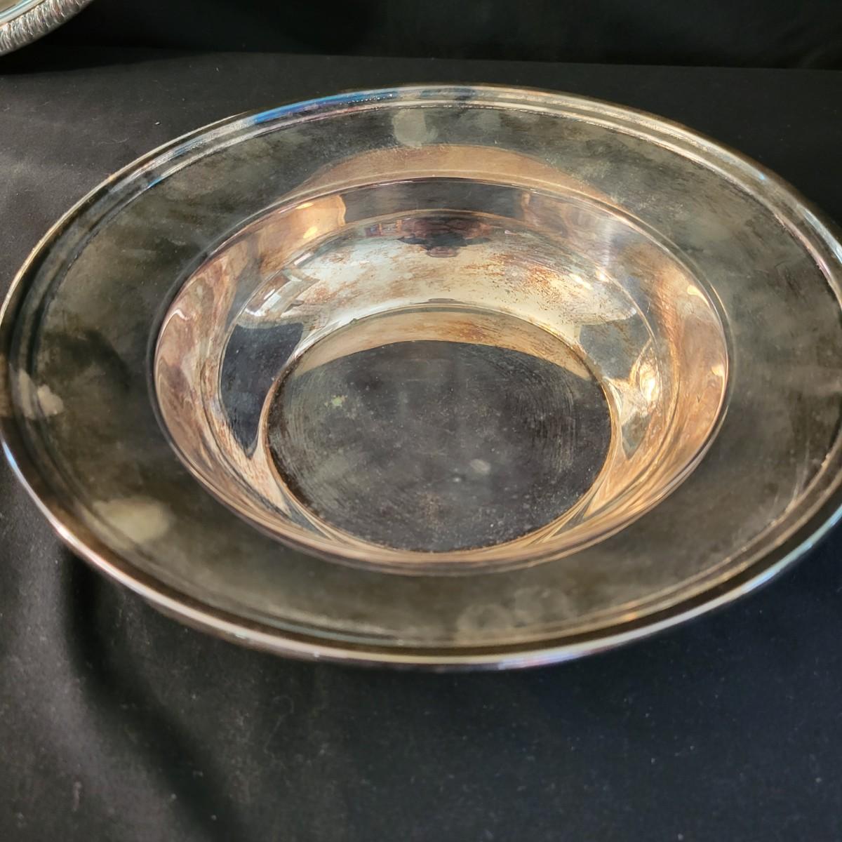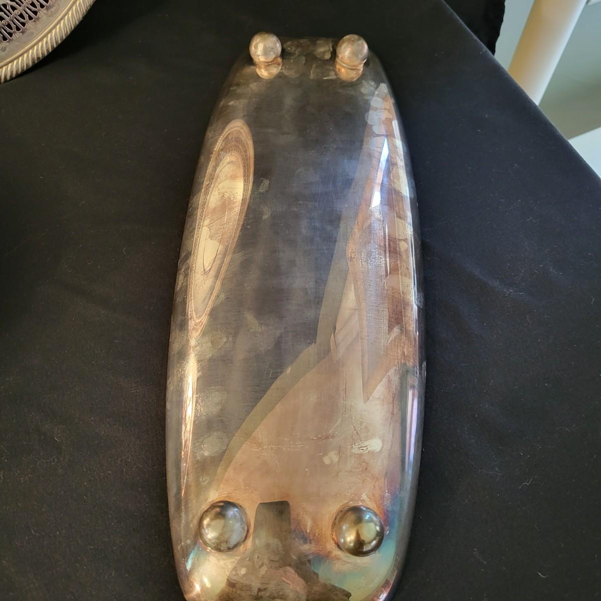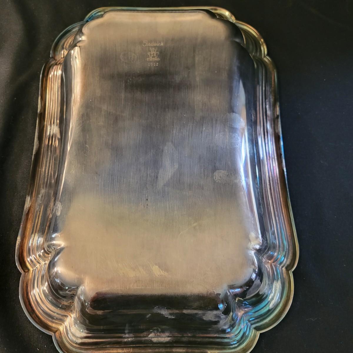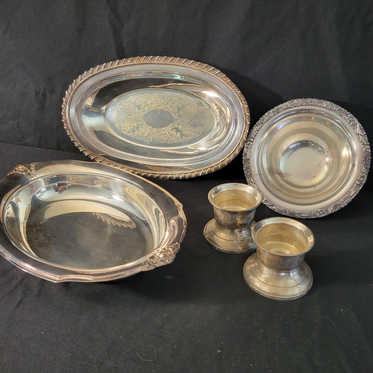 An assortment of fourteen plated silver platters, bowls and plates from a variety of manufacturers including Chippendale, WM Rogers, 1847 Rogers Bros and more. See attached pictures for full inventory and detail. Largest serving platter measures approximately 18" x 12.5" x 1.5"