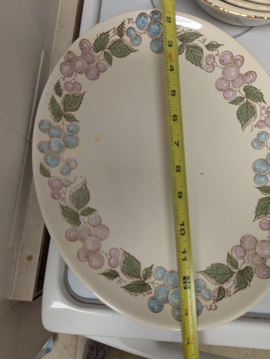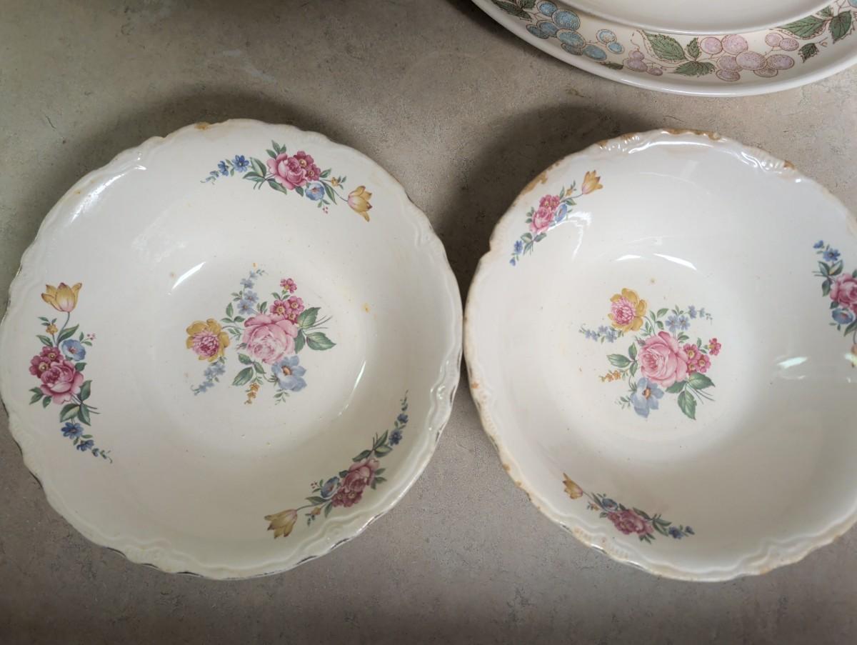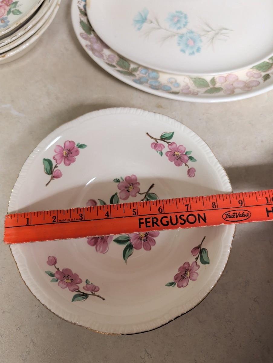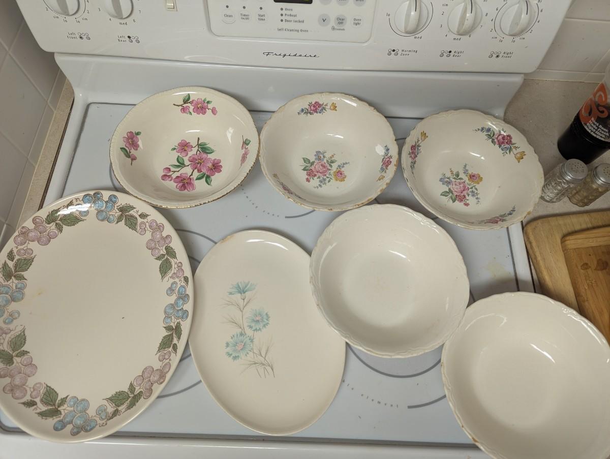 Possibly Concord oval serving platter, with grapes and Vine design. Vintage Taylor Smith Taylor every yours, boutonniere oval serving platter. Florals 1940s Hazel SCIO bowls. Vintage Homer Laughlin Apple blossom bowl. Vintage cream color bowls.