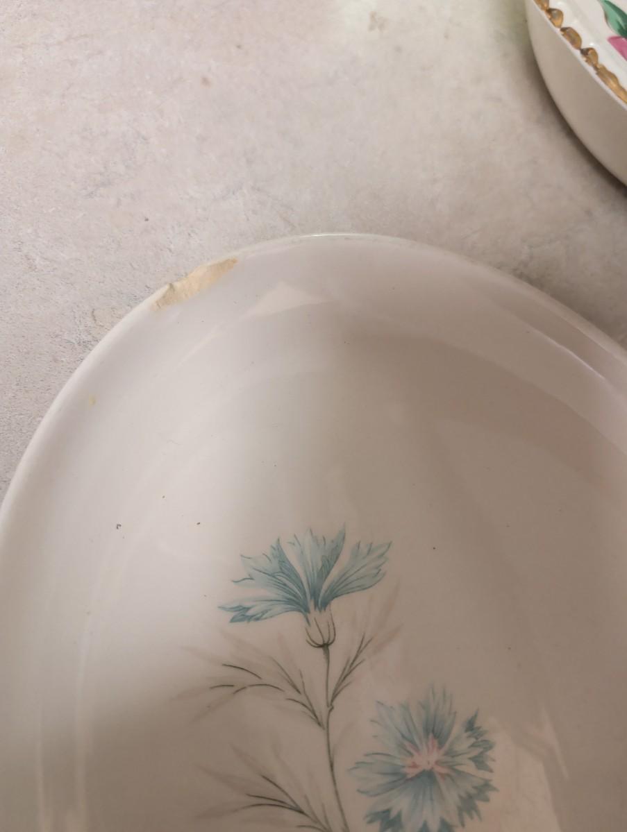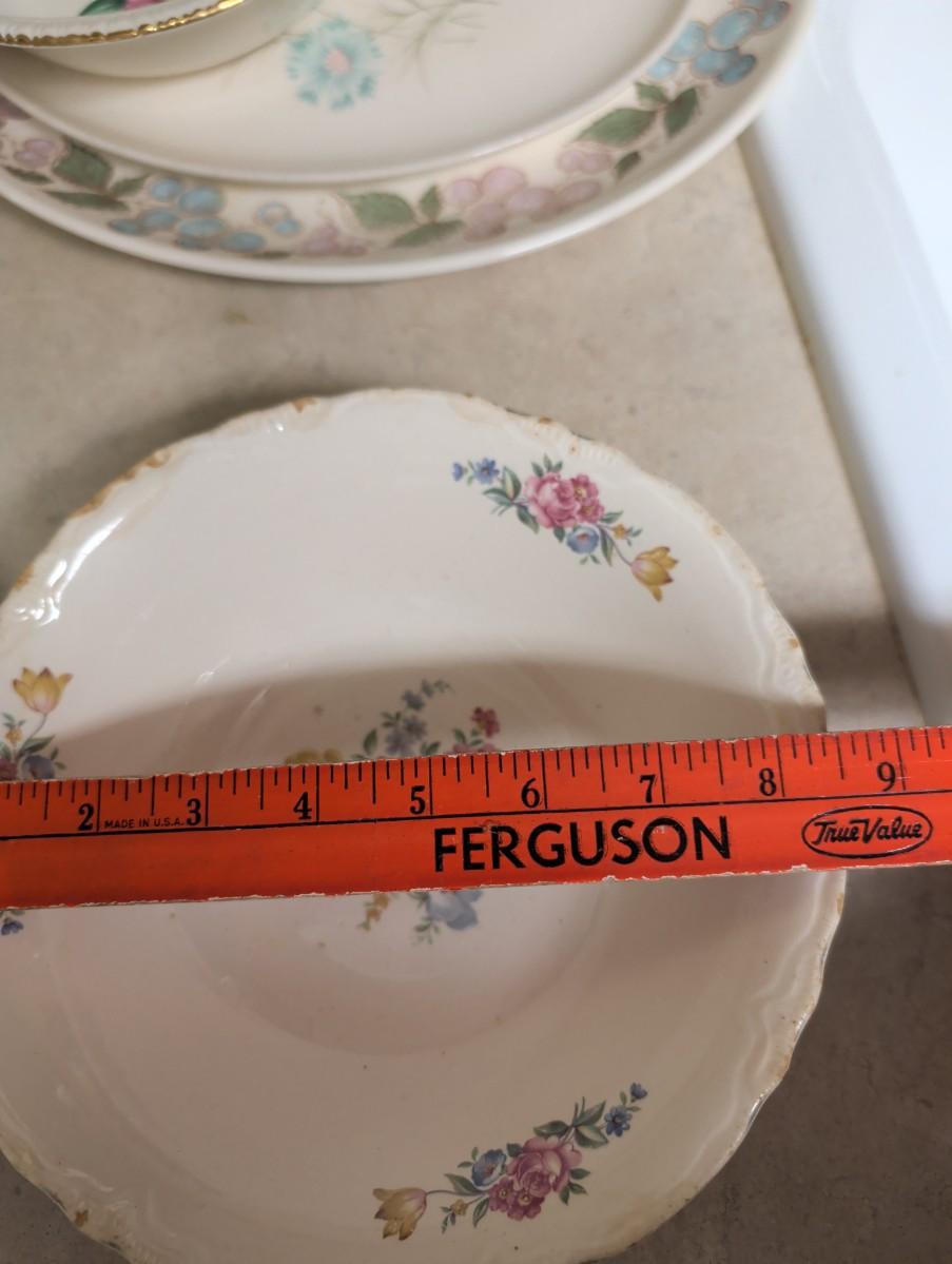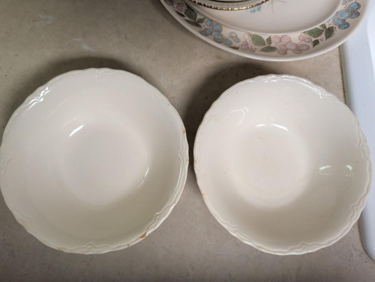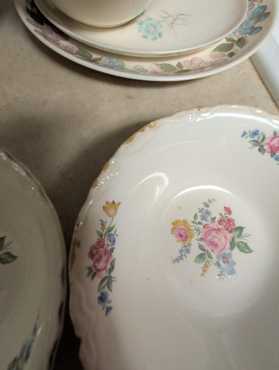 Possibly Concord oval serving platter, with grapes and Vine design. Vintage Taylor Smith Taylor every yours, boutonniere oval serving platter. Florals 1940s Hazel SCIO bowls. Vintage Homer Laughlin Apple blossom bowl. Vintage cream color bowls.