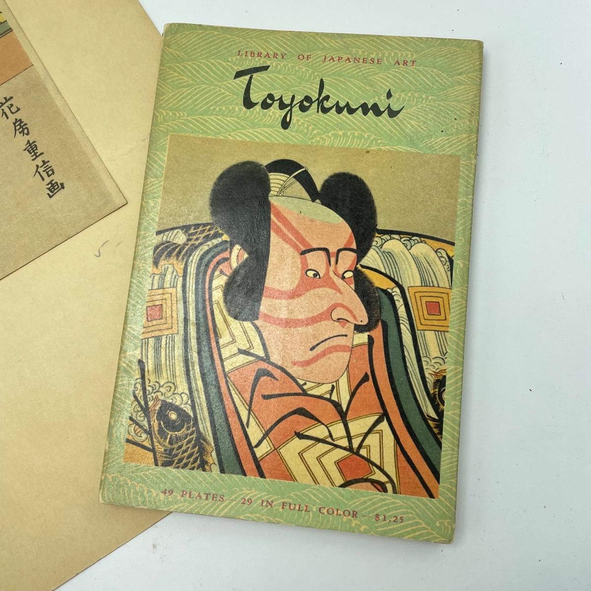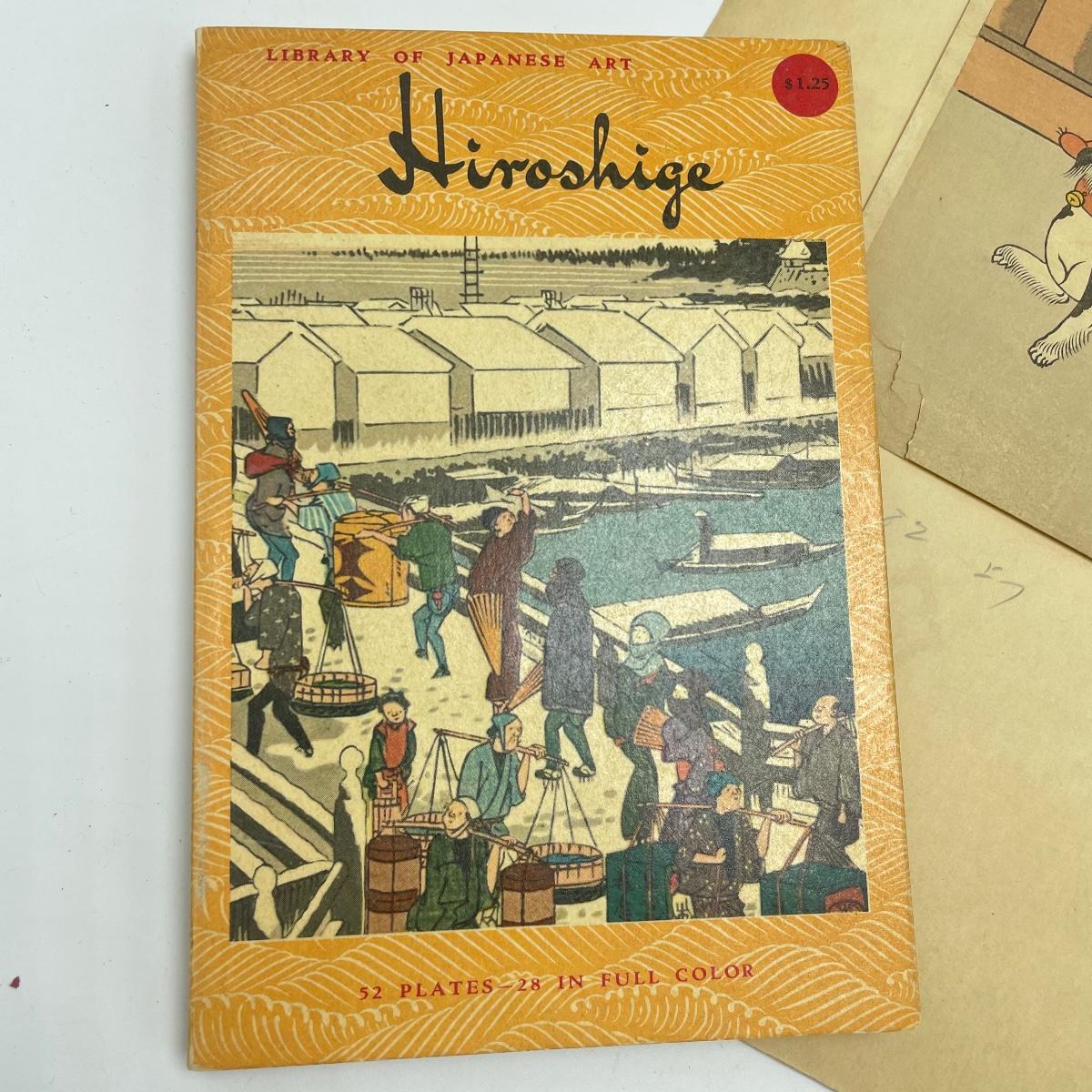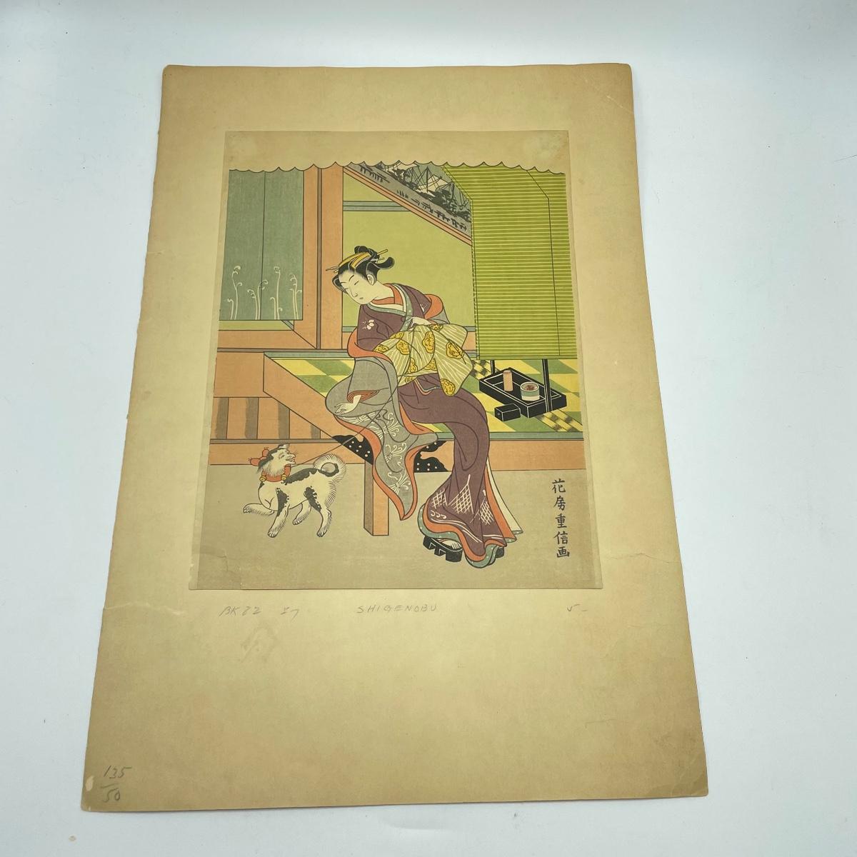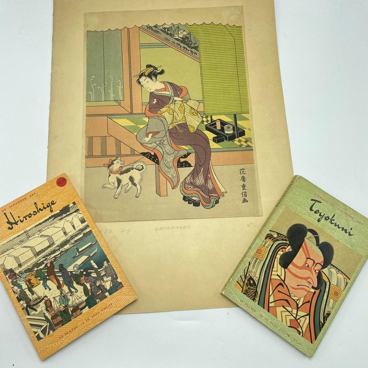 Two Library of Japanese Art books featuring Toyokuni and Hiroshige with a combined 57 full color plates, 101 plates total. Lot also features “Beauty with Dog” by Shigenobu. Art is 8.5” x 12” and attached with adhesive to 12” x 17.5” paper back. A small tear on the lower left corner is shown in photos. Shipping available