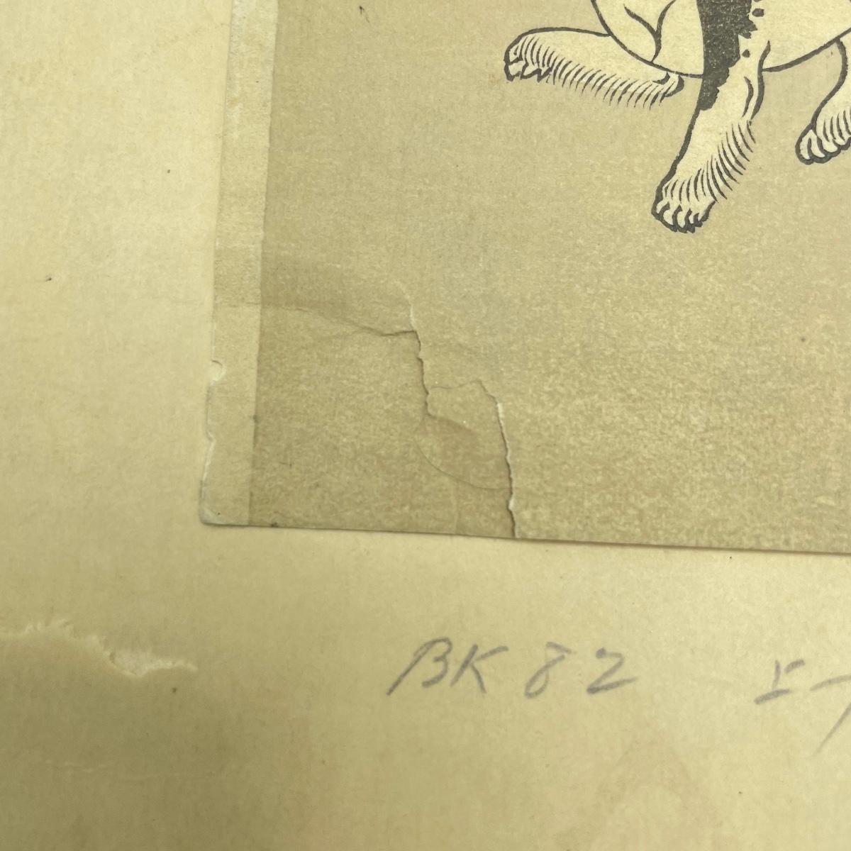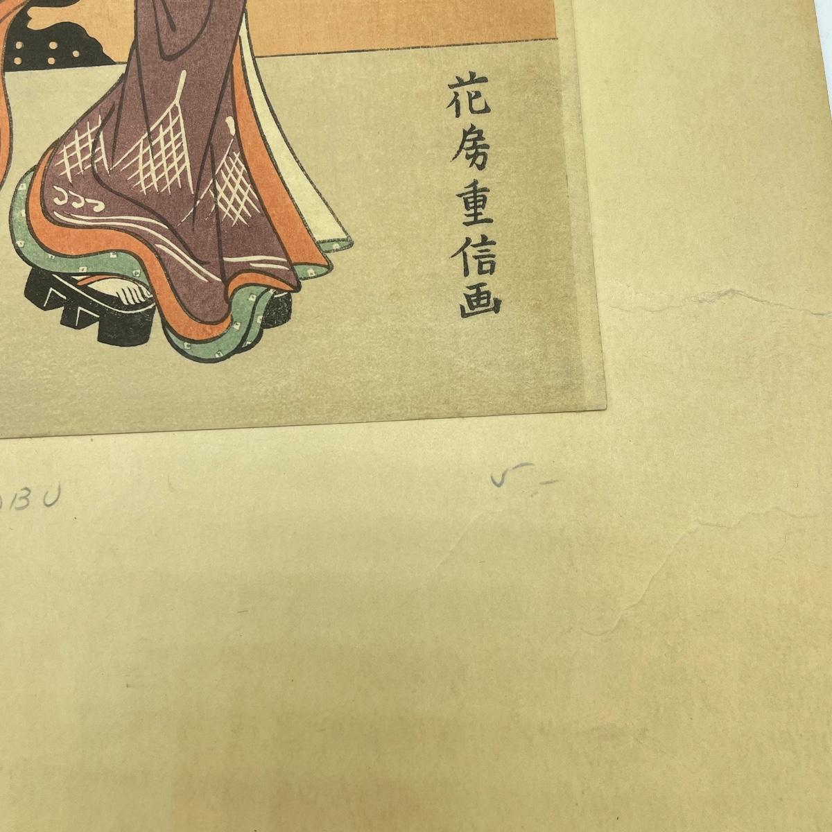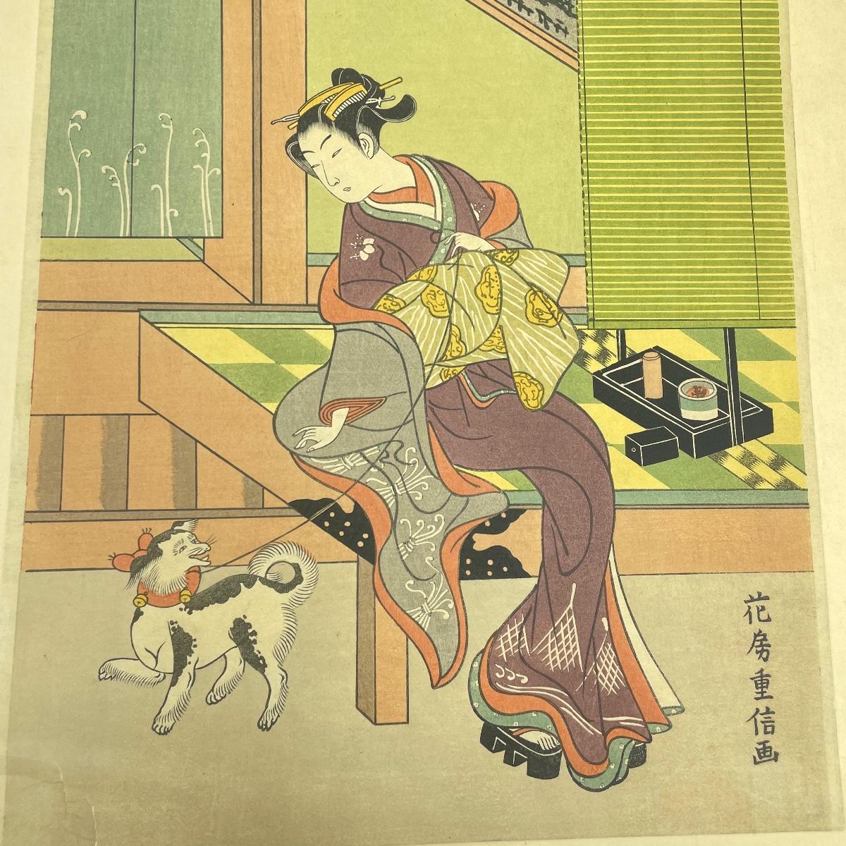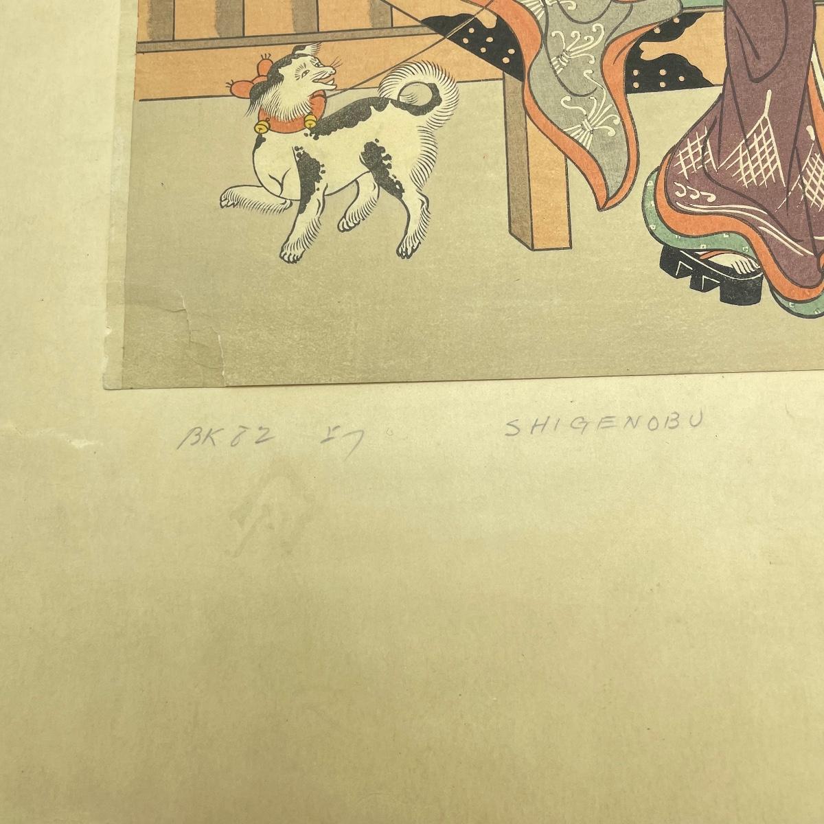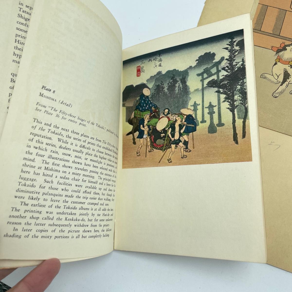 Two Library of Japanese Art books featuring Toyokuni and Hiroshige with a combined 57 full color plates, 101 plates total. Lot also features “Beauty with Dog” by Shigenobu. Art is 8.5” x 12” and attached with adhesive to 12” x 17.5” paper back. A small tear on the lower left corner is shown in photos. Shipping available
