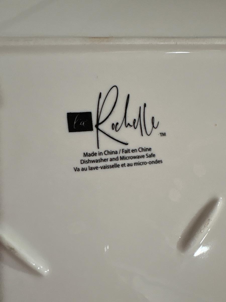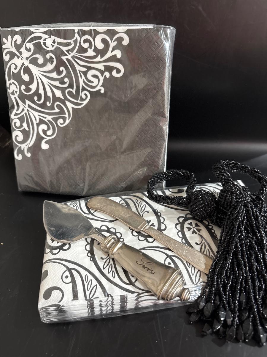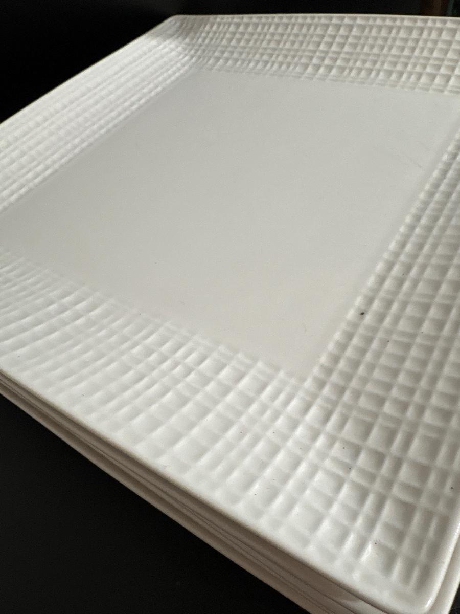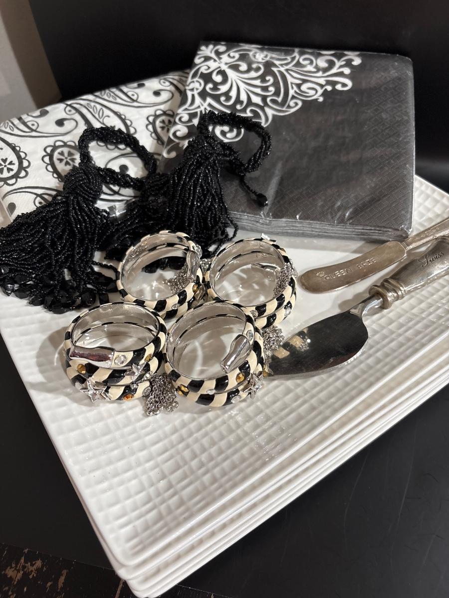 Set of six Rochelle 10.5” square plates. 4 napkin rings, cheese flatware.,