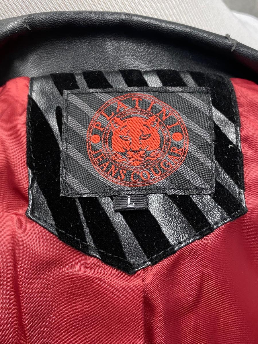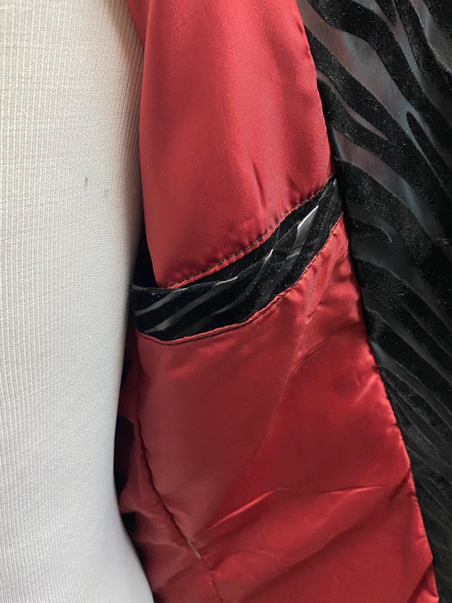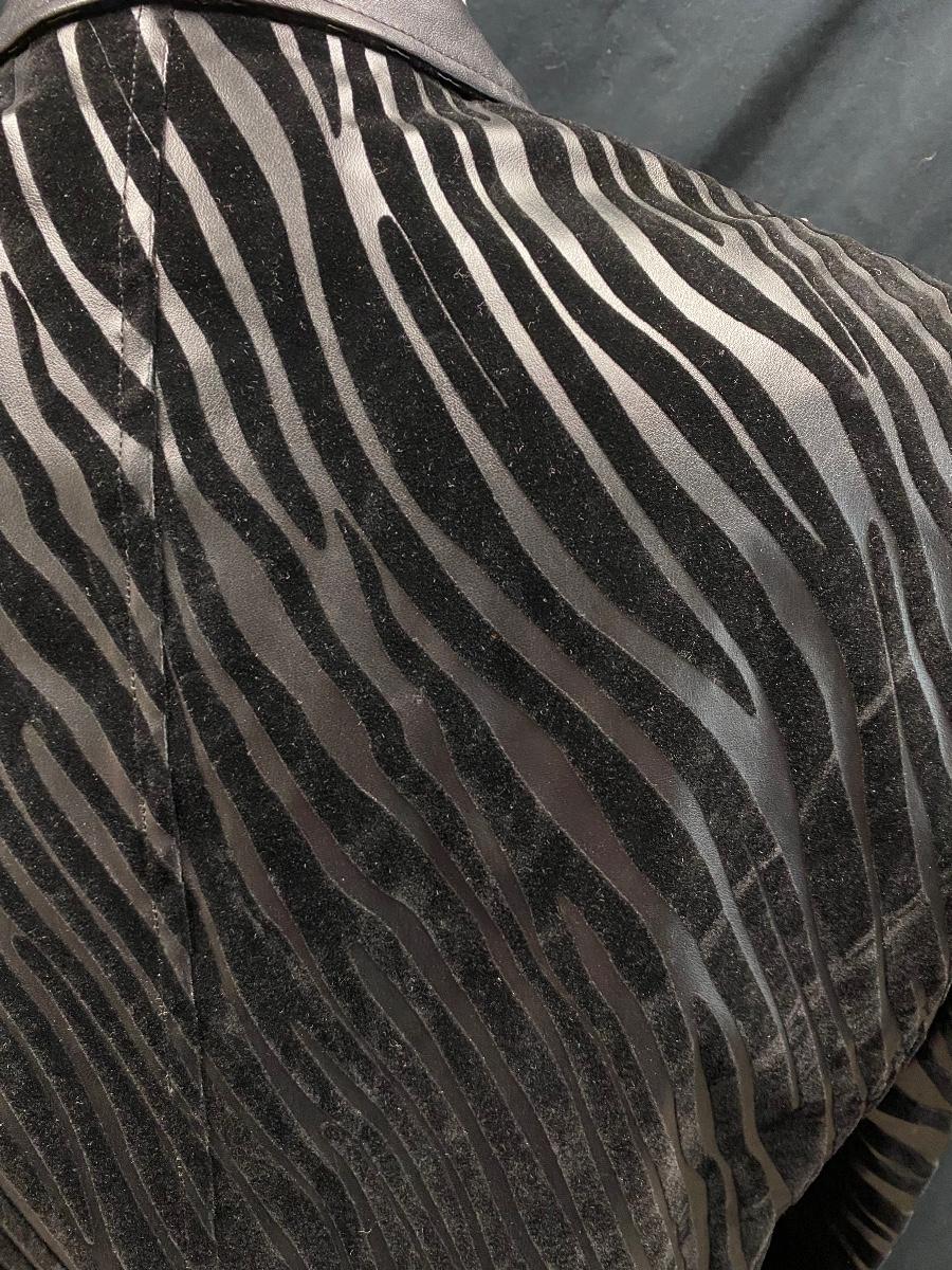 Men's Platini Jeans Cougar flashy dinner jacket sports coat. Black velvet on black faux leather tiger/zebra stripe design. In good condition. Size Large. Great for parties and events.