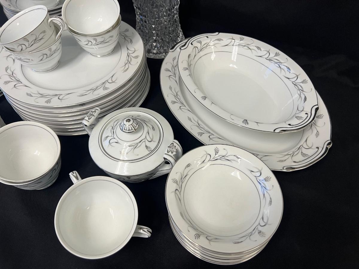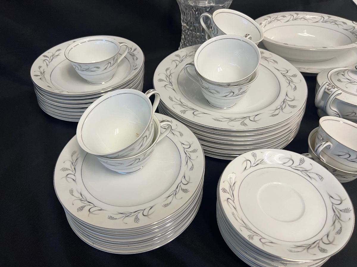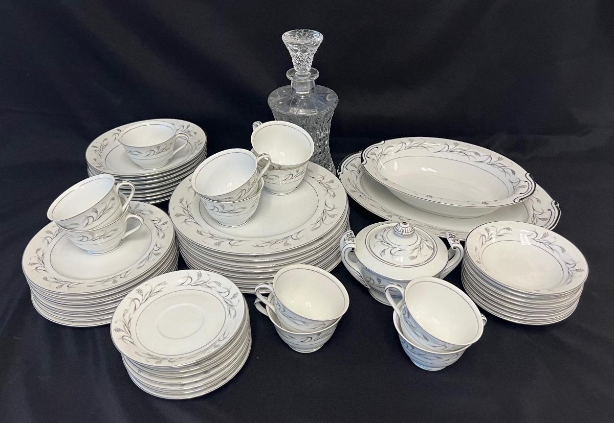 Made in Japan. This is a service for 8, with three extra cups. Includes dinner plates, dessert plates, soup bowls, berry bowls, sugar bowl with lid, cups, saucers, serving bowl, and platter. Also includes a crystal decanter. Total of 54 pieces. Age related wear, including small chips. [ML]