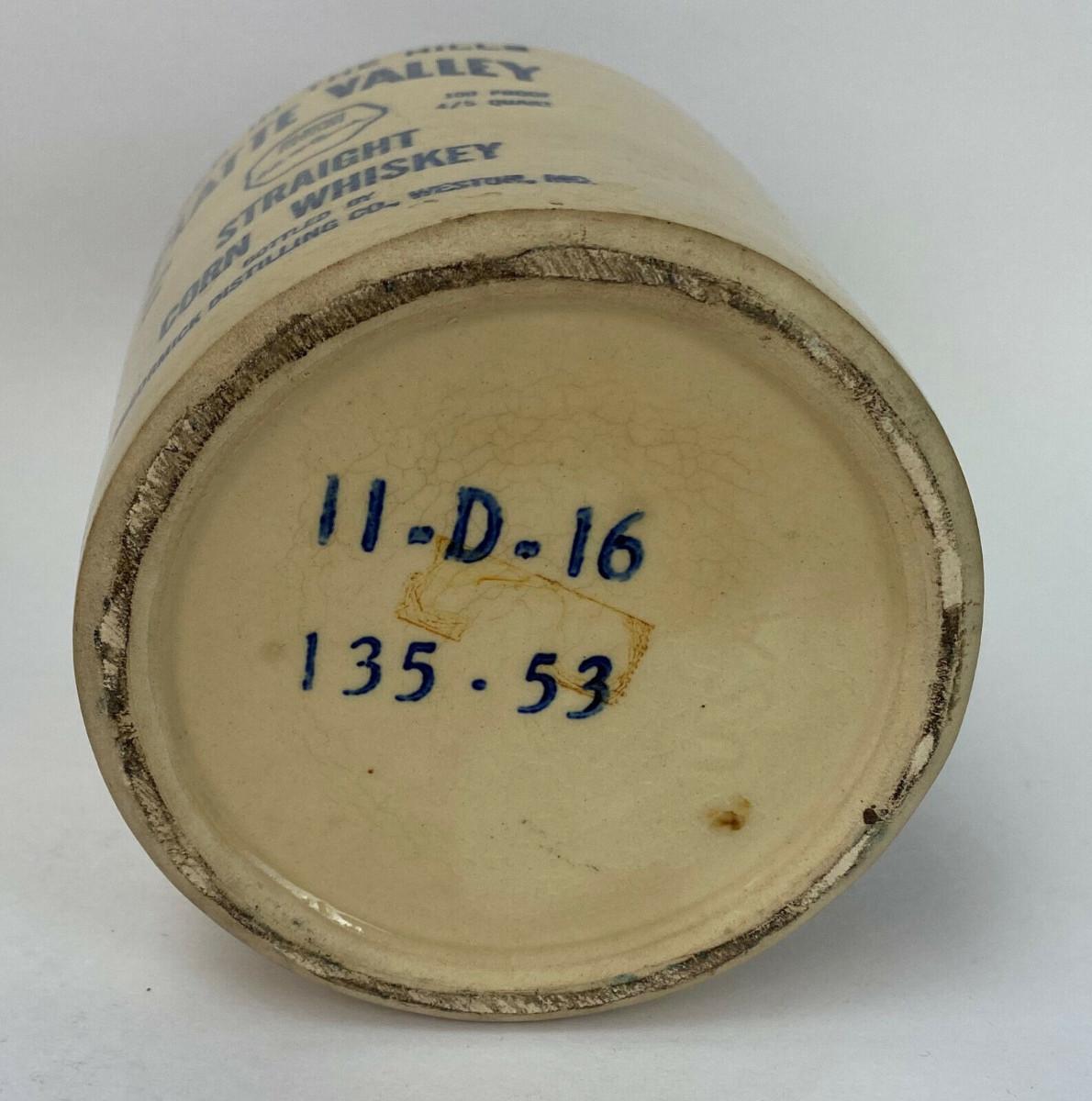Empty of original contents here is a vintage 7" stoneware jug that once held PLATTE VALLEY STRAIGHT CORN WHISKEY from the McCormick Distilling Company. Located in historic Weston, Missouri, the oldest distillery west of the Mississippi River still operating in its original location going back to 1856...This one bears a Missouri tax stamp which I believe dates between 1934 and 1949...4/5 Quart size...As shown...A classic.