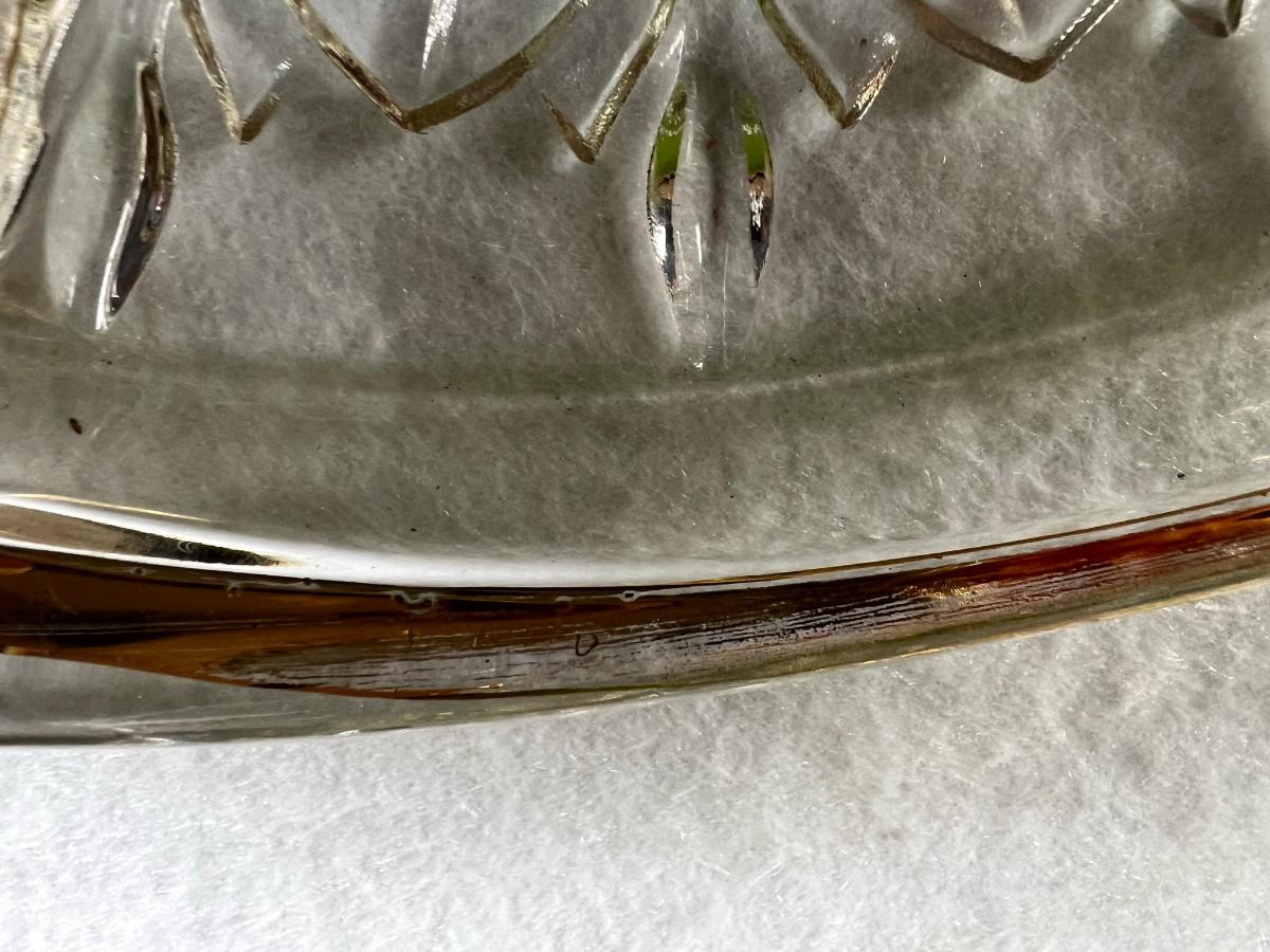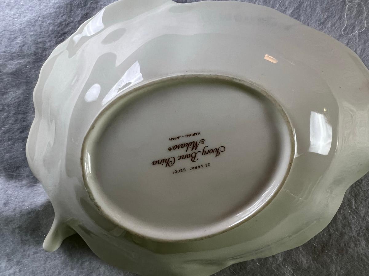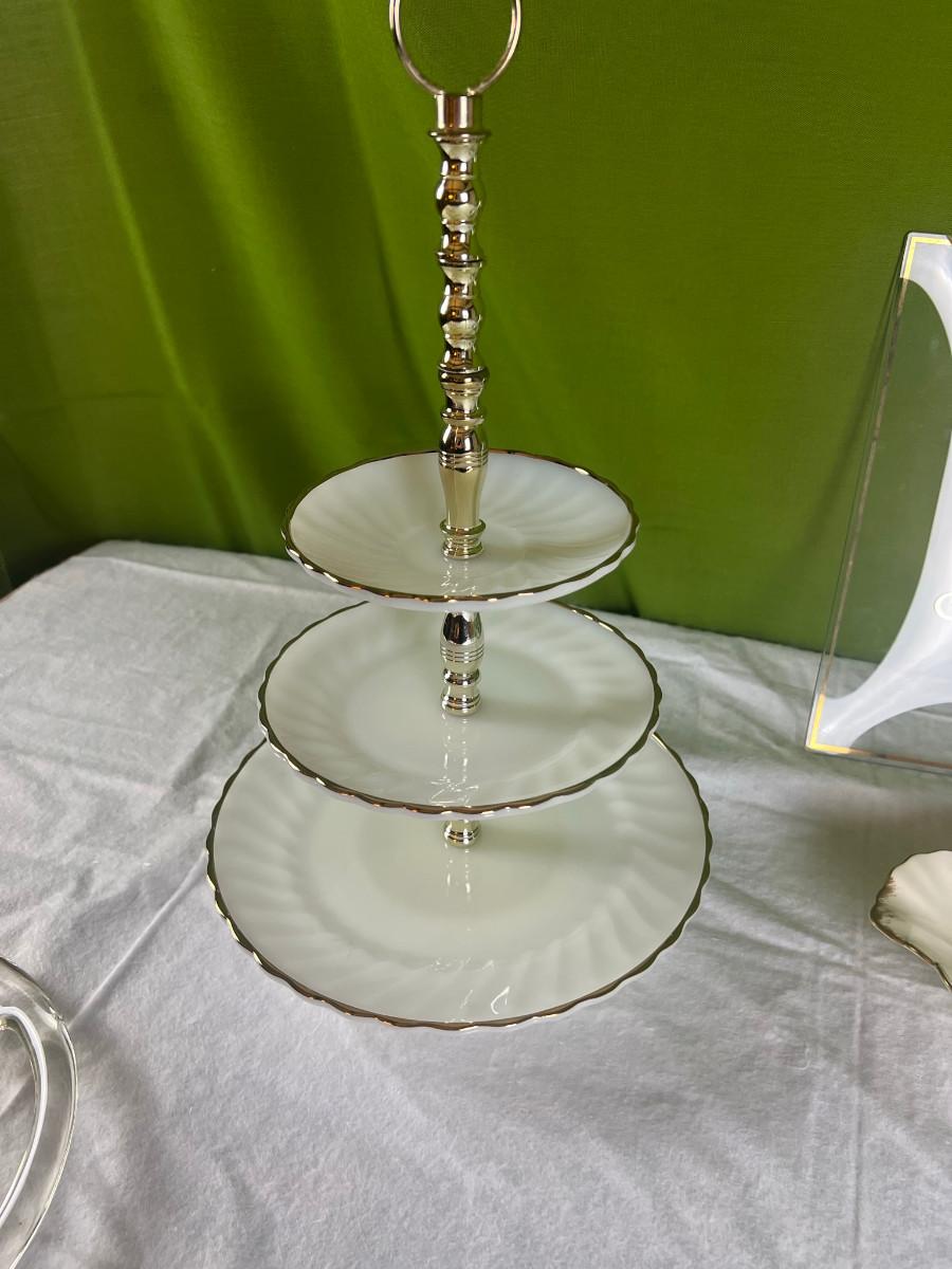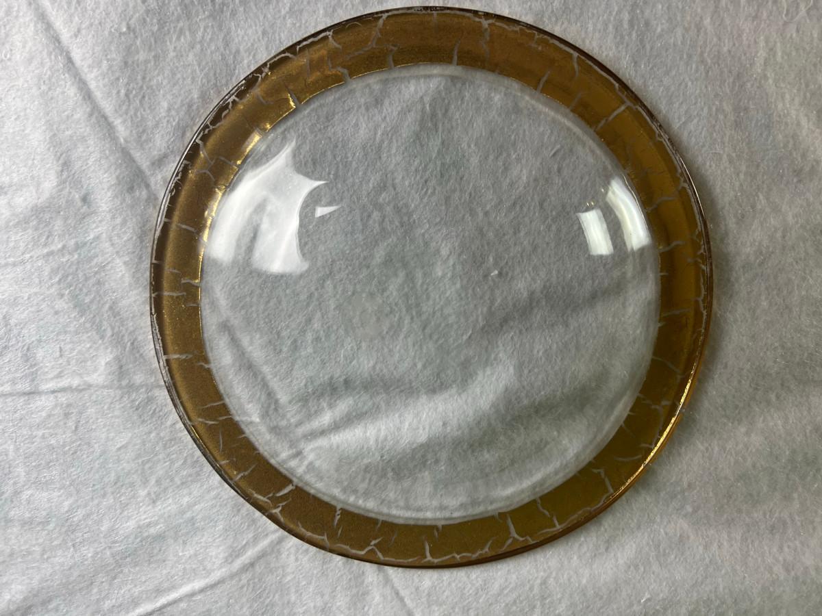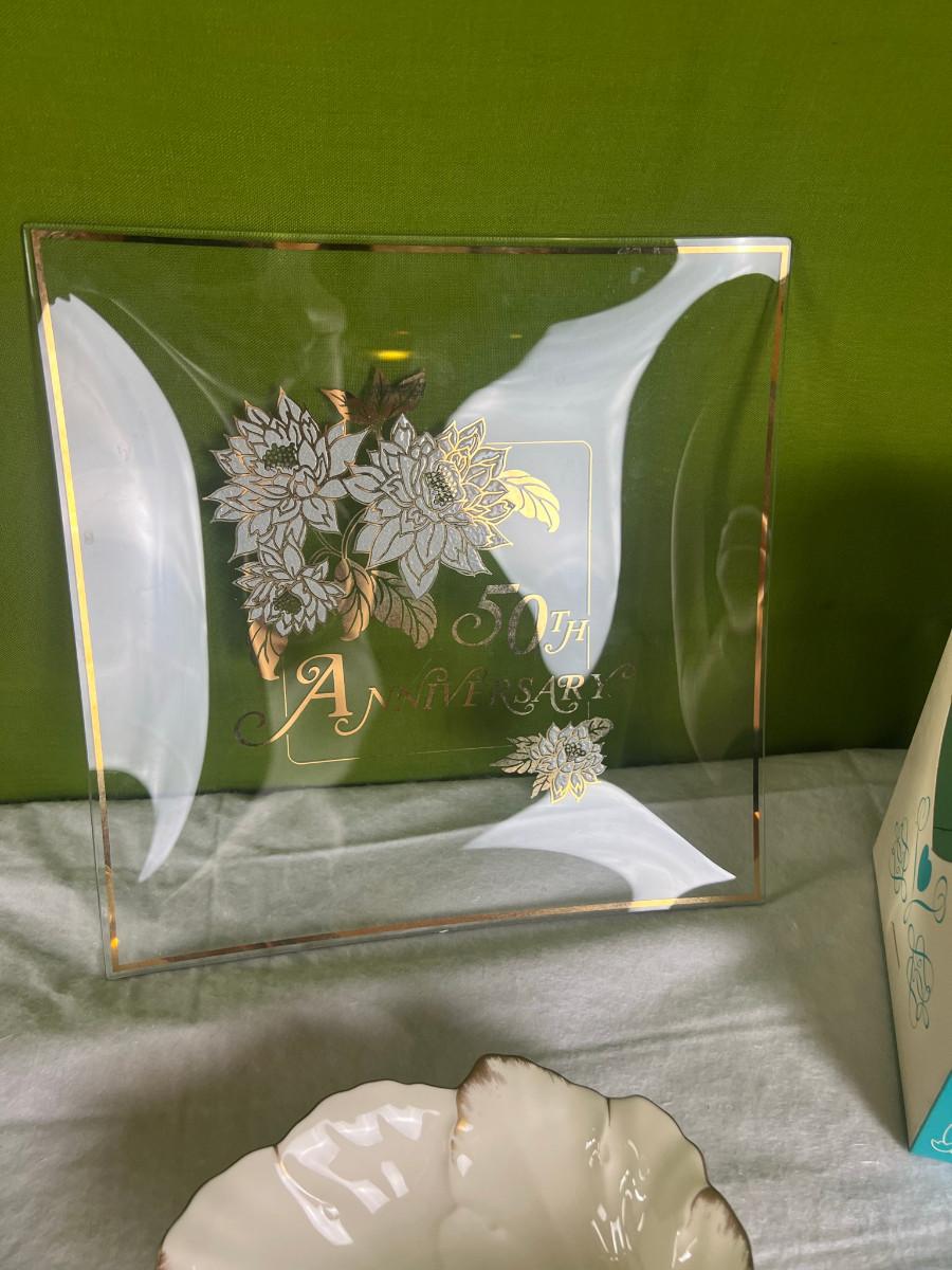 Platter 16.5" x 11" some gold missing divided platter, Plate 8.5" crackle gold around edge made in Italy Christallerie, Plate 6" diameter 24kt edge made in Japan, bowl leaf 2" x 5.5" x 8", layered plate gold edges and comes apart for storage, Anniversary plate, and cake topper