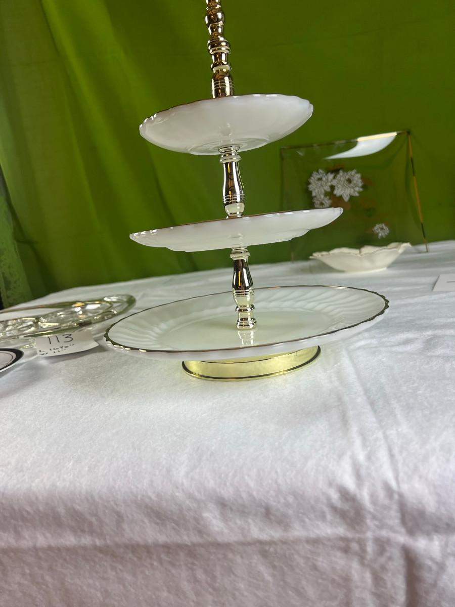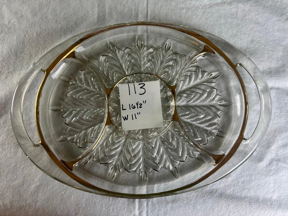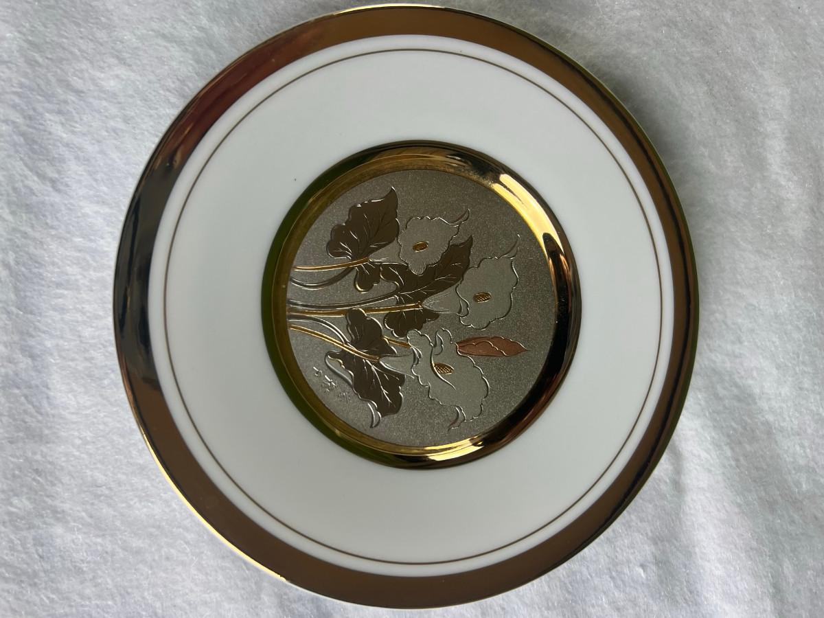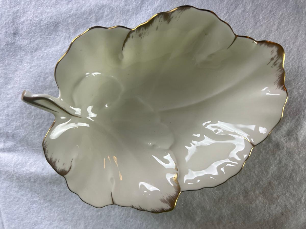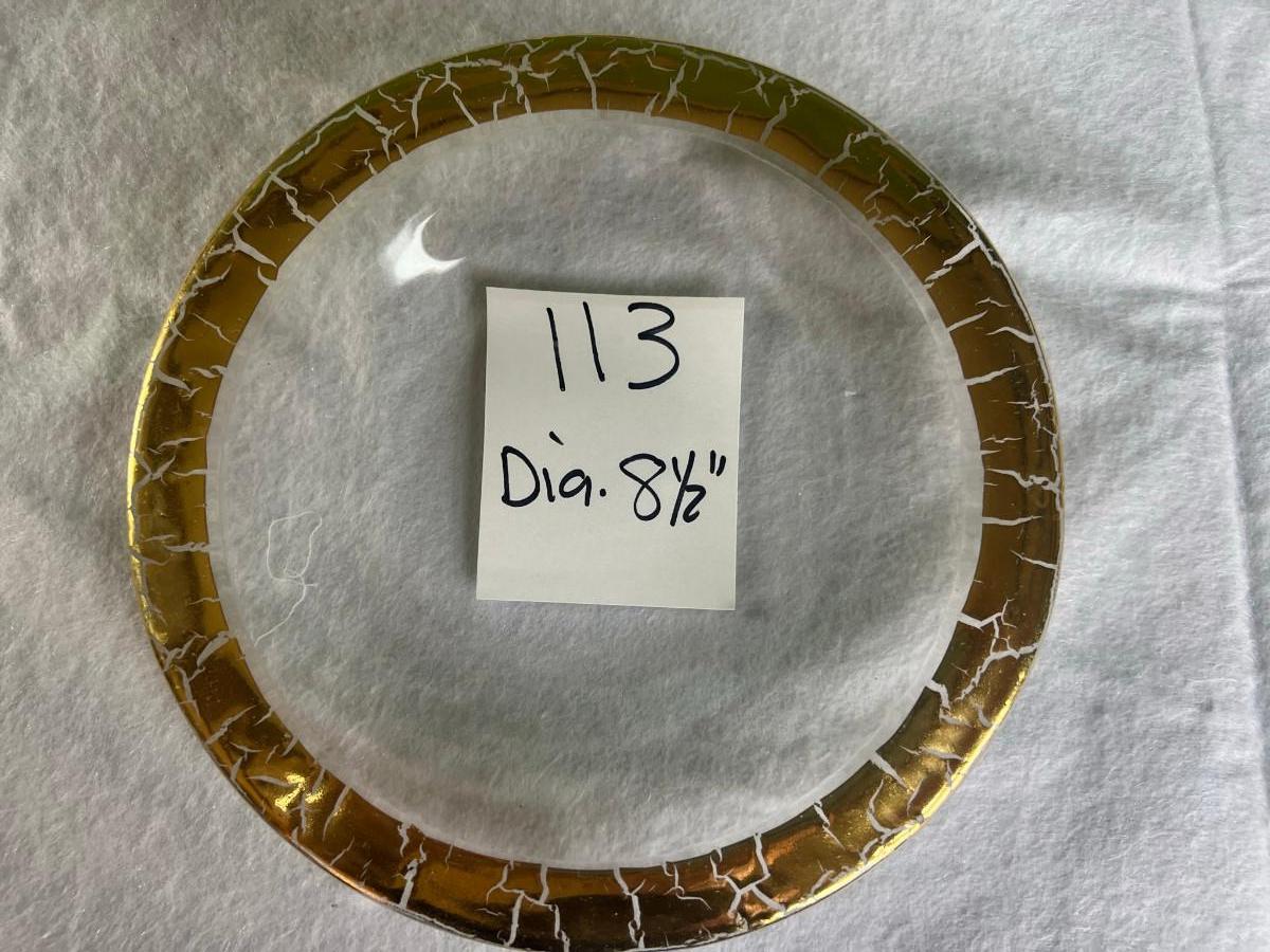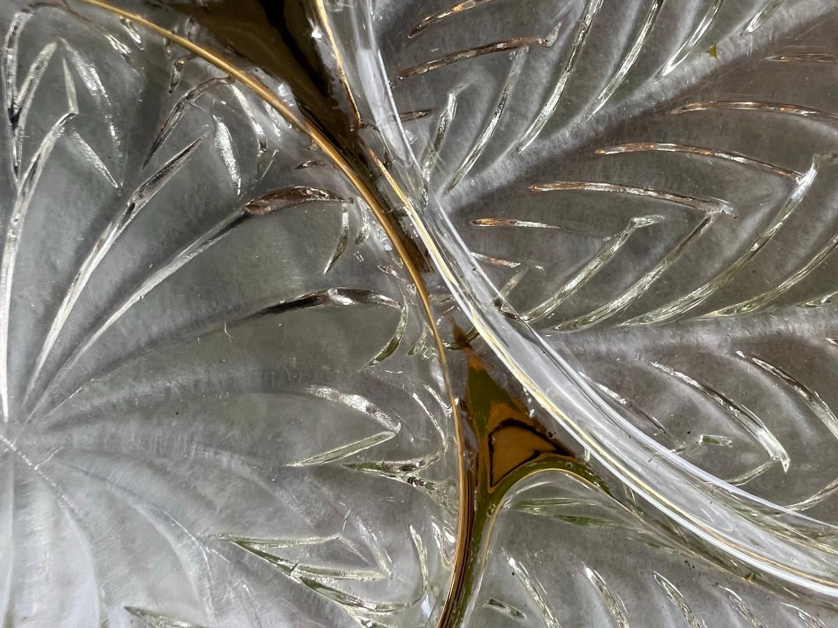 Platter 16.5" x 11" some gold missing divided platter, Plate 8.5" crackle gold around edge made in Italy Christallerie, Plate 6" diameter 24kt edge made in Japan, bowl leaf 2" x 5.5" x 8", layered plate gold edges and comes apart for storage, Anniversary plate, and cake topper