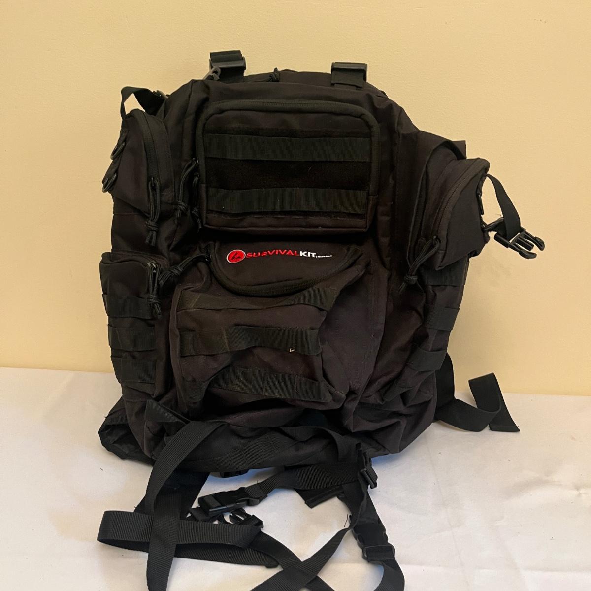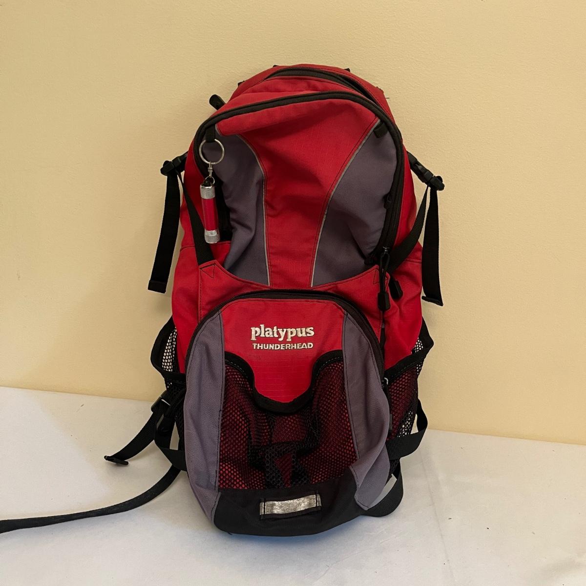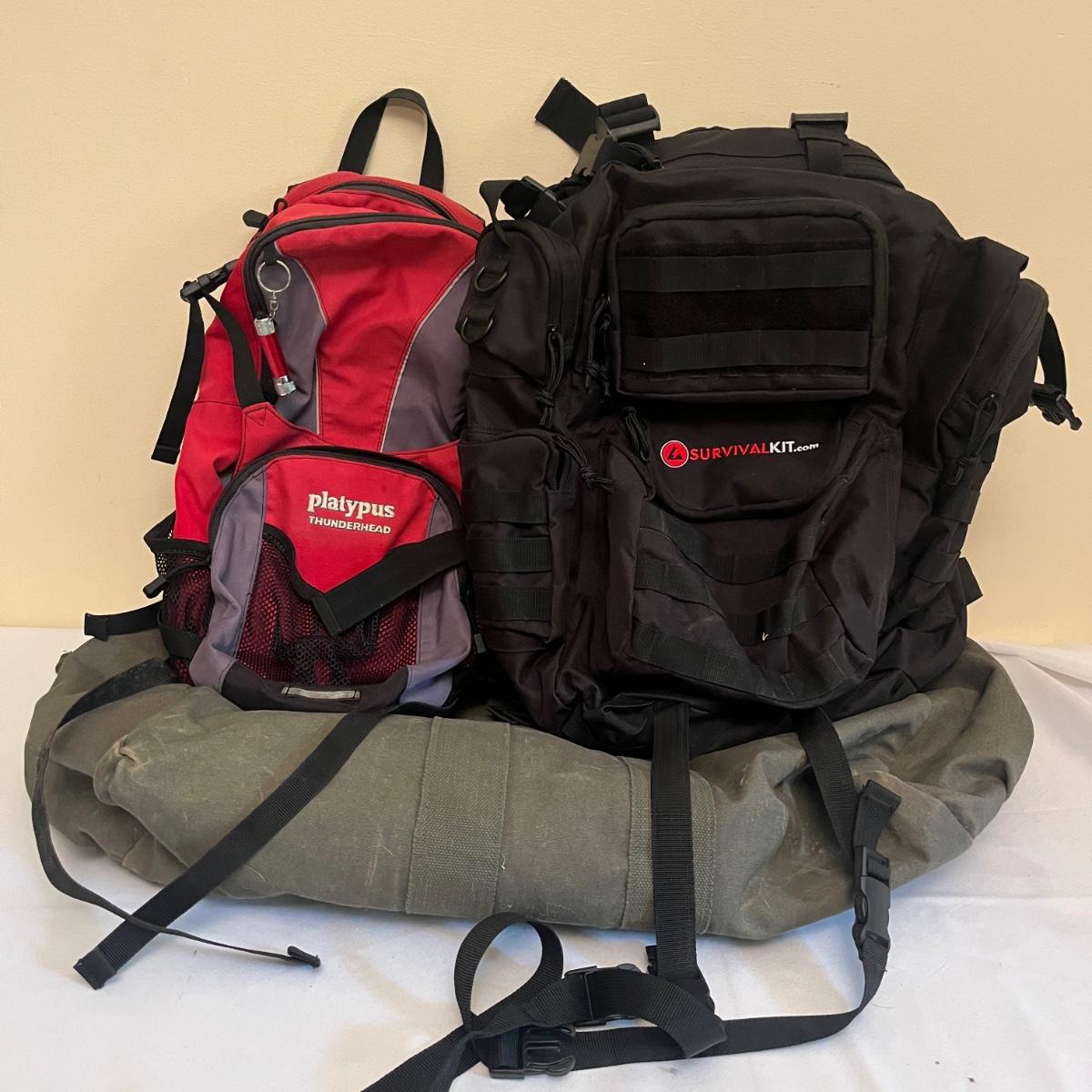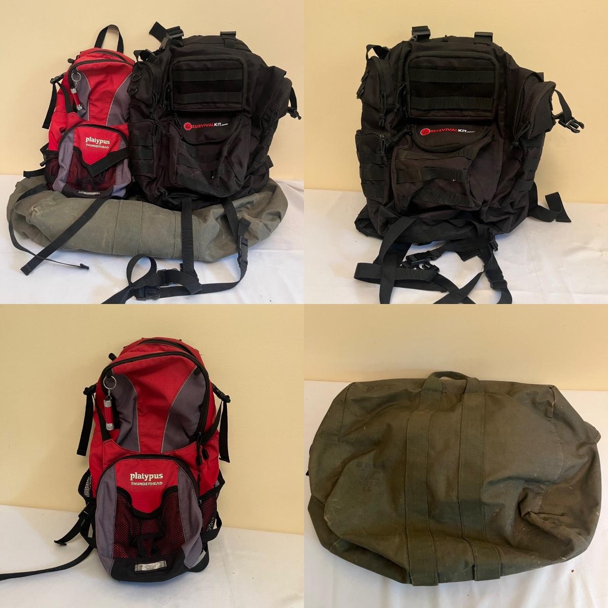 Lot includes a Platypus Thunderhead backpack, Survival Kit backpack and one army style canvas bag. Canvas bag measures 22” x 12” x 22”H. Bag has writing and a stain, see pictures.