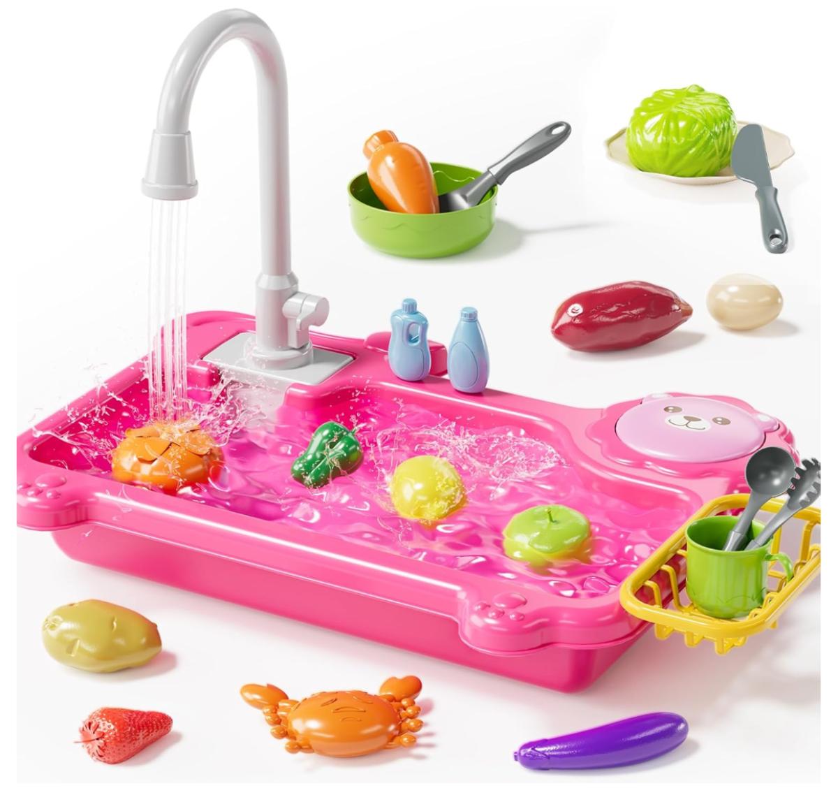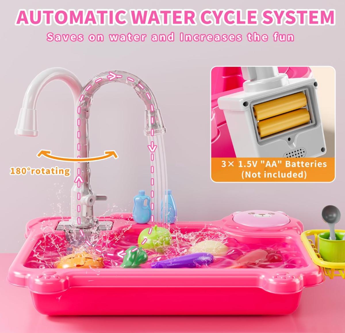Play Sink with Running Water, Kitchen Sink Toys with Electric Faucet, Play Kitchen Accessories, Kids Role Play Dishwasher Toy for Ages 3 4 5 6 Year Old Toddlers Kids Boys Girls(Pink)