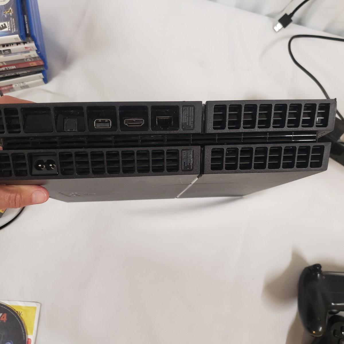 The PlayStation 4 model #CUH-1215A comes with 2 wireless remote controls and a motion controller. There are also 10 games, 9 of which are still in the box. The device and all the accessories worked when plugged in.