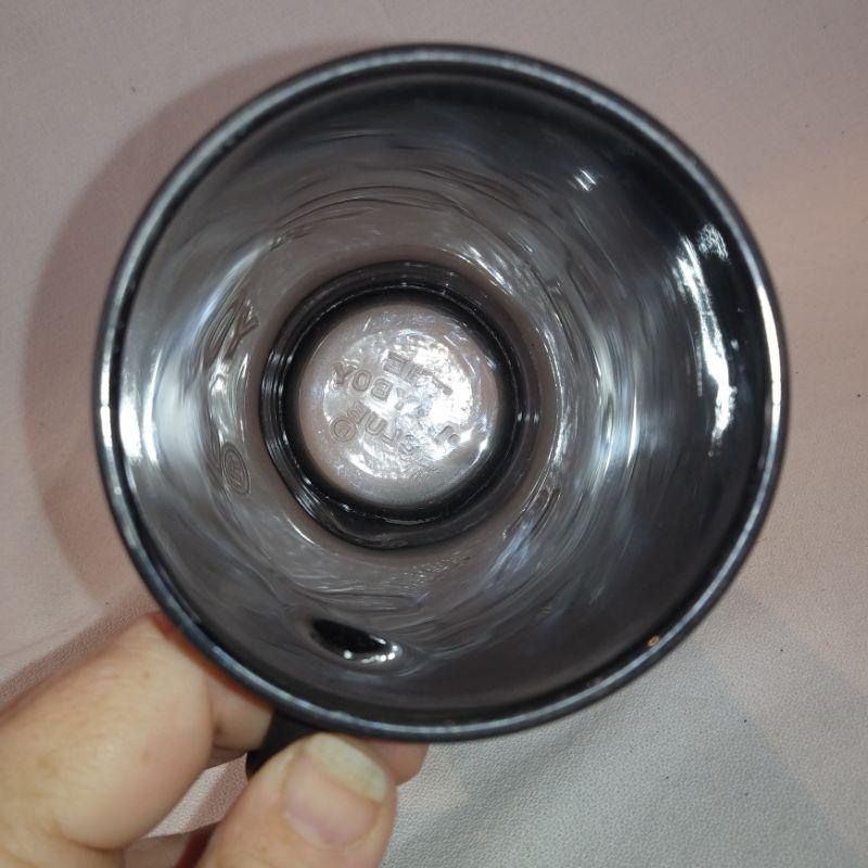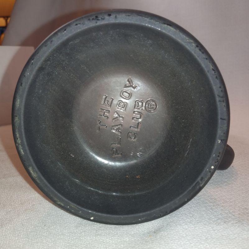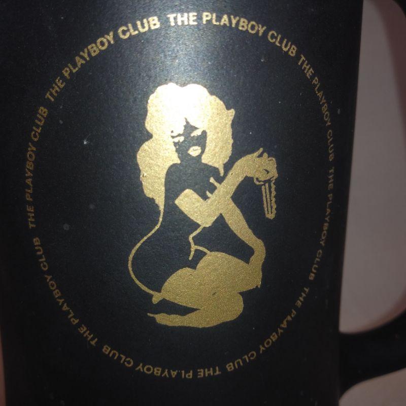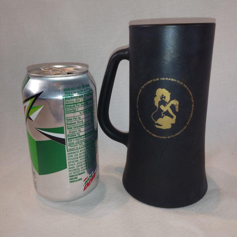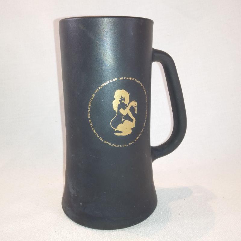 This offering is a vintage Playboy glass beer mug with black mat coating, gold lettering and playgirl logo. The clear glass bottom also says playboy club in raised letters. It is 6-1/2-inches tall X 3-1/2-inches in diameter. In very good condition, no cracks or chips. It's ready for a cold, tall one.