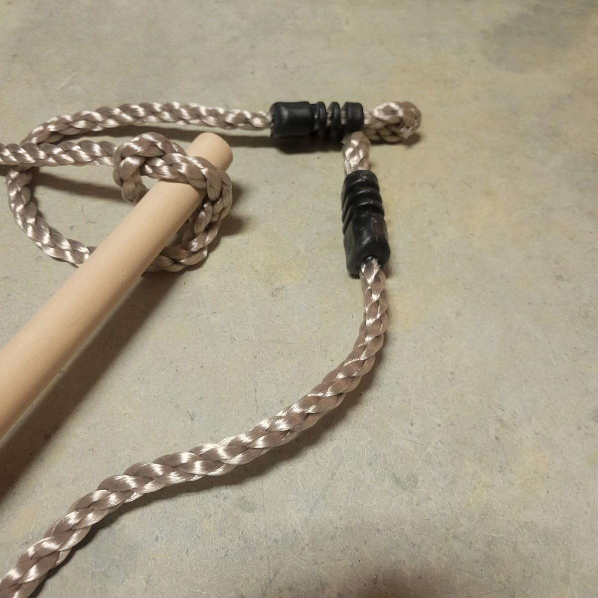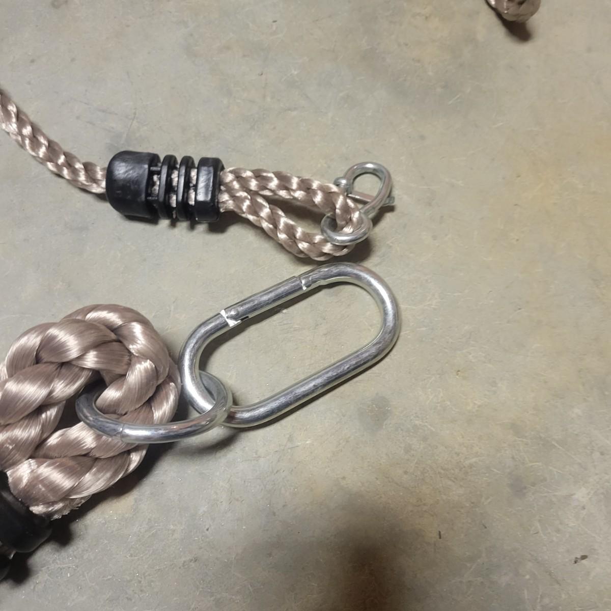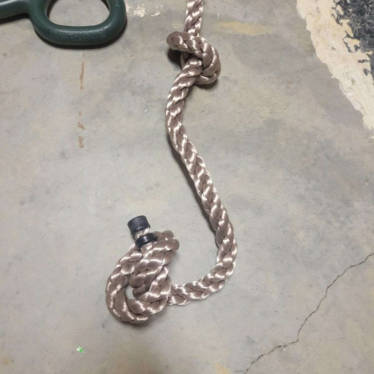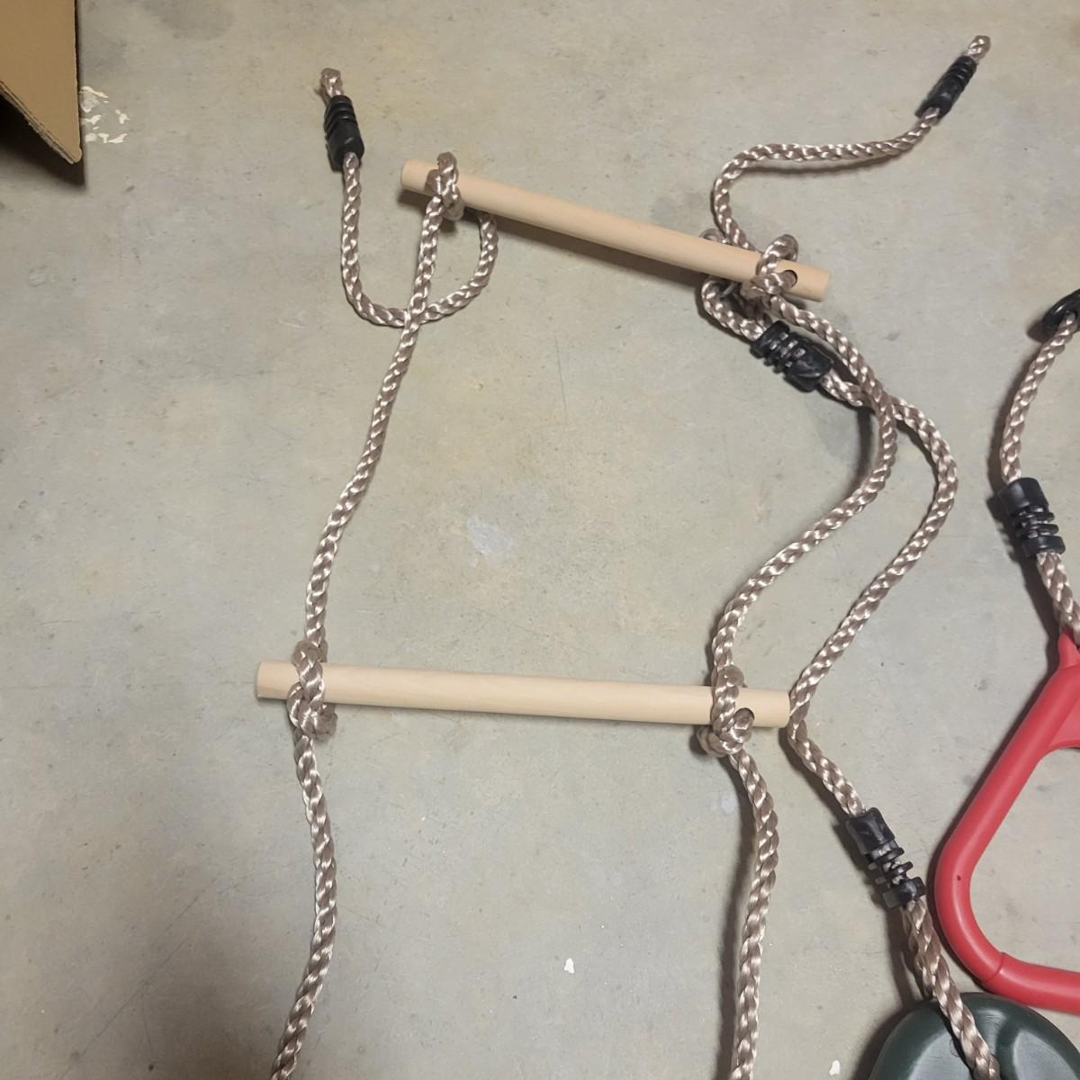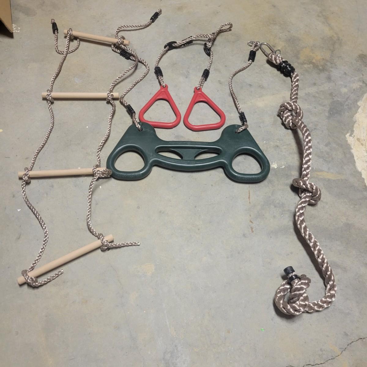 An assortment of playground accessories that appear to be unused. Included is a climbing rope that measures 56" in length, a rope ladder, red hand stirrups, and more. Shipping available