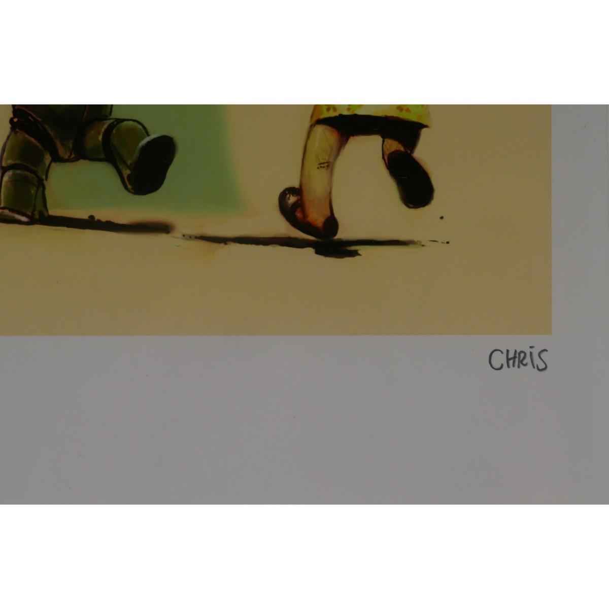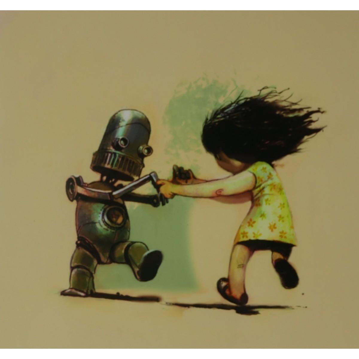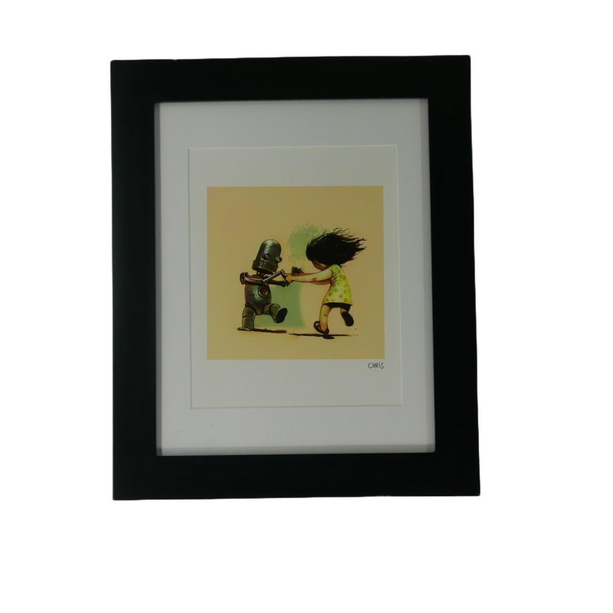Art of Robot and girl holding hands and playing. Signed "Chris" in pencil on bottom right. Professionally framed and matted. In excellent condition! Art measures 7" x 6.5", total frame measures 13.75" x 16.75" x 0.5". (A45)