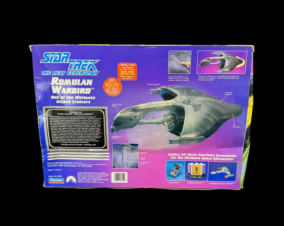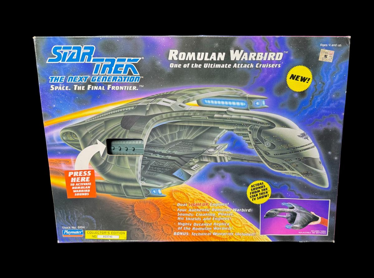 Created in 1993, this has four authentic sounds, such as cloaking, phaser, hit shields, and engines. It has dual light up engines. It is a highly detailed replica of a Romulan Warbird. In the original box. Pre-auction estimate: $50-$100.