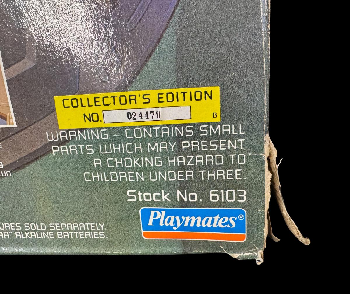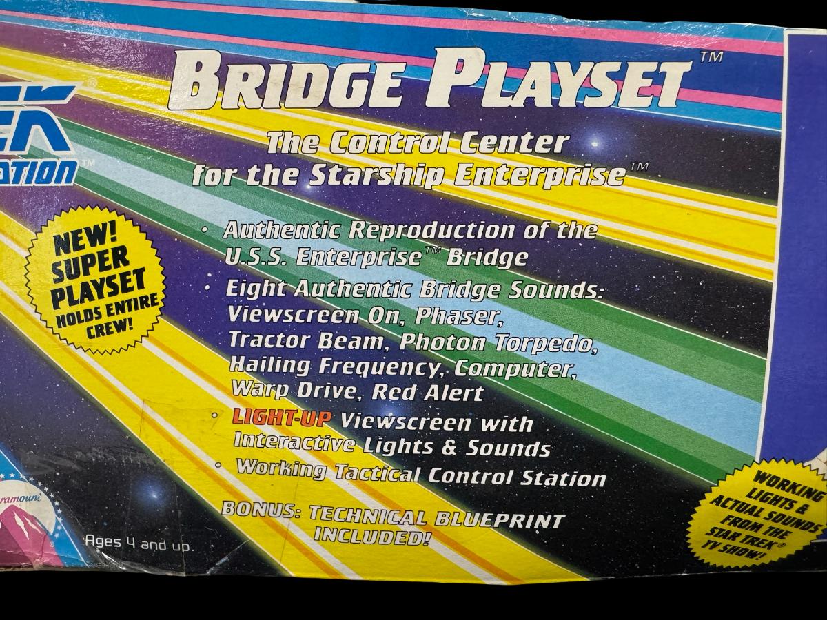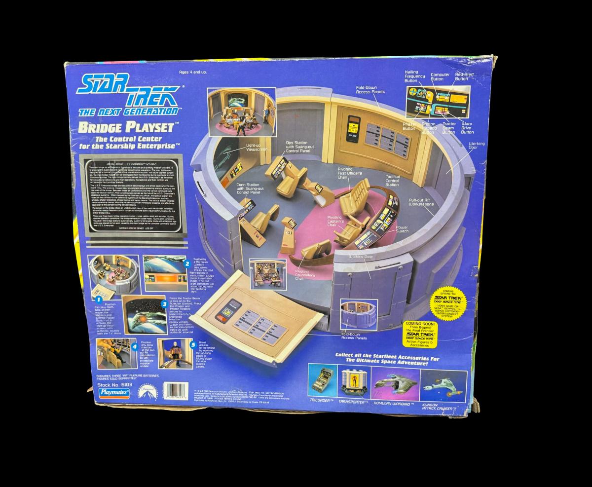 This is a reproduction of the U.S.S. Enterprise bridge, and features lights and sounds from the TV show. It is new in the box, but the box has storage related wear. Pre-auction estimate: $150-$200.