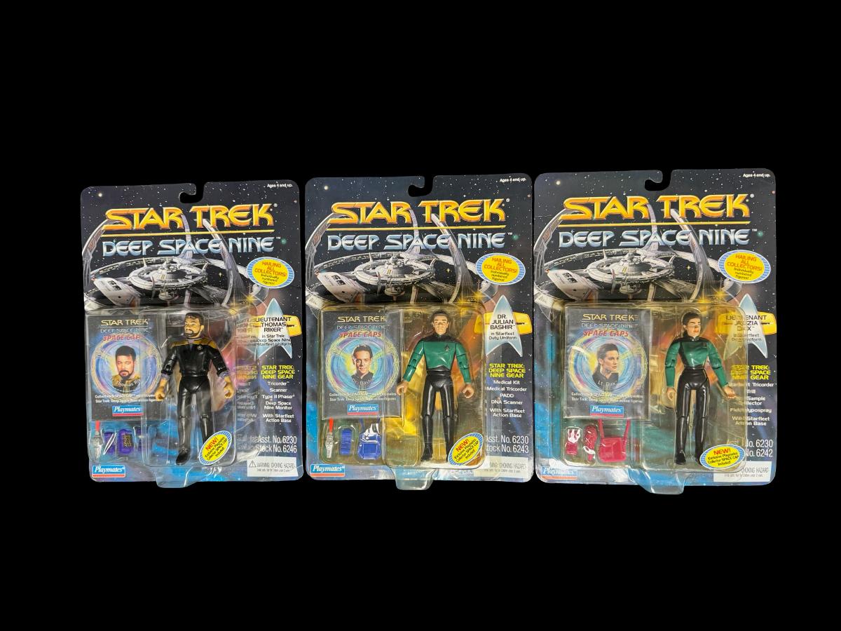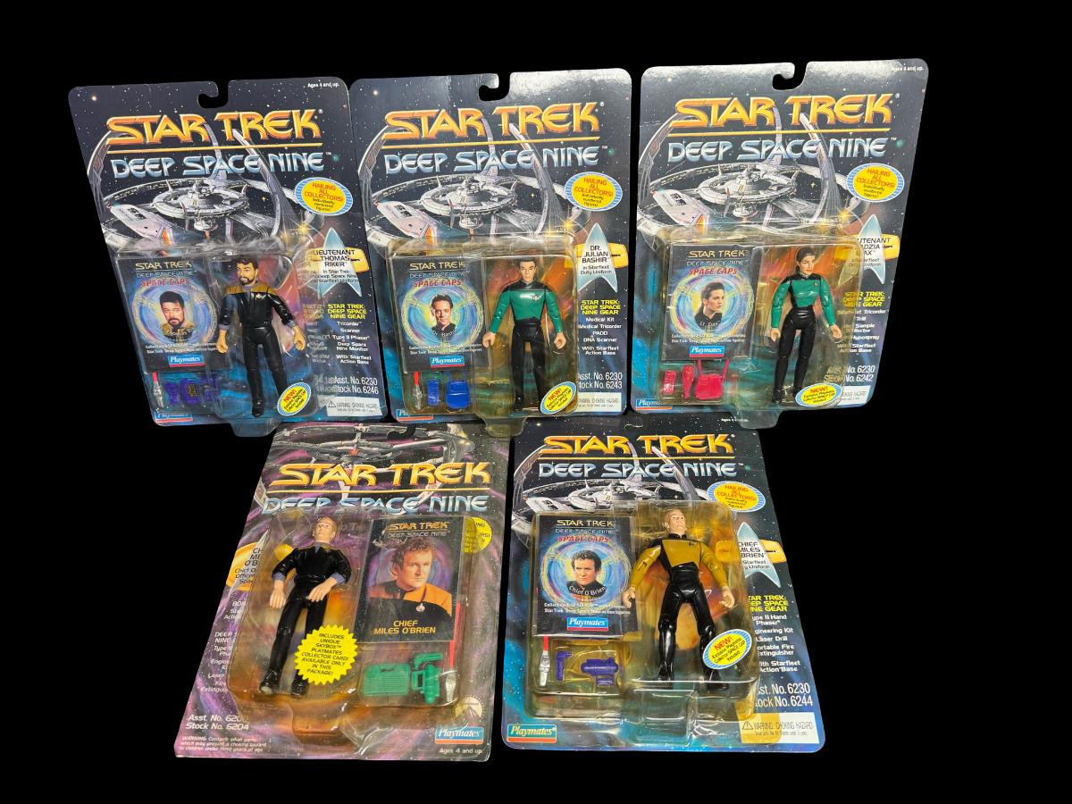 NOS. Includes Chief Miles O’Brien (x2), Lieutenant Jadzia Dax, Lieutenant Thomas Riker, and Dr. Julian Bashir. Total of five pieces. Each five-inch figure includes a collector card and accessories. In the original unopened packaging.