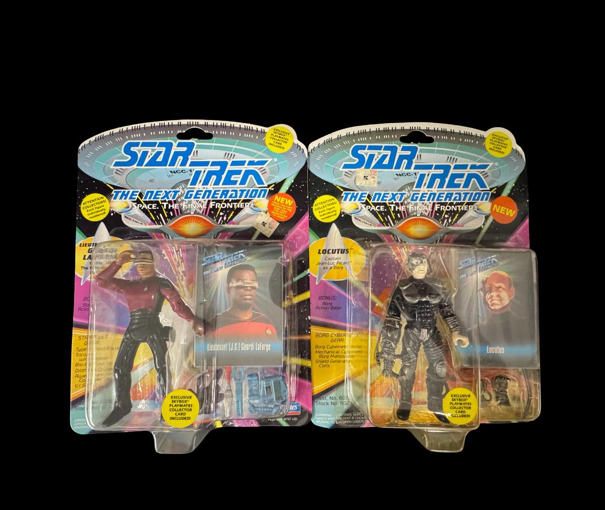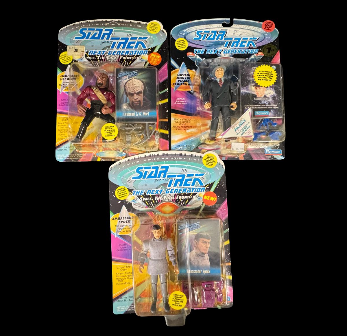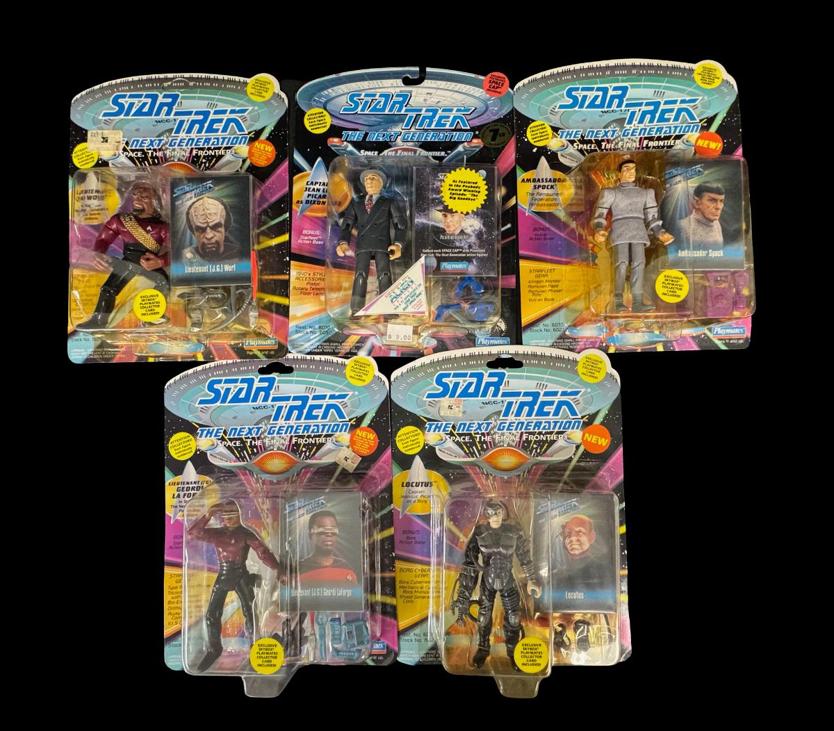 NOS. Includes Lt. (JG) Geordi La Forge, Locutus, Ambassador Spock, Captain Jean Luc Picard as Dixon Hill, and Lieutenant (JG) Worf. Total of five pieces. Each five-inch figure includes a collector card and accessories. In the original unopened packaging.