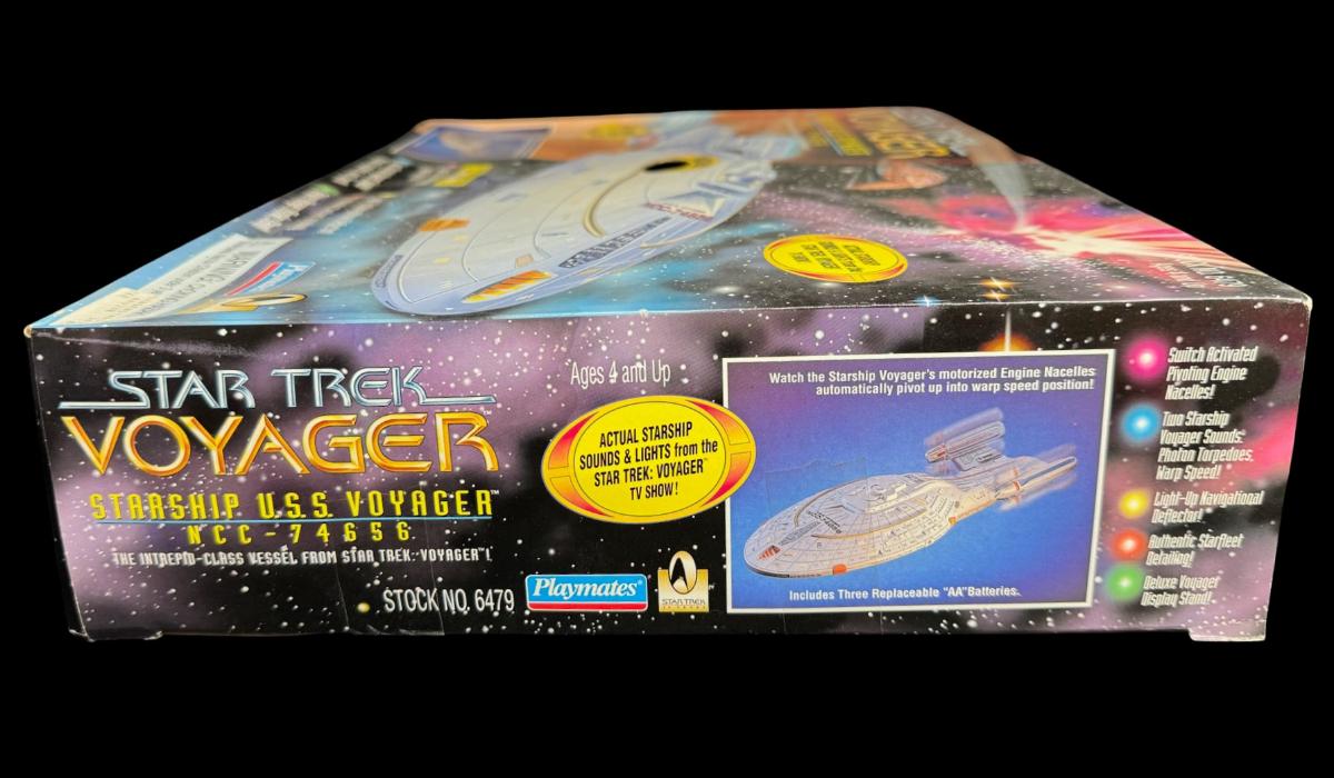 This piece was produced in 1995. It includes lights, and actual starship sounds (photon, torpedoes, and warp speed). From the Star Trek Voyager TV Series. In the original box. Not tested. Pre-auction estimate: $300-$400.