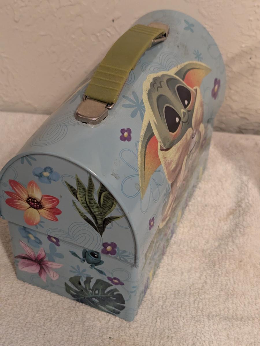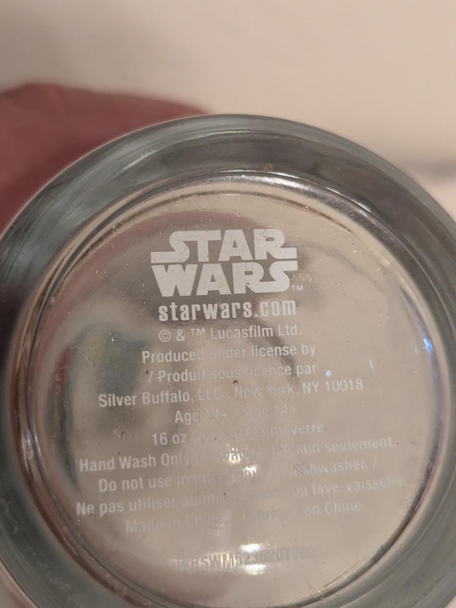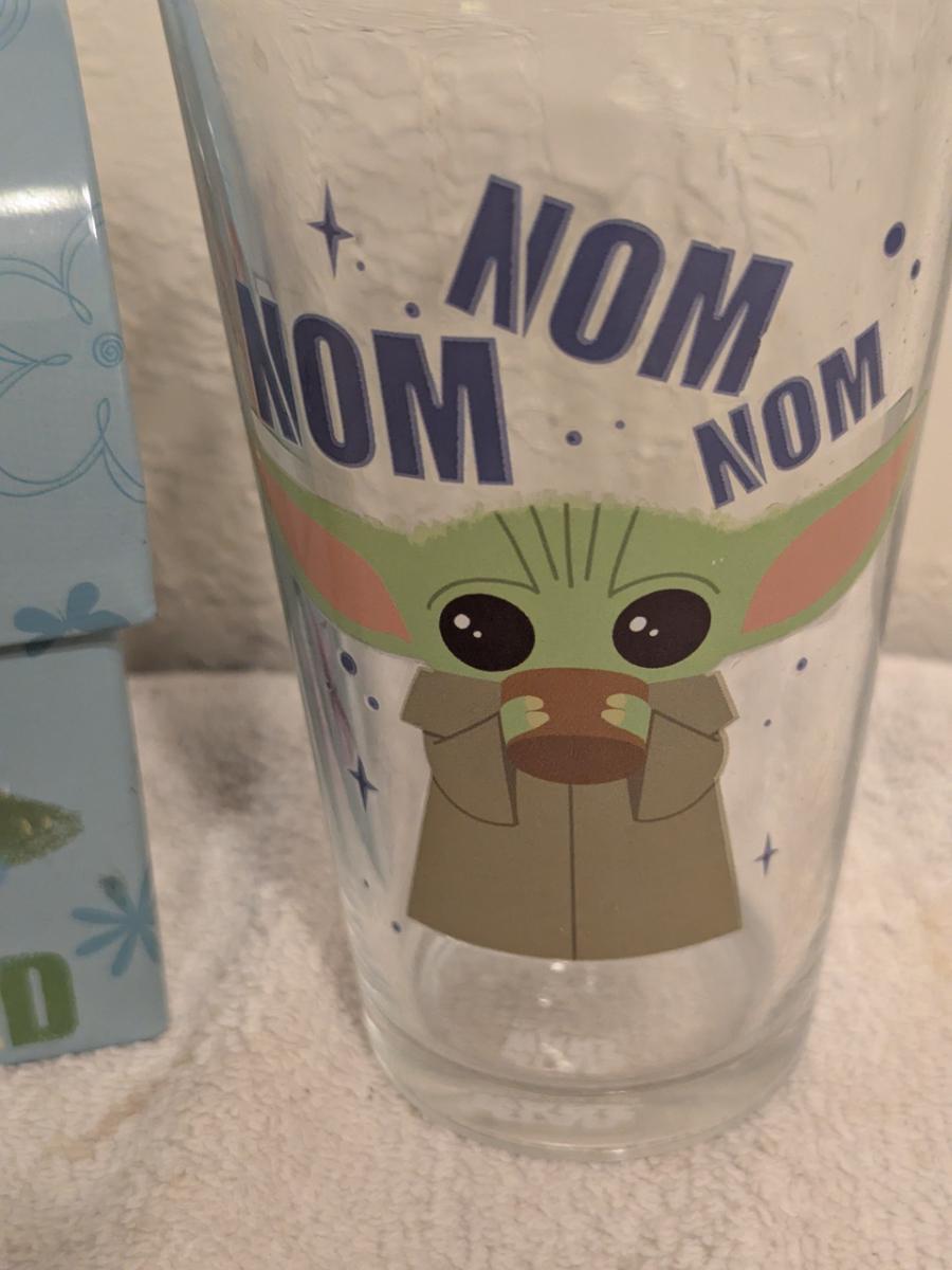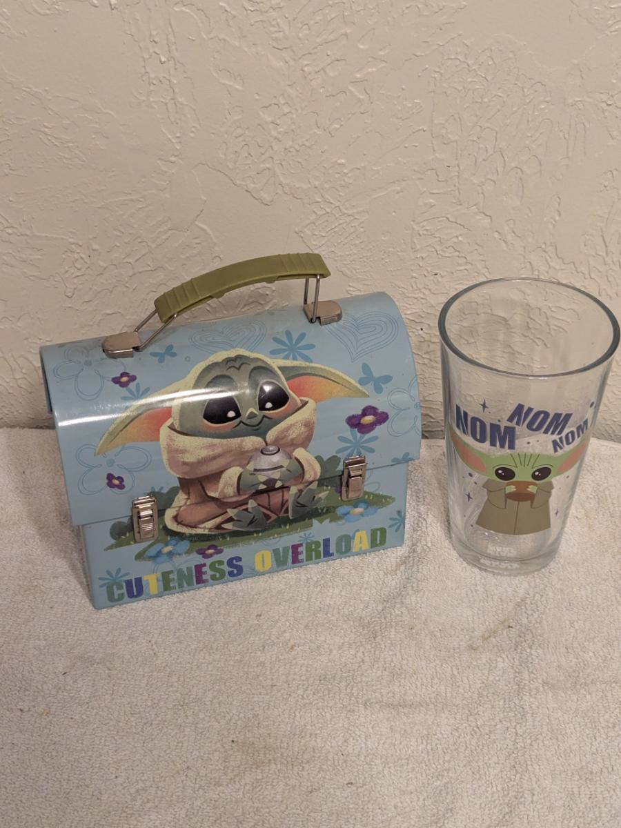 Star wars the Mandalorian the child Grogu tin box and one drinking glass.