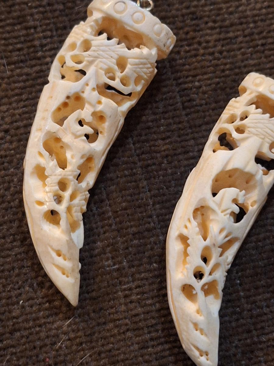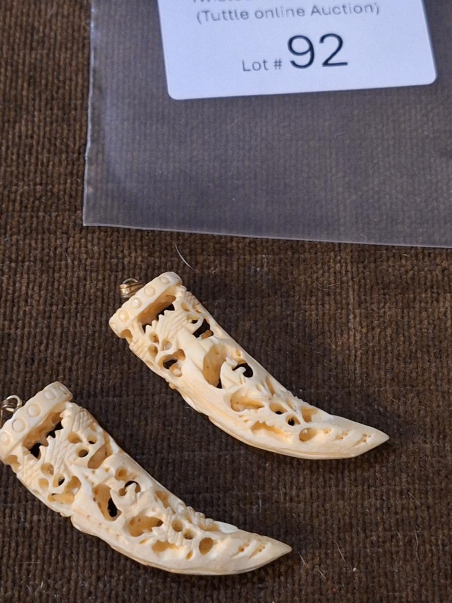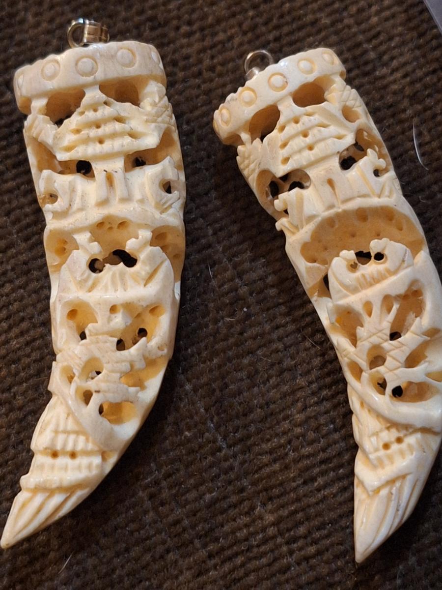 set of 2 carved hippos teeth- we aren't sure how to verify this- they are part of an estate and simply were in a Ziplock back labeled hippo. It looks like they seller might have paid $400 for them in the 70s or 80s from the scribbled notes- but again…we have no way to verify this. so please look over photos.