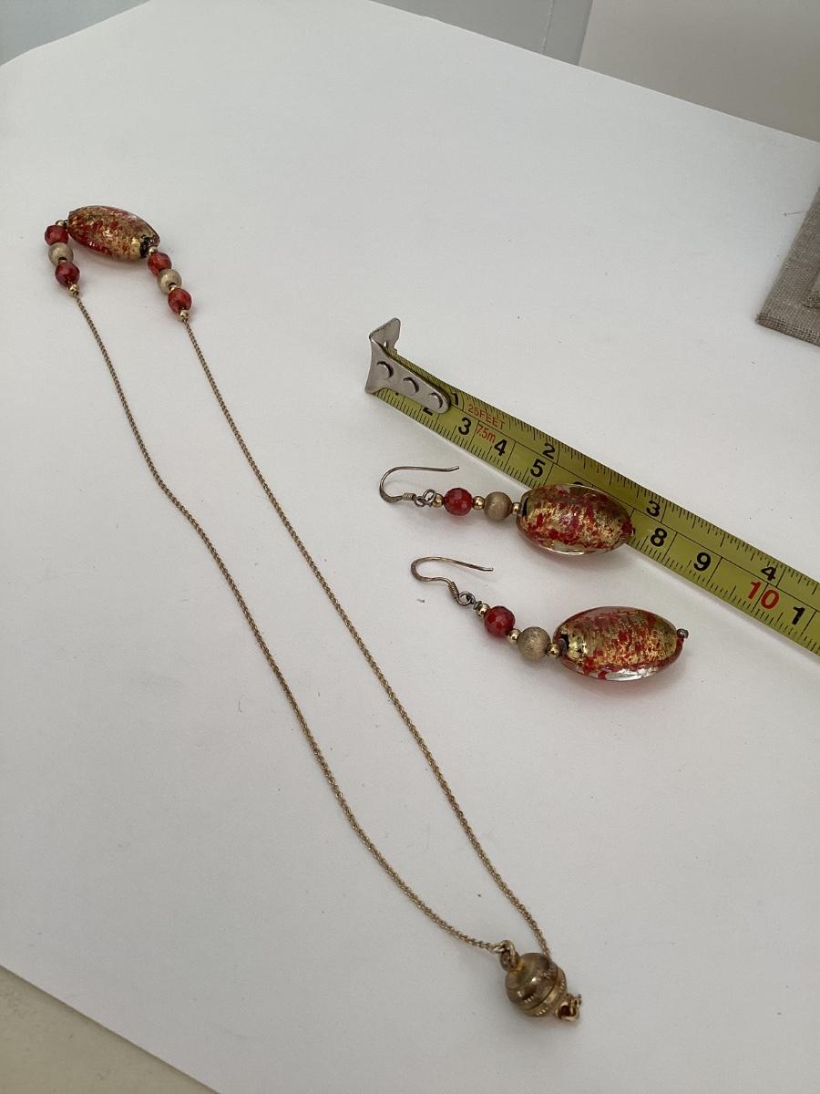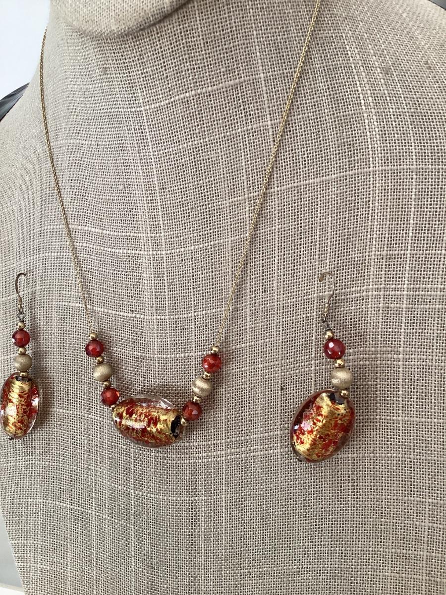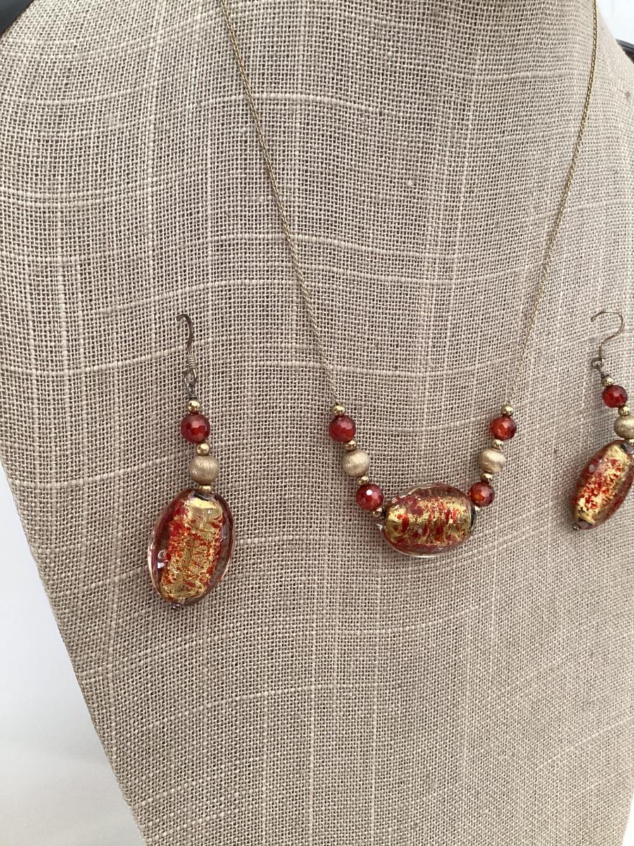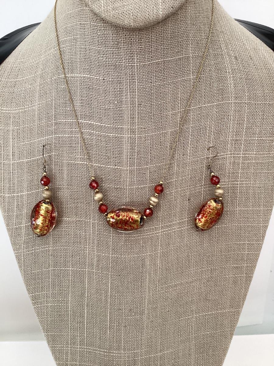 Vintage red and gold foil bead necklace and earring set
