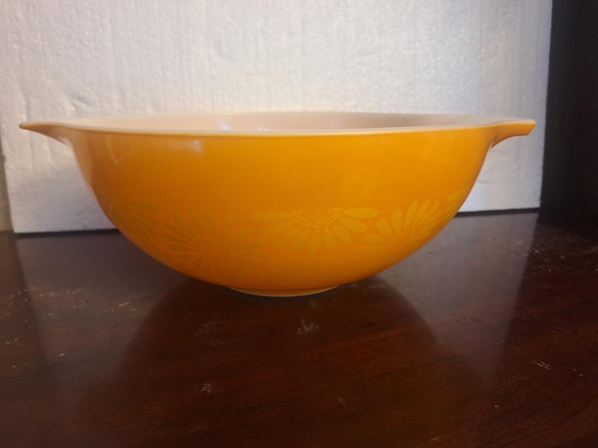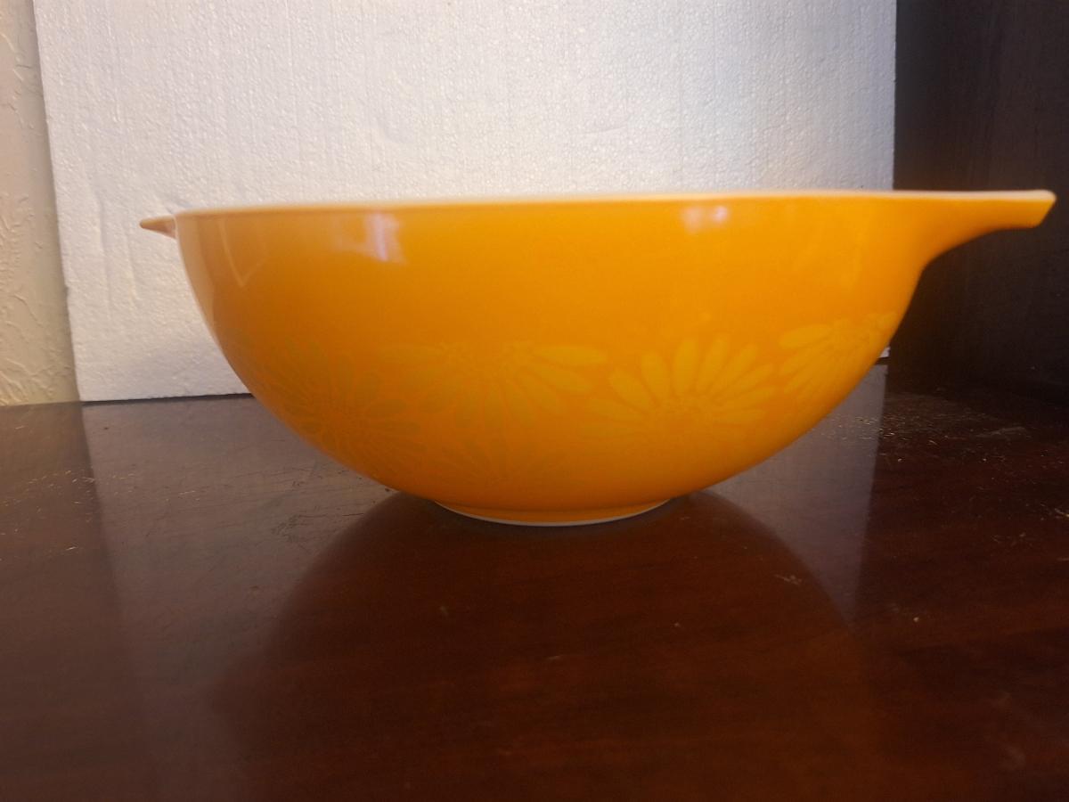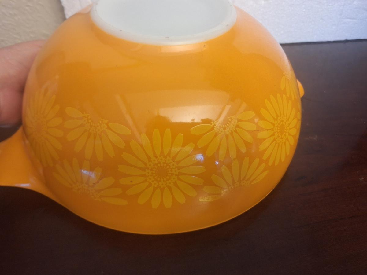 vintage Pyrex mixing bowl 4 sq #444 Orange yellow sunflower daisy Cinderella bowl