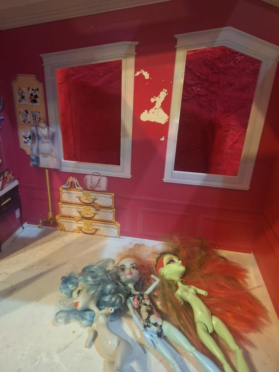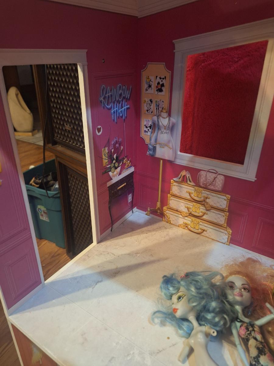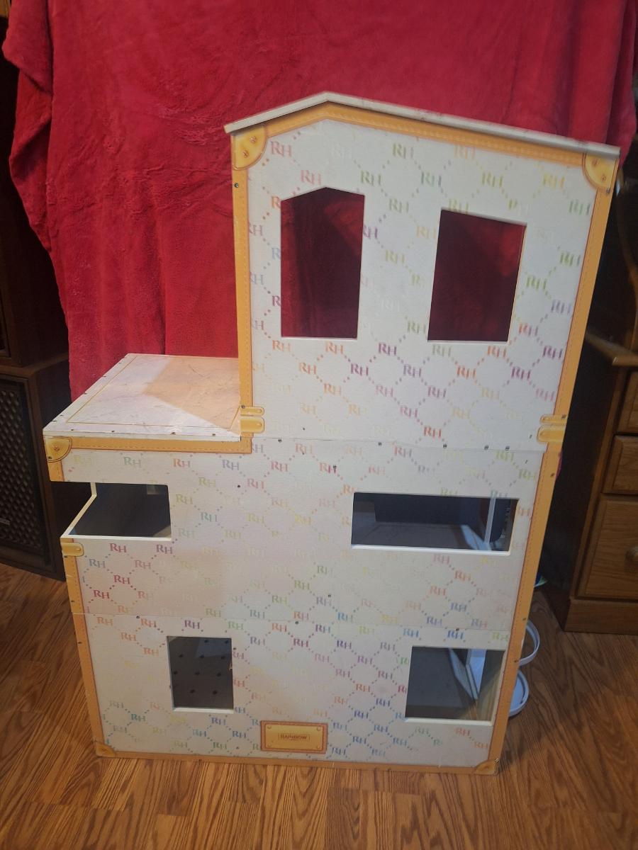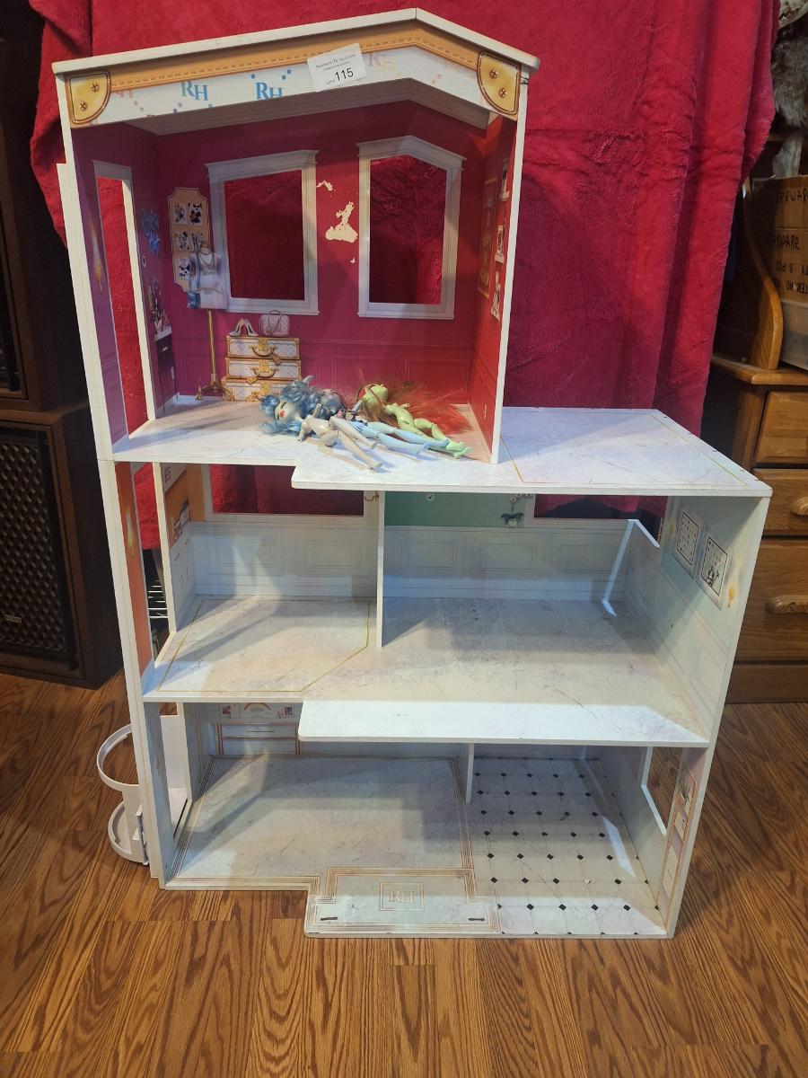 see all photos the doll house has some fading. The elevator will slide easily and will stay where you leave it. All of the dolls included have some damage or missing items. The doll house weights almost 40 pounds so come prepared to lift and load it. it will fit int he back of most SUVs but not likely in the trunk of a passenger car.