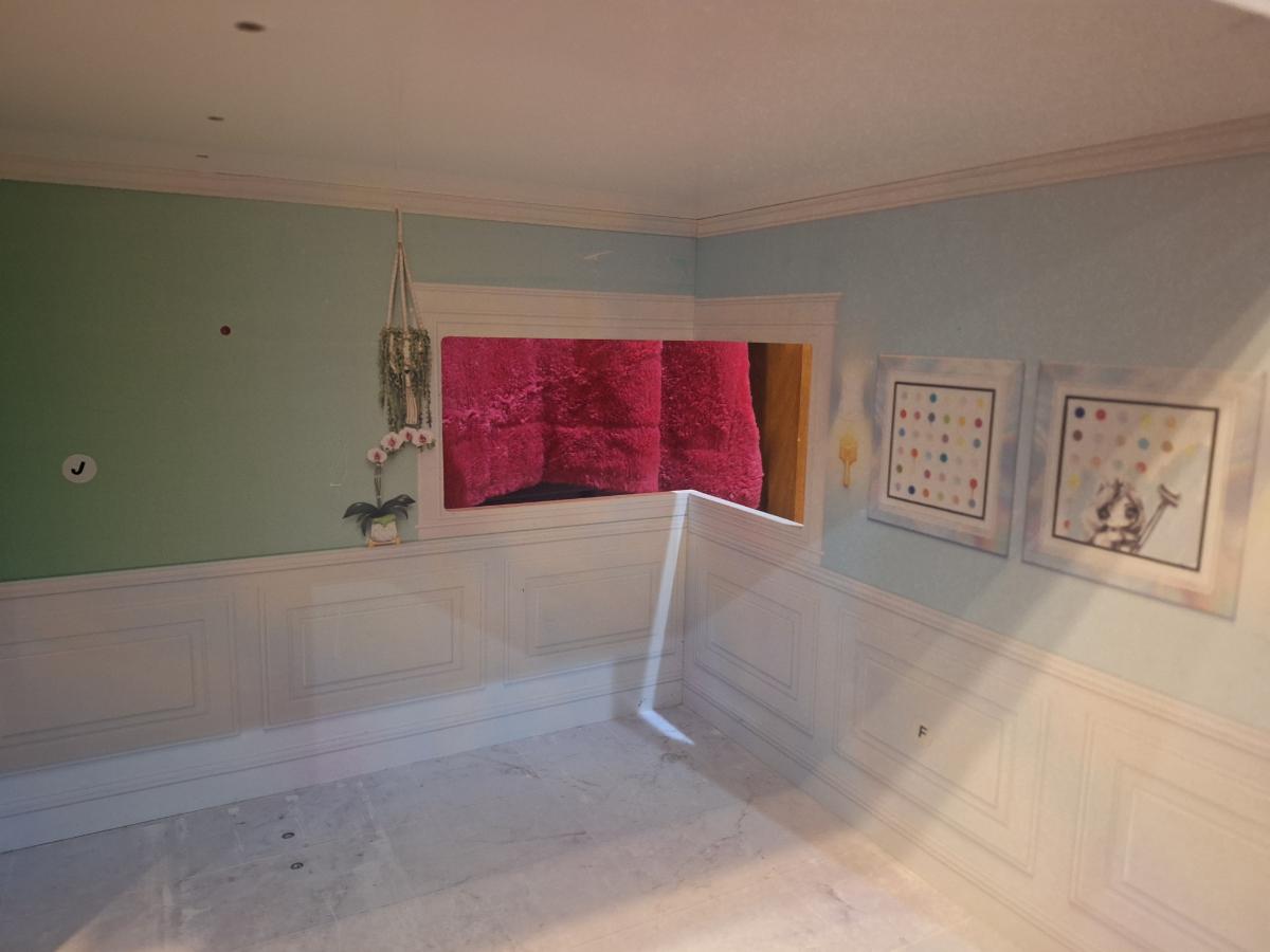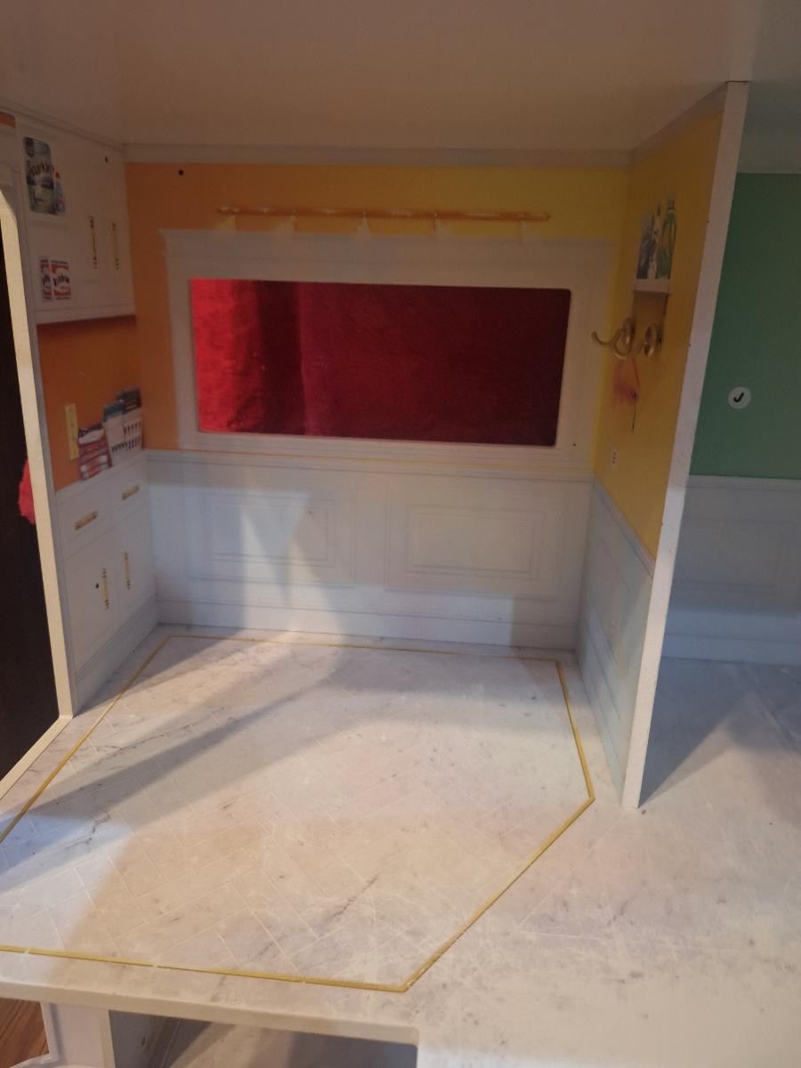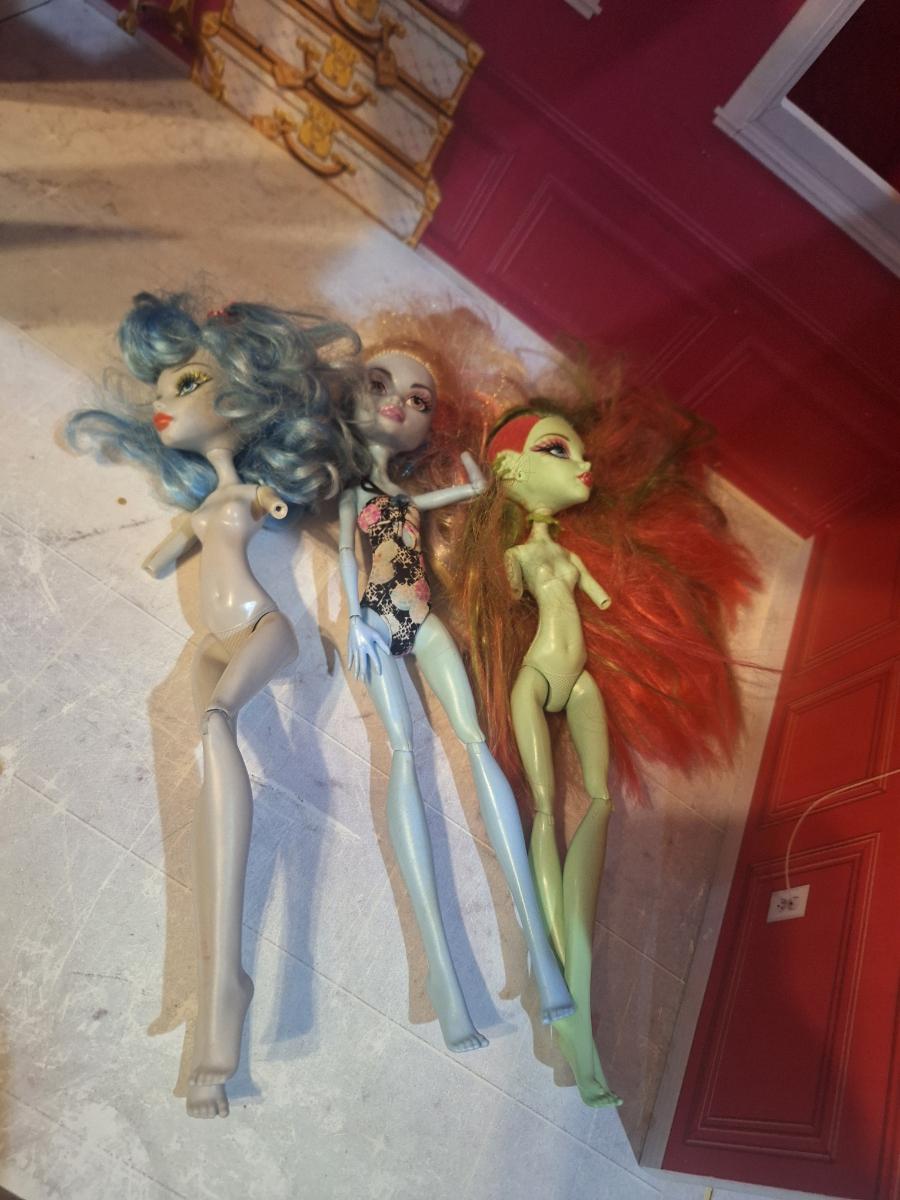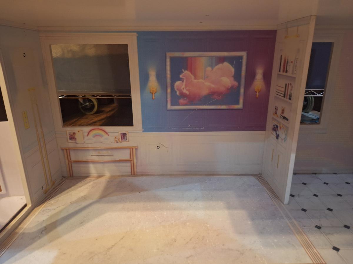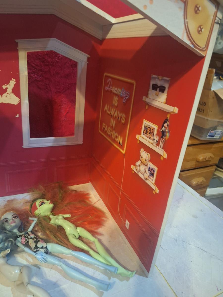 see all photos the doll house has some fading. The elevator will slide easily and will stay where you leave it. All of the dolls included have some damage or missing items. The doll house weights almost 40 pounds so come prepared to lift and load it. it will fit int he back of most SUVs but not likely in the trunk of a passenger car.