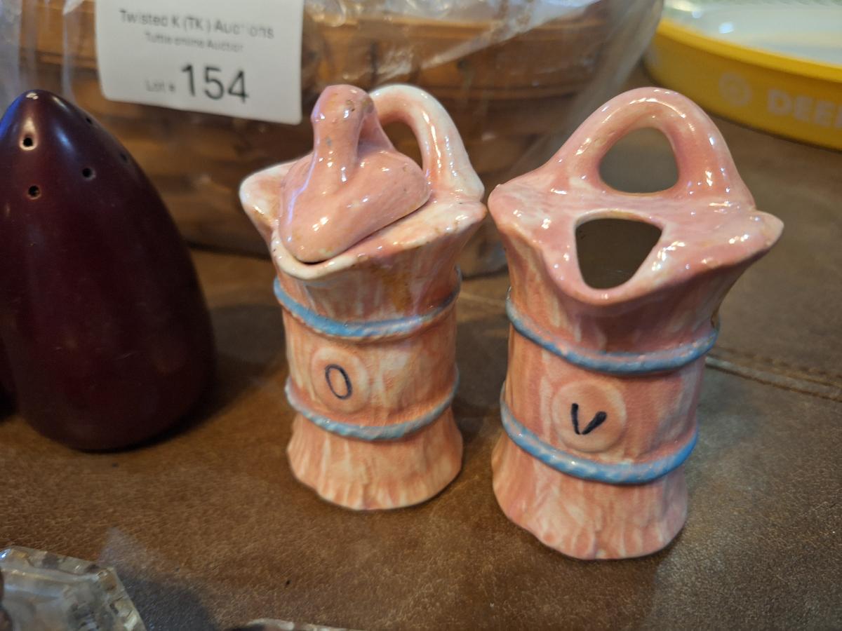 the oil and vinegar holders are the type that would hang from a ceramic donkey or ox that likely also had hanging salt and pepper shakers