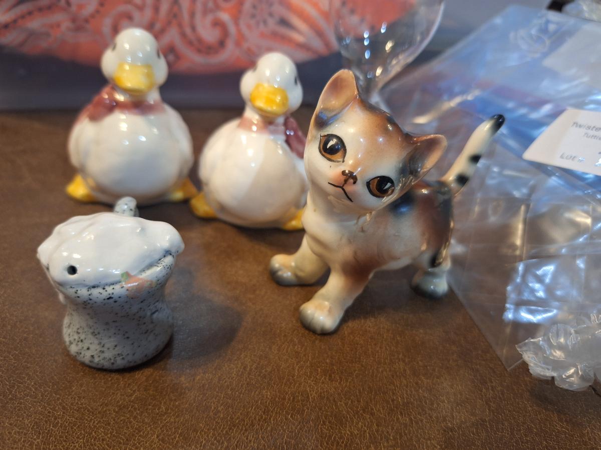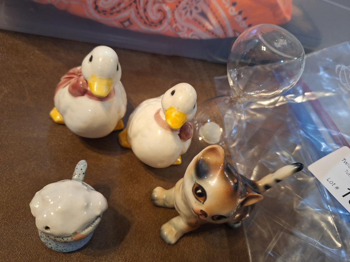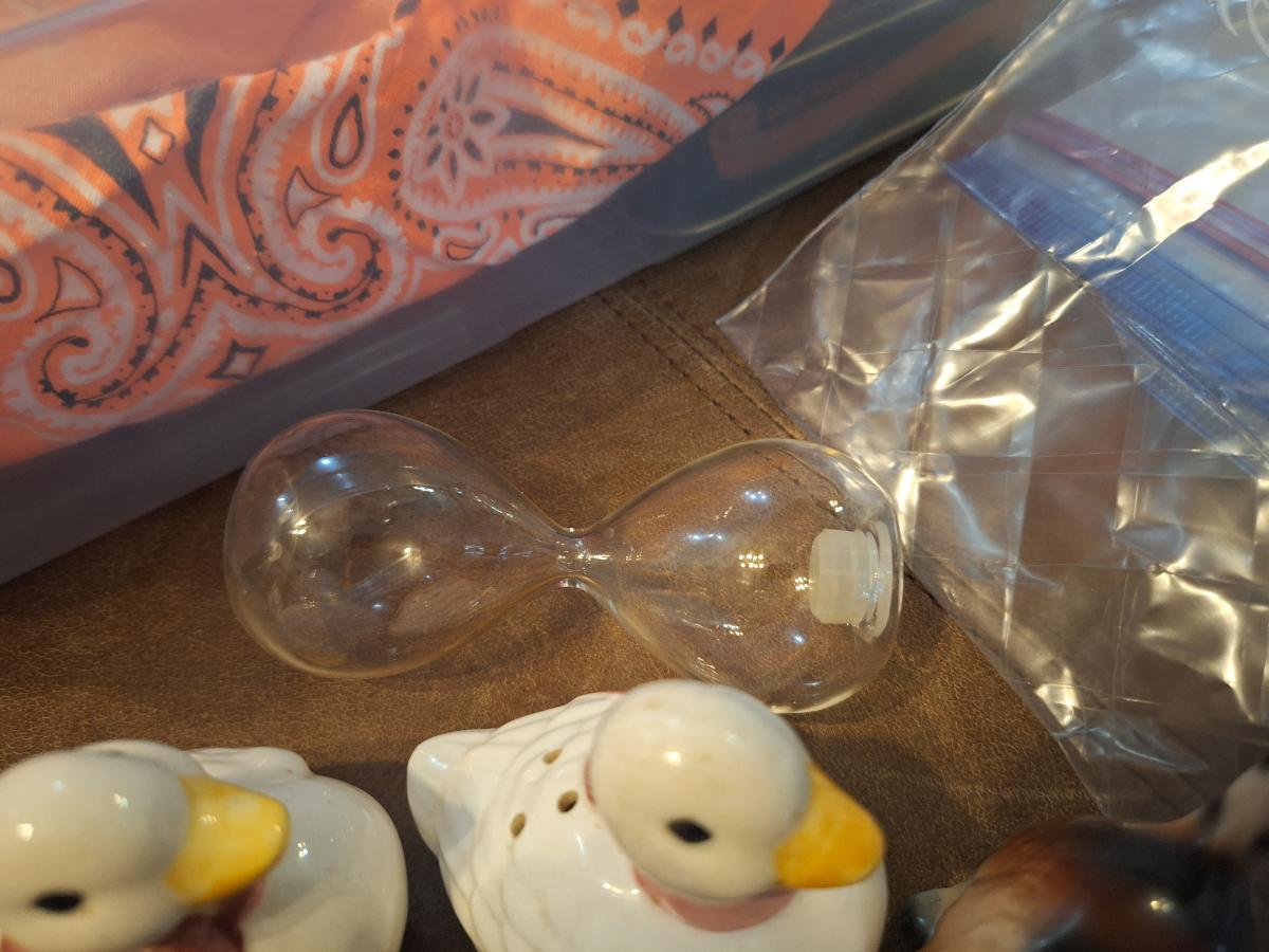 this lot has the clear hourglass one - that was separated from it's mate in another lot, but the lots are packed up, tagged and photos so it's staying separated. Watch the auctions to get the other lot.
