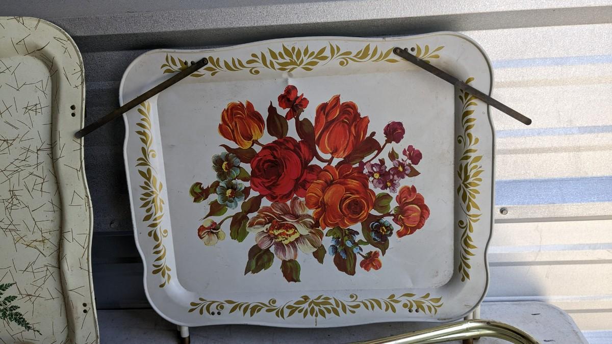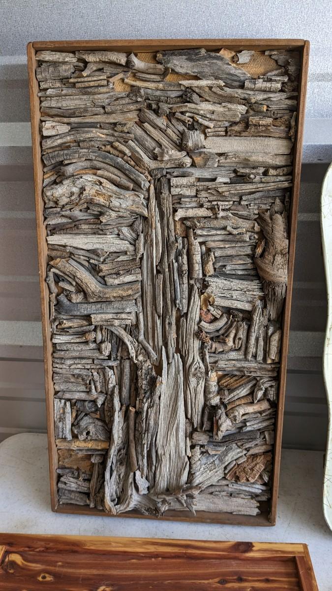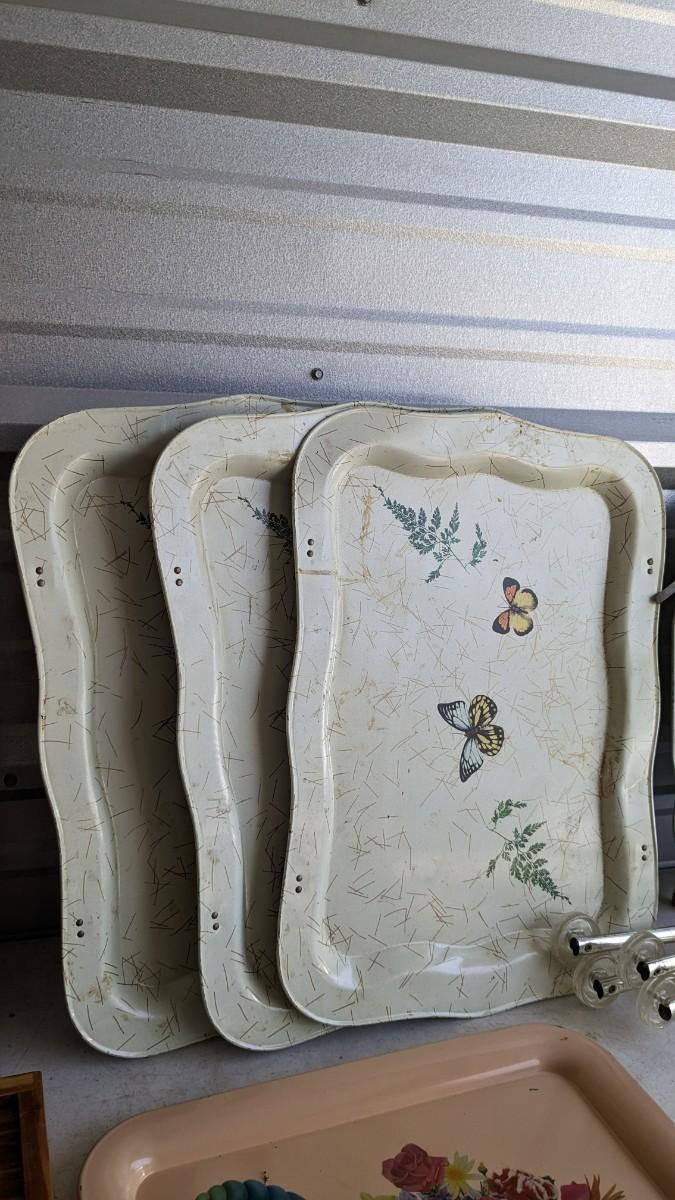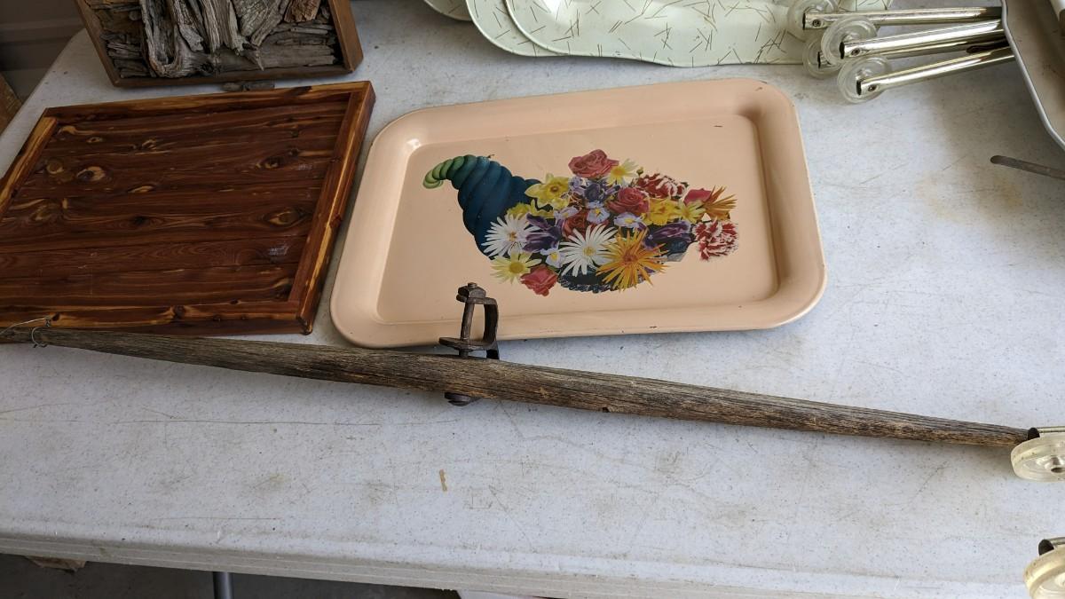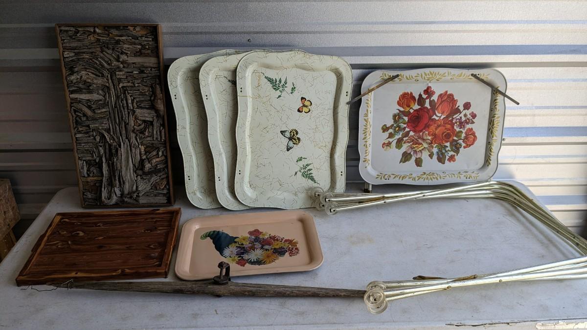 a nice little array of vintage trays and a beautiful found art piece that would be perfect to pour epoxy on and turn into a tray, note some missing pieces on this one. No shipping. 2604