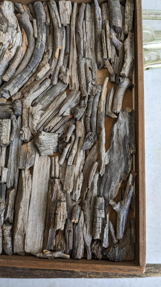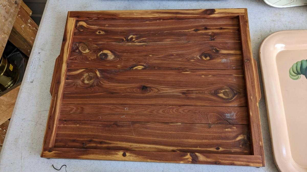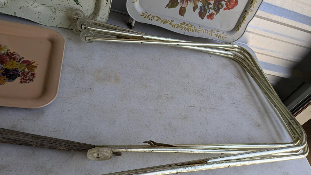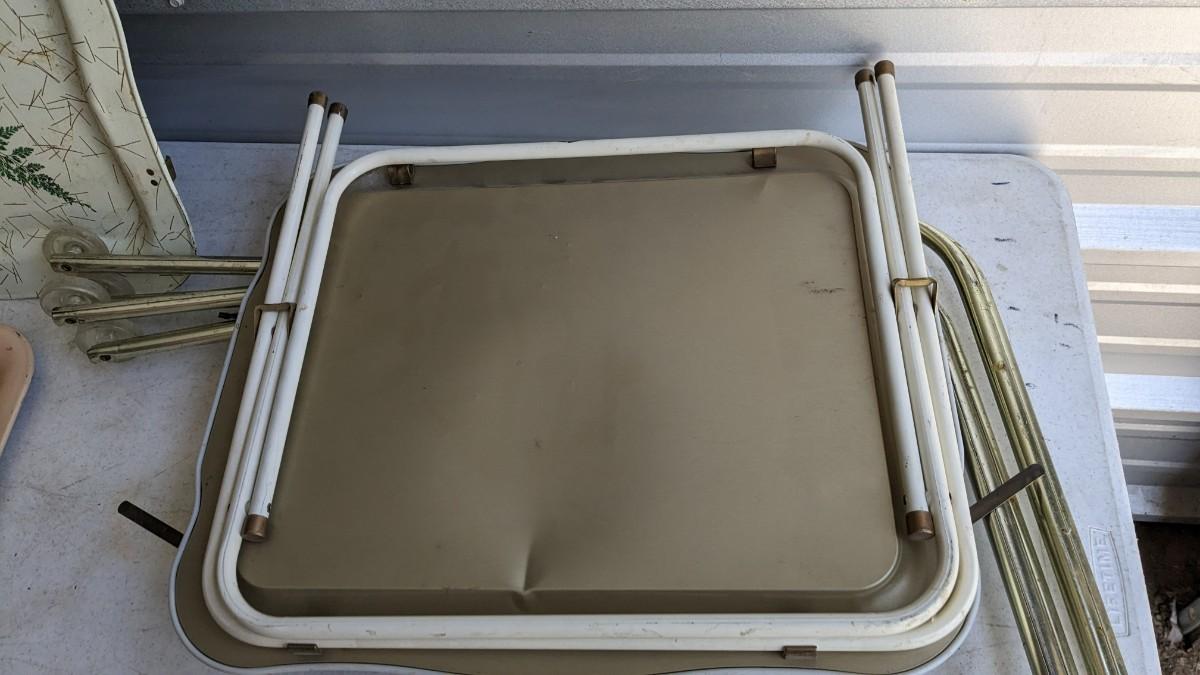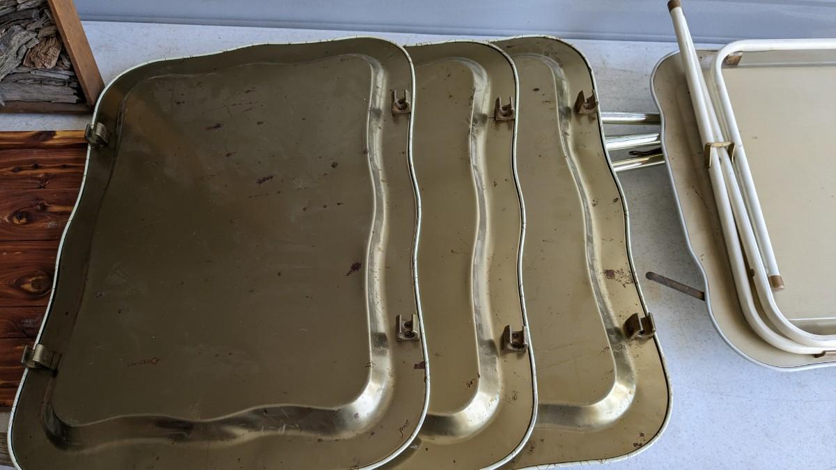 a nice little array of vintage trays and a beautiful found art piece that would be perfect to pour epoxy on and turn into a tray, note some missing pieces on this one. No shipping. 2604