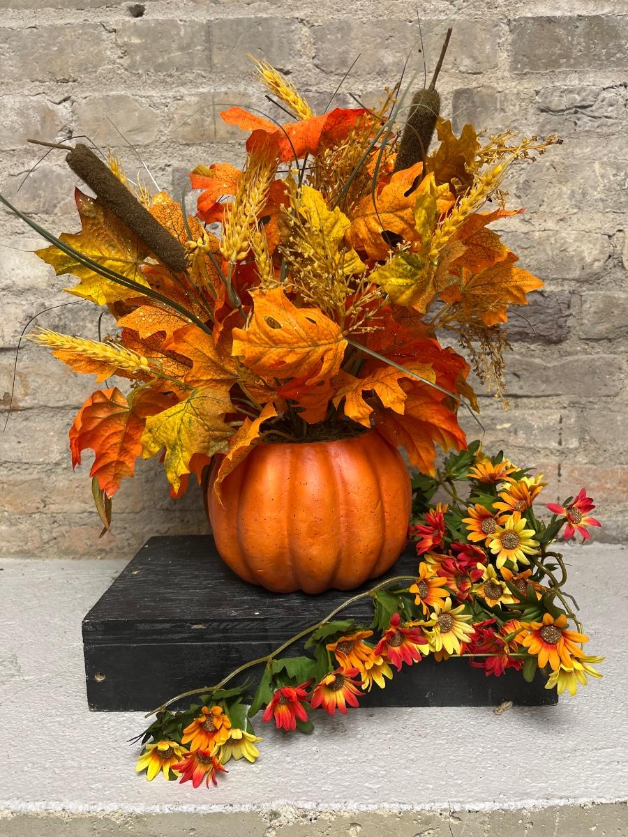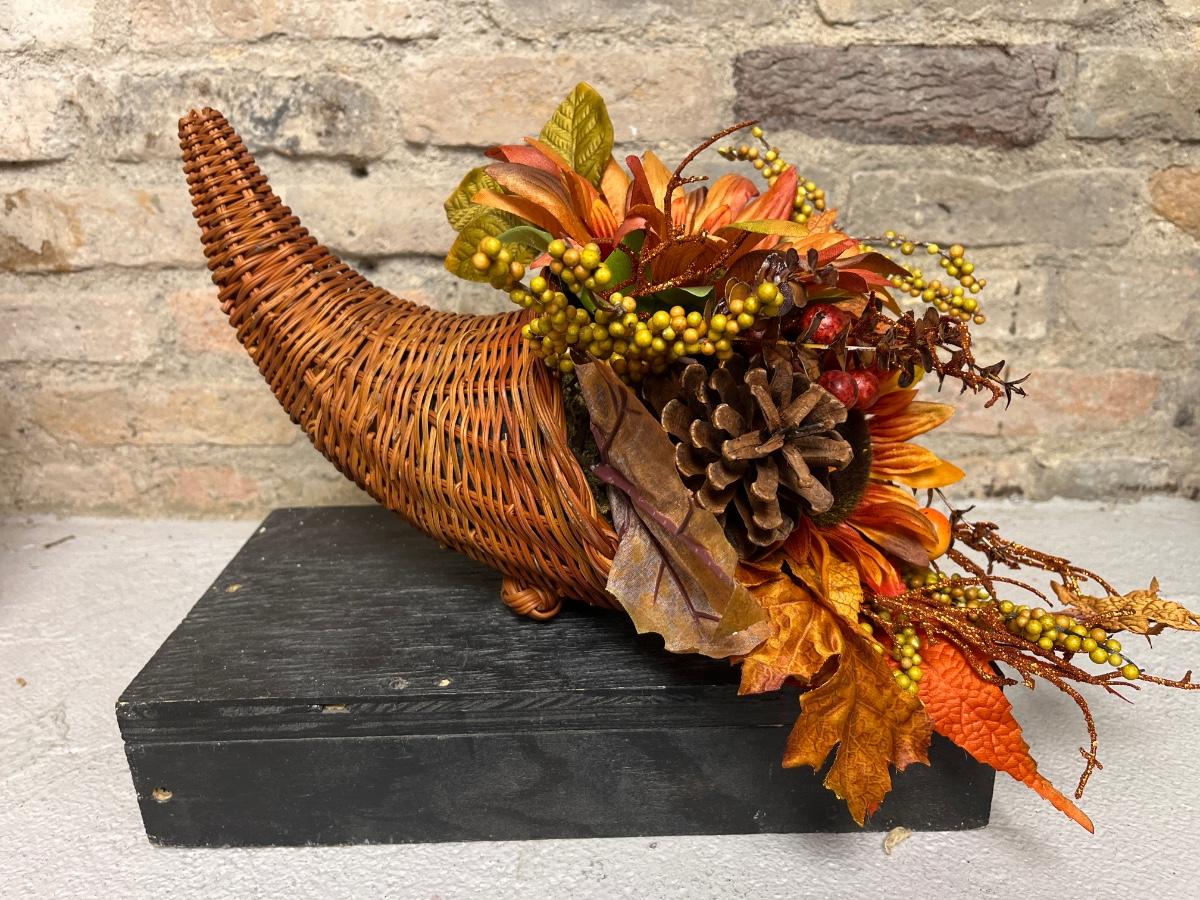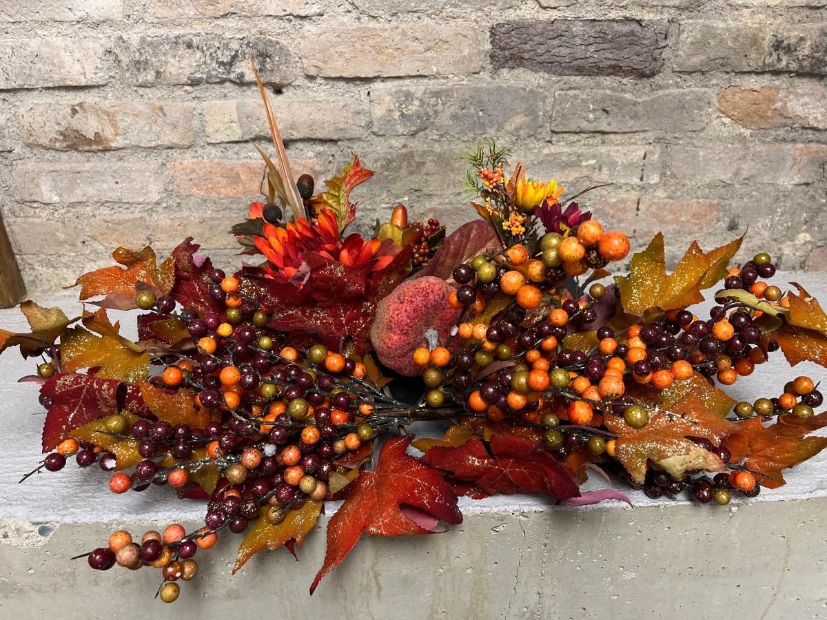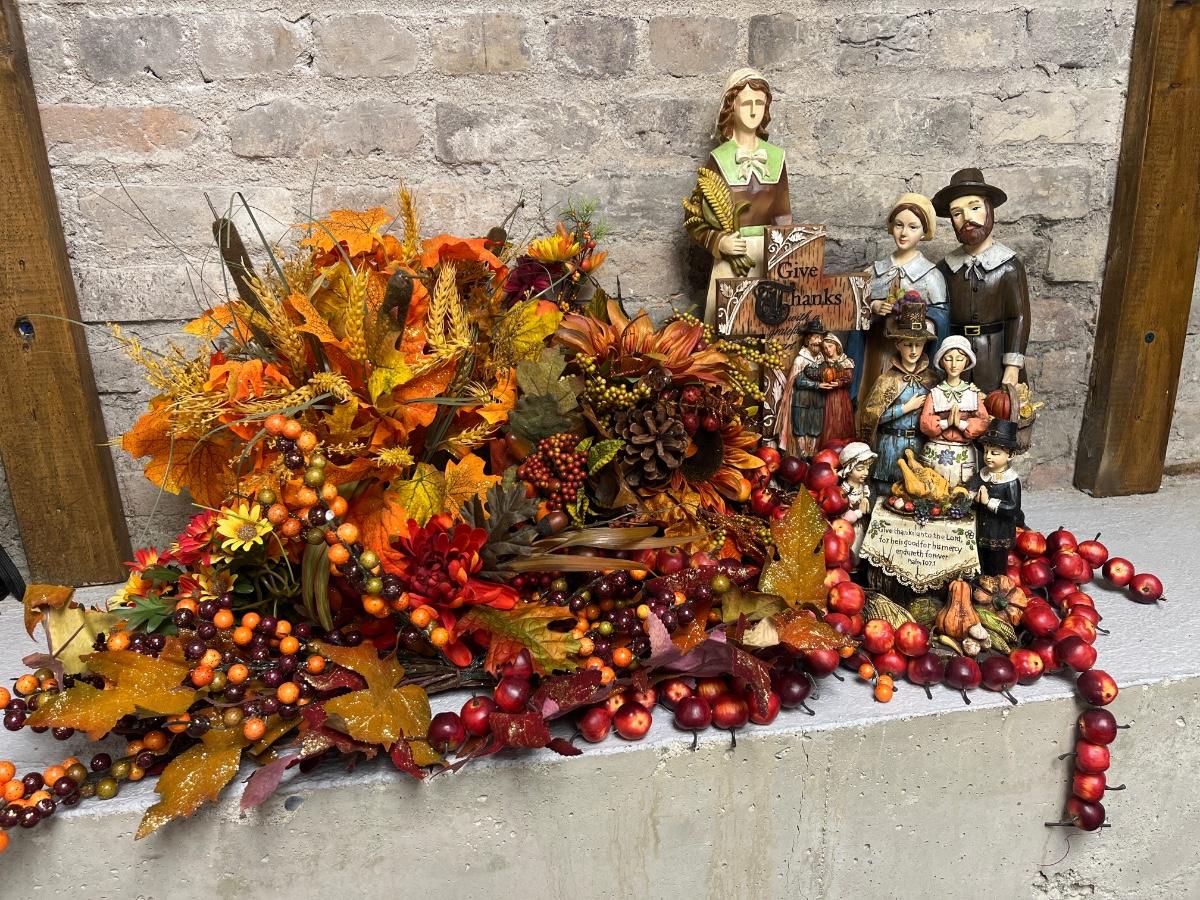 Tons of Fall/Thanksgiving decor. Figurines, cornucopia, pumpkin floral arrangement, two 6’ apple garlands, sprays, etc.