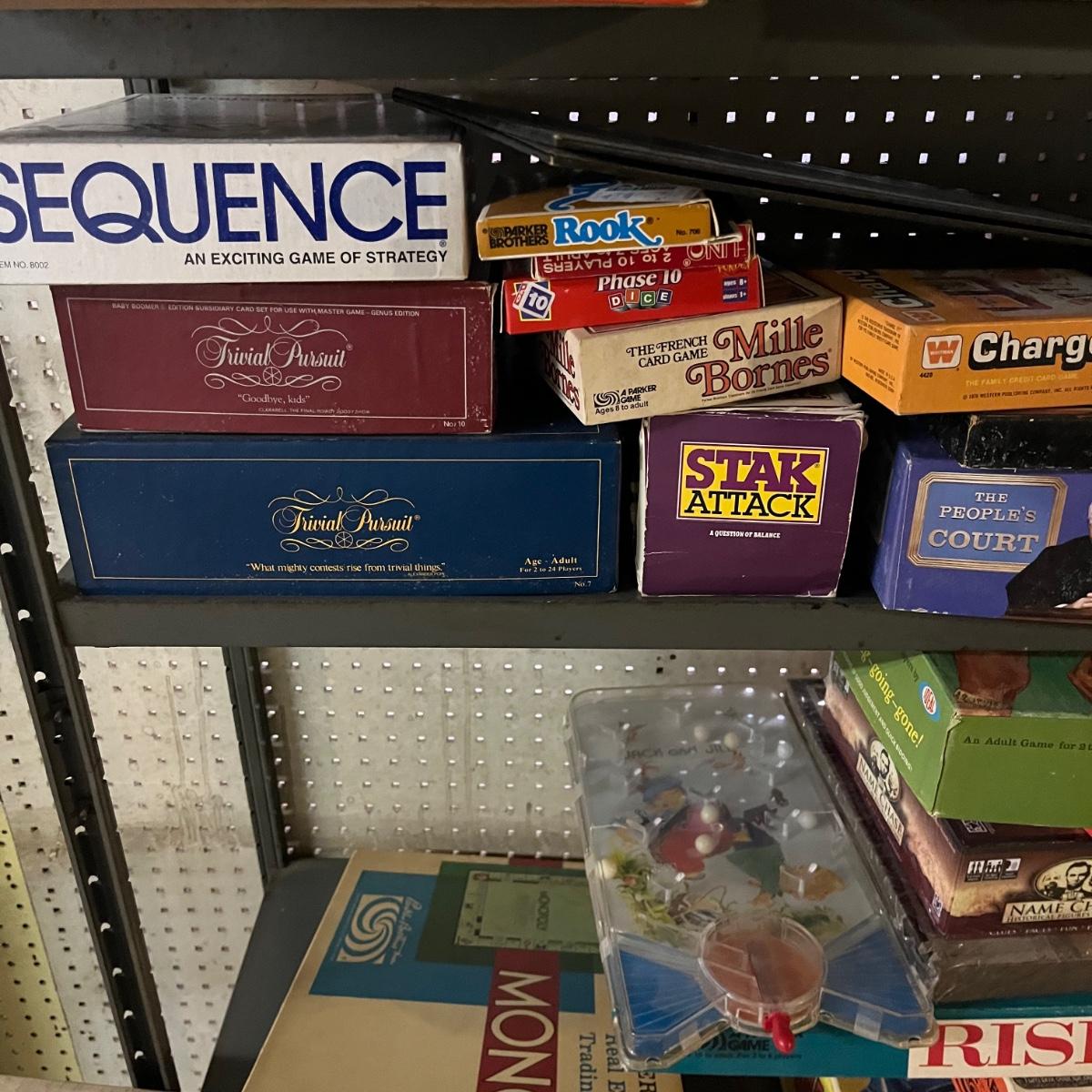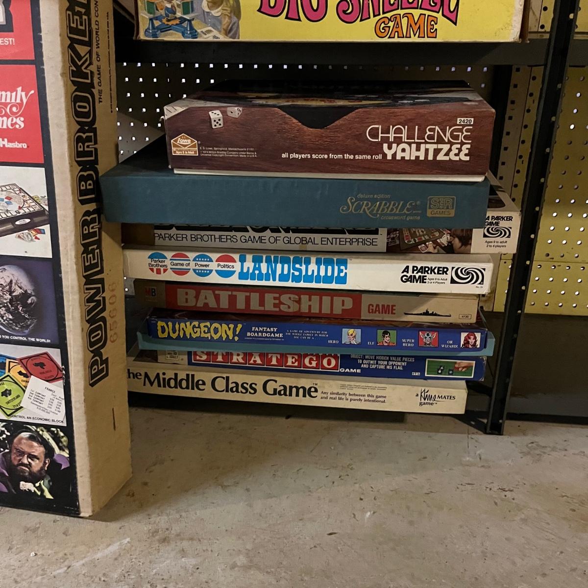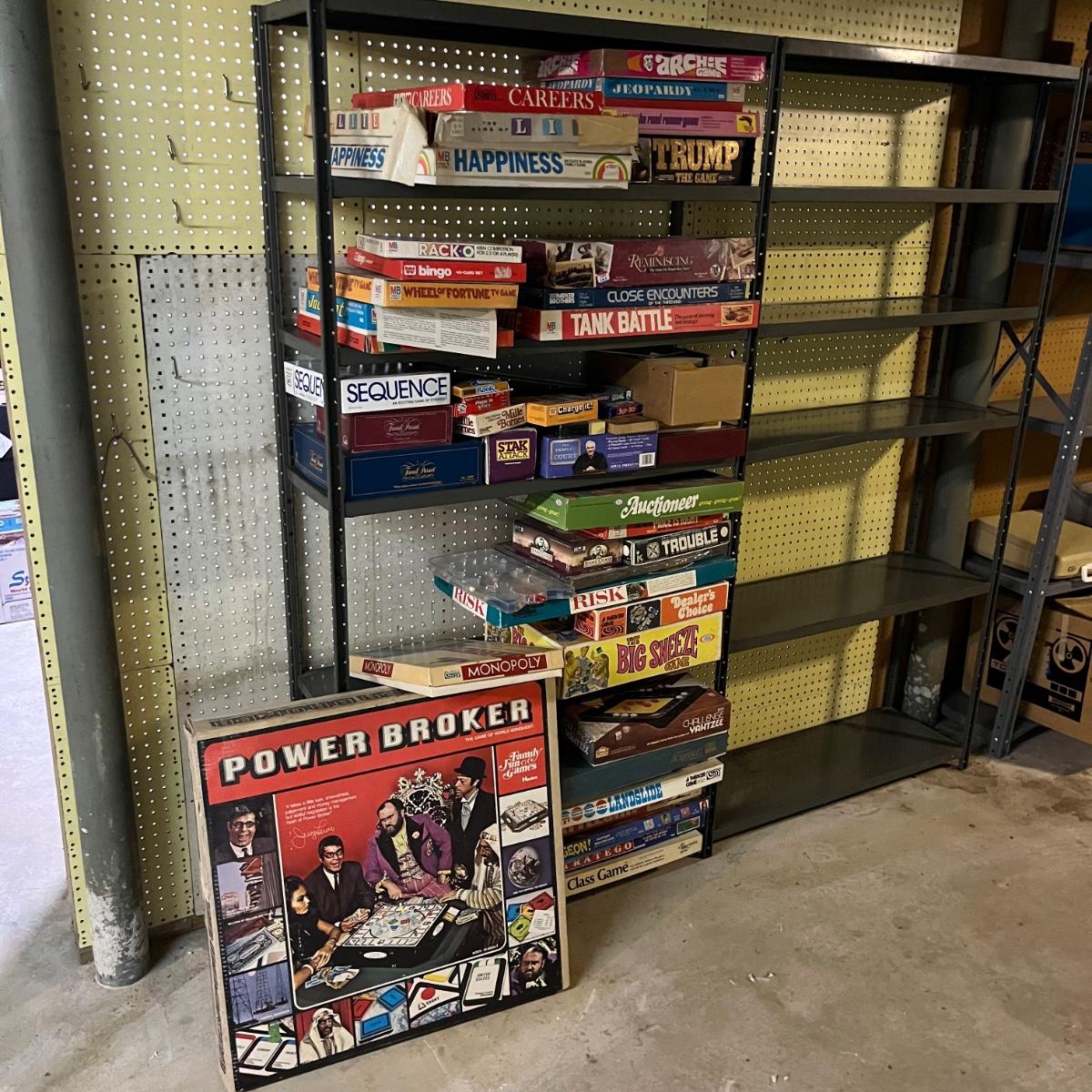 Lot contains a plethora of board games including Monopoly, Trump, Power Broker, Battleship, Trivial Pursuit and many more. Shelf not included but available later in sale.